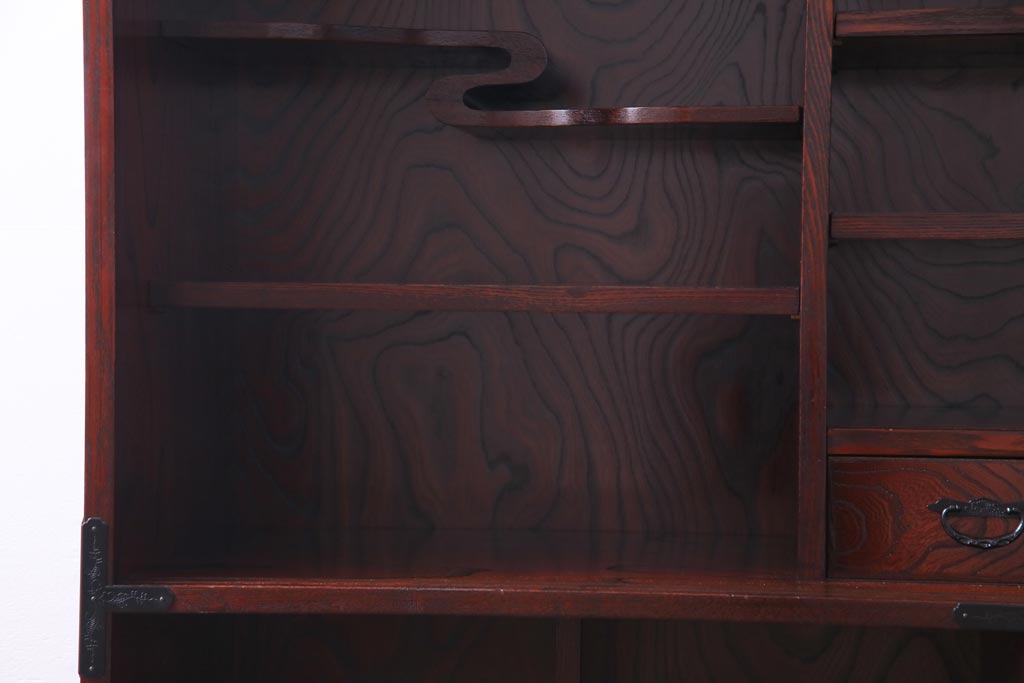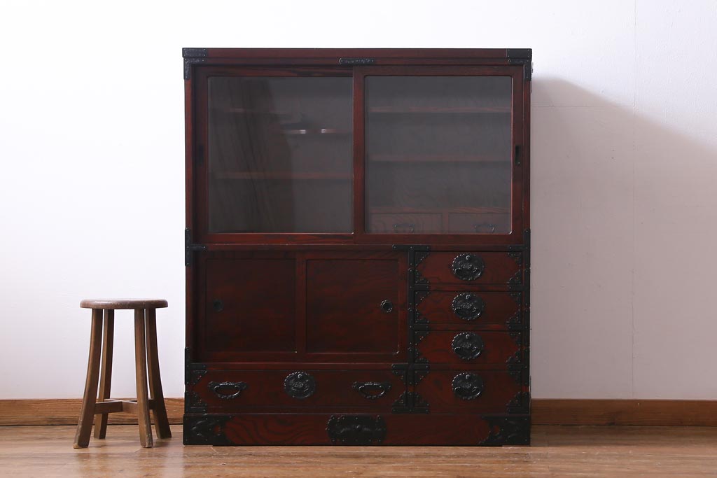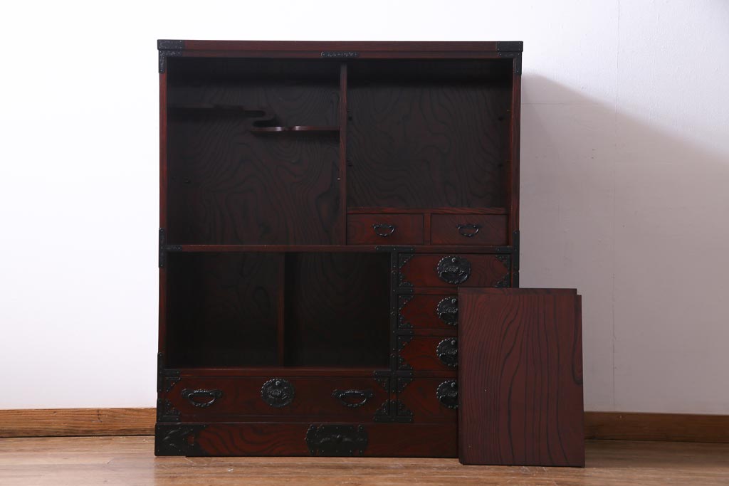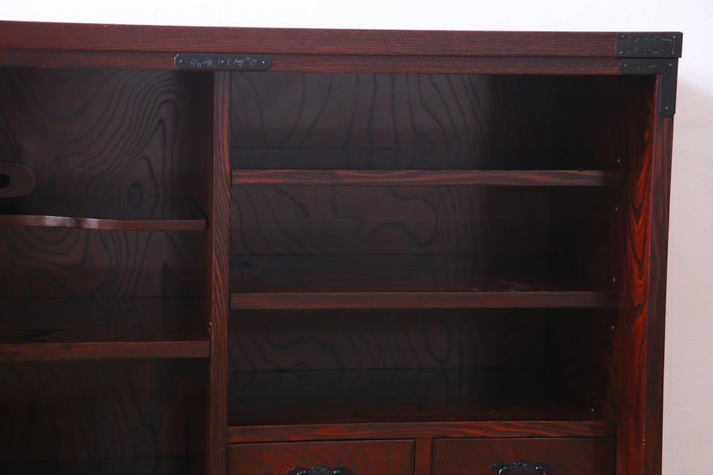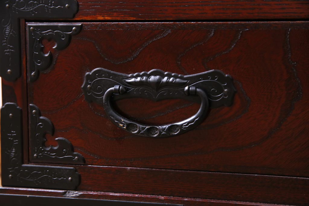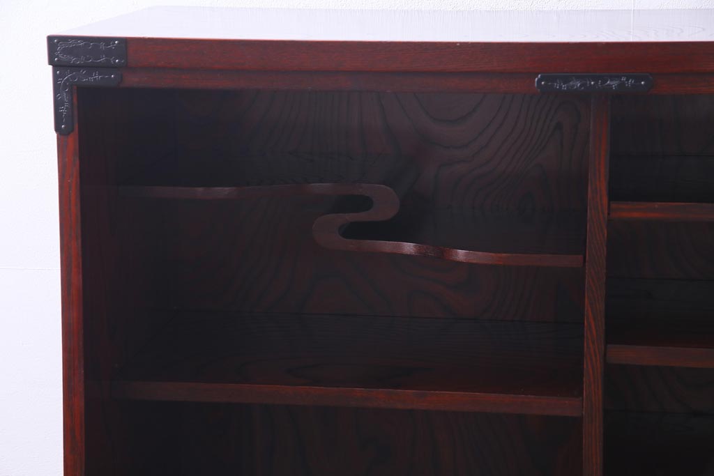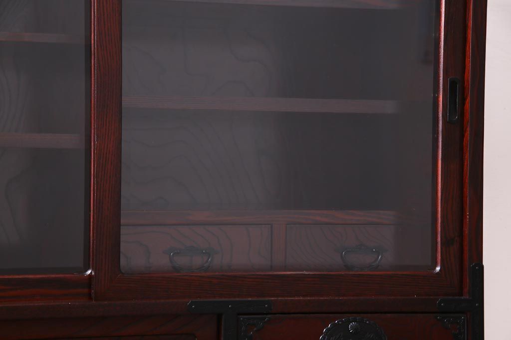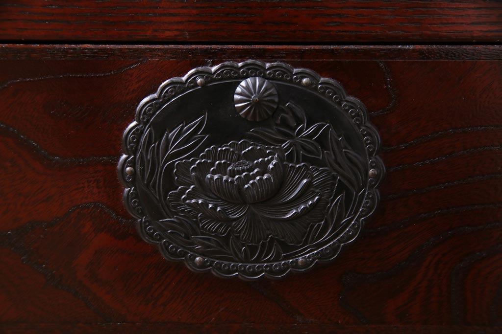 ラフジュ工房> 和箪笥 > 中古 仙台民芸箪笥(仙台箪笥) 欅産業 拭き漆塗り 華やかな金具の茶箪笥(茶棚、飾り棚)