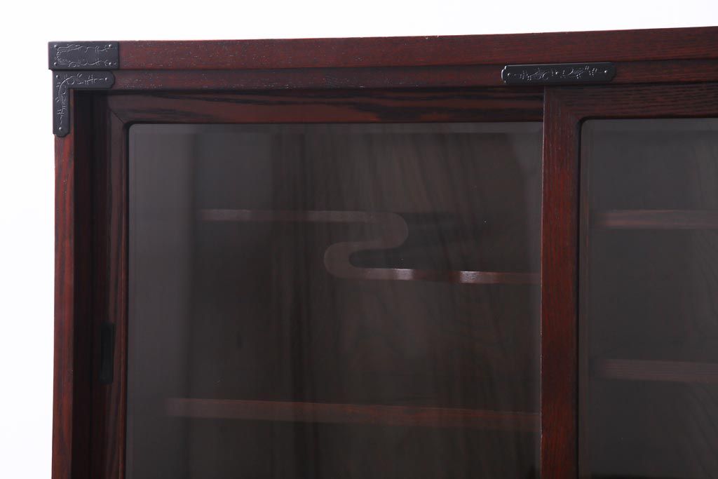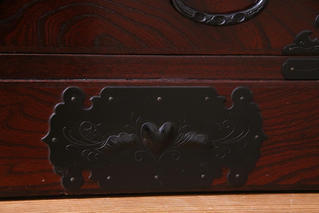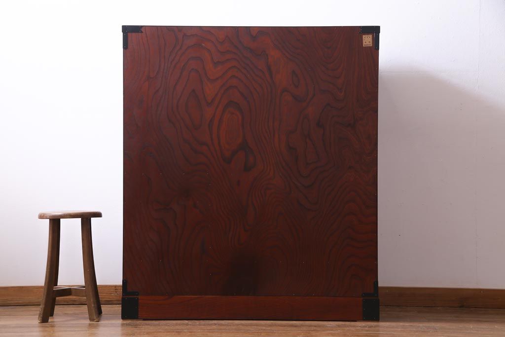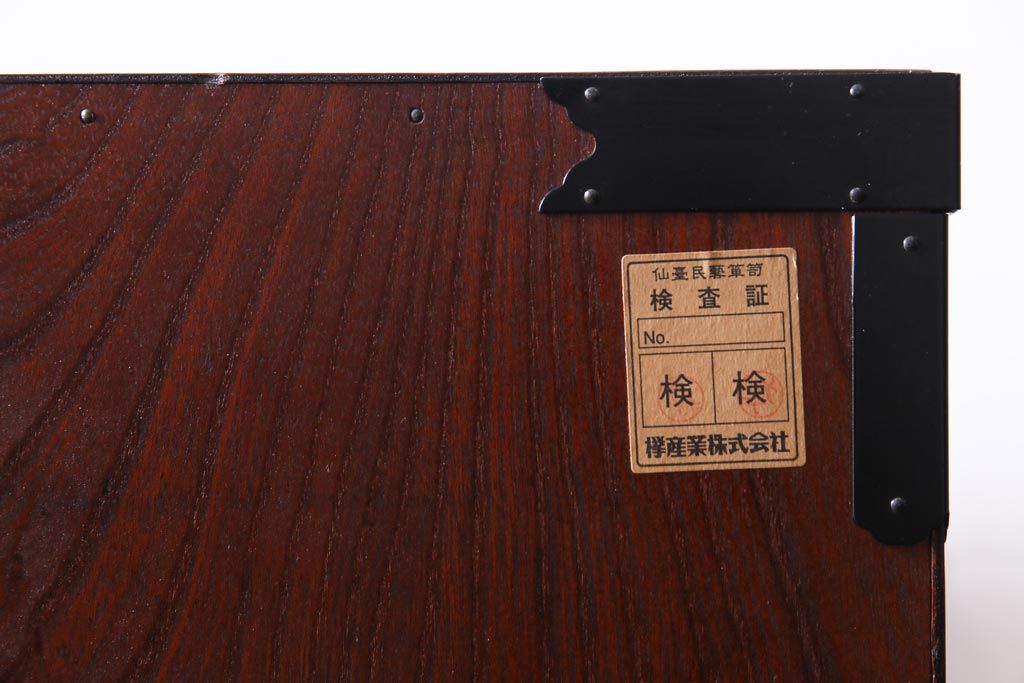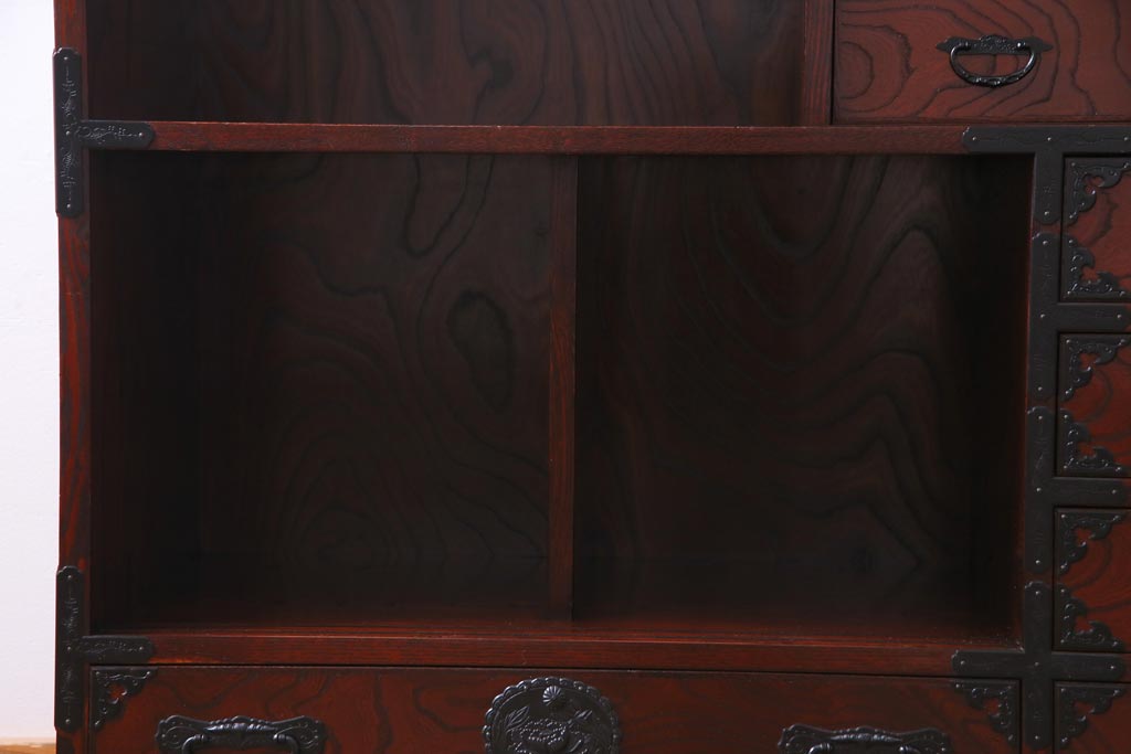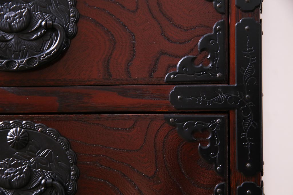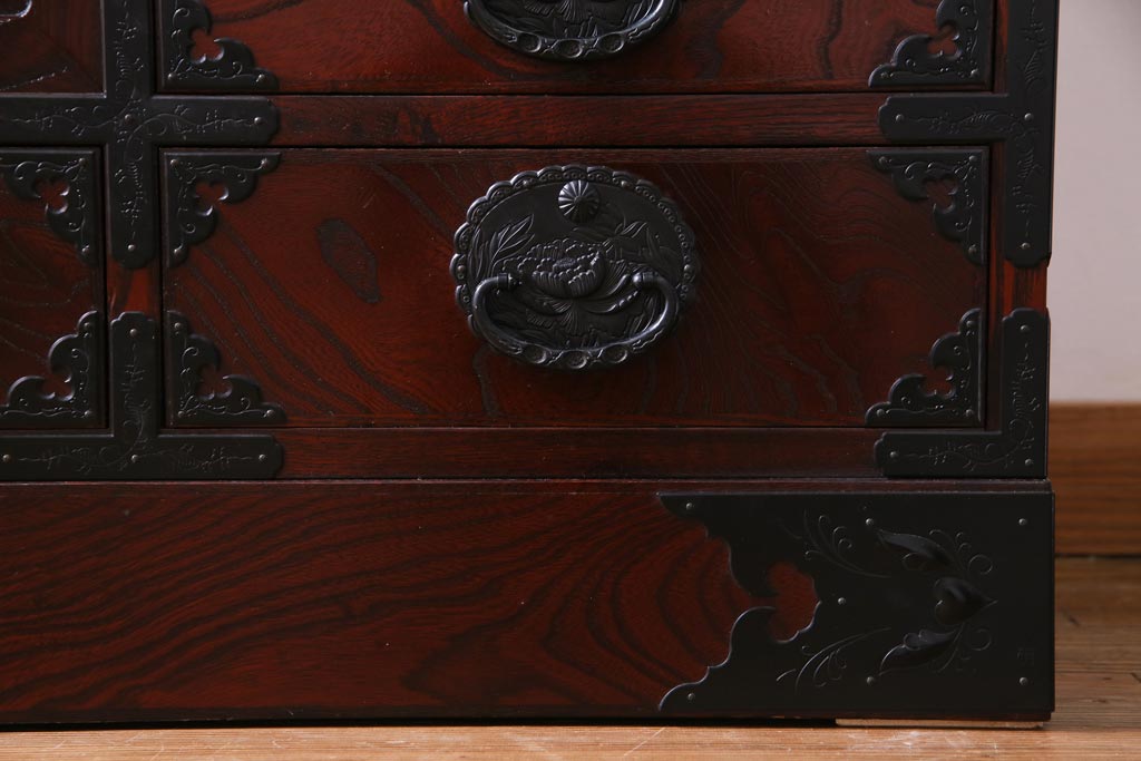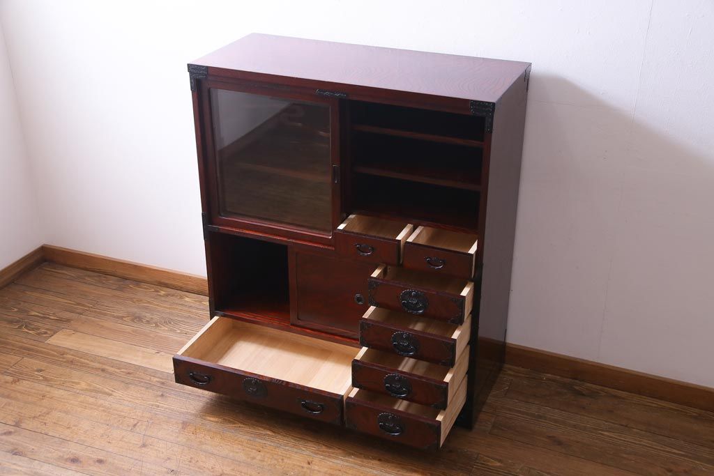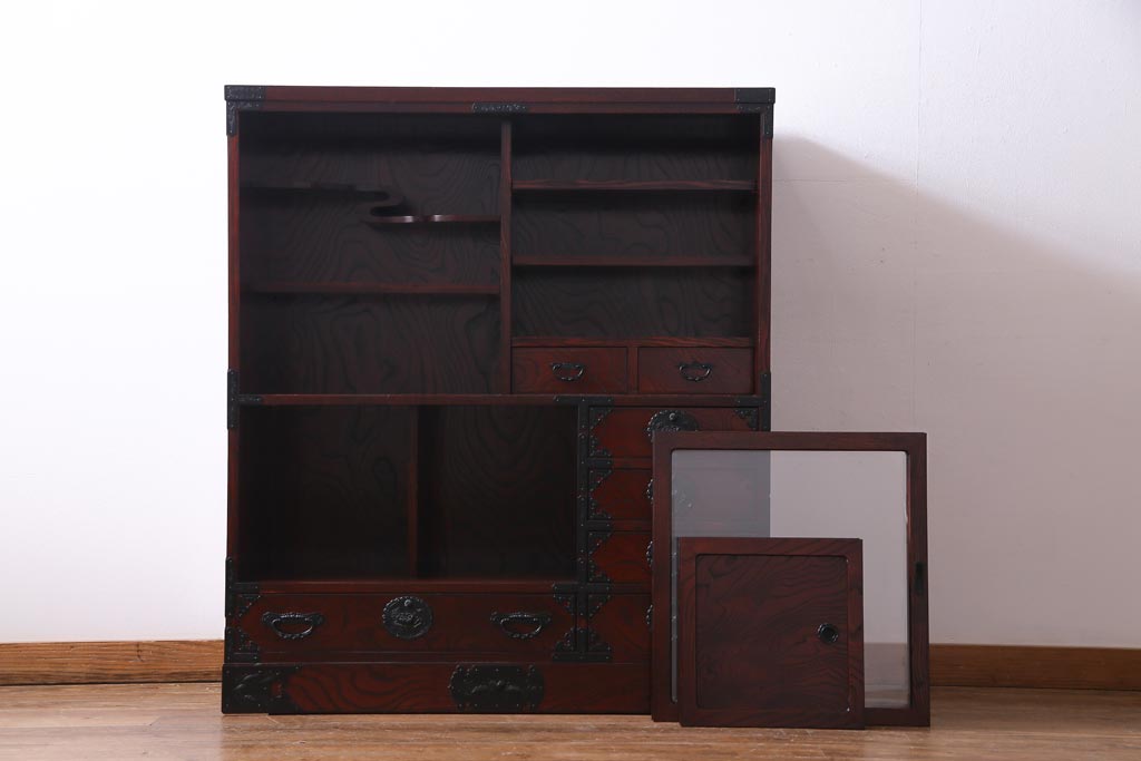 ラフジュ工房> 和箪笥 > 中古 仙台民芸箪笥(仙台箪笥) 欅産業 拭き漆塗り 華やかな金具の茶箪笥(茶棚、飾り棚)
