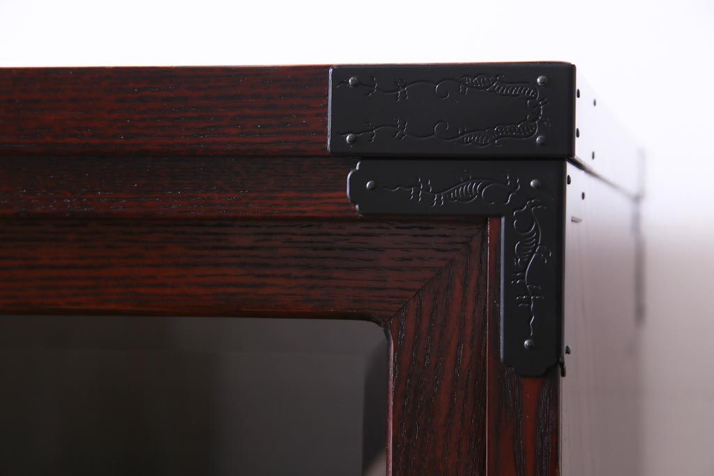 ラフジュ工房> 和箪笥> 水屋箪笥 > 中古 仙台民芸箪笥(仙台箪笥) 欅産業 拭き漆塗り 華やかな金具の茶箪笥(茶棚、飾り棚)