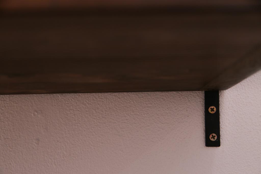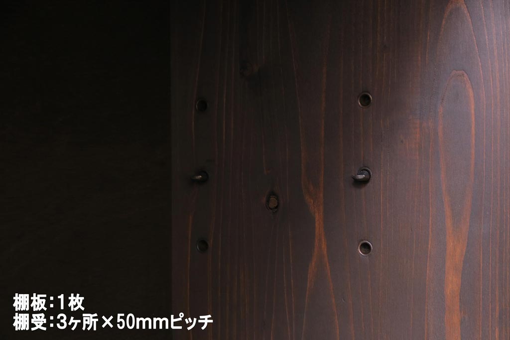 棚板は取り外しできます。棚板は1枚あります。棚受けは3ヶ所、50mmピッチで調整できます。棚幅サイズのものが1枚の作りです。