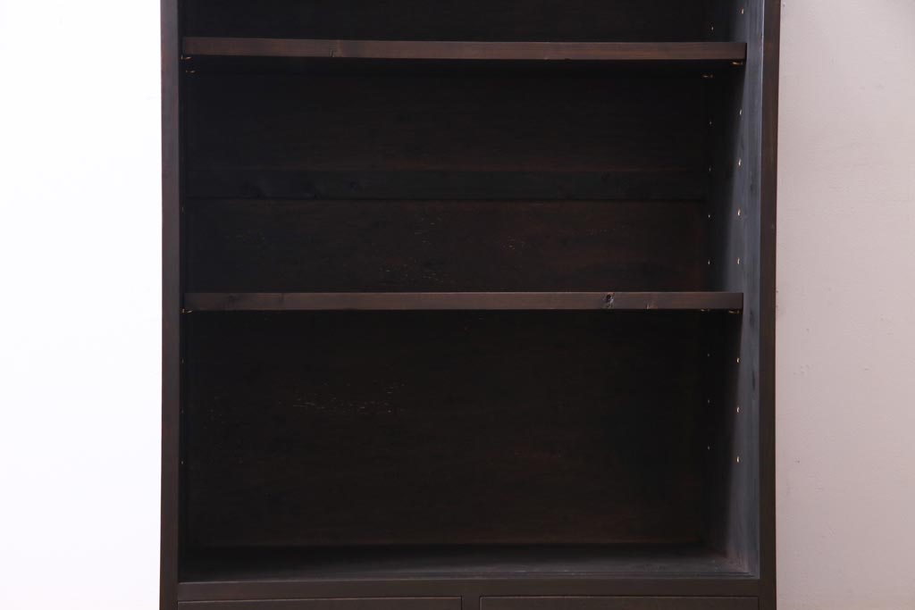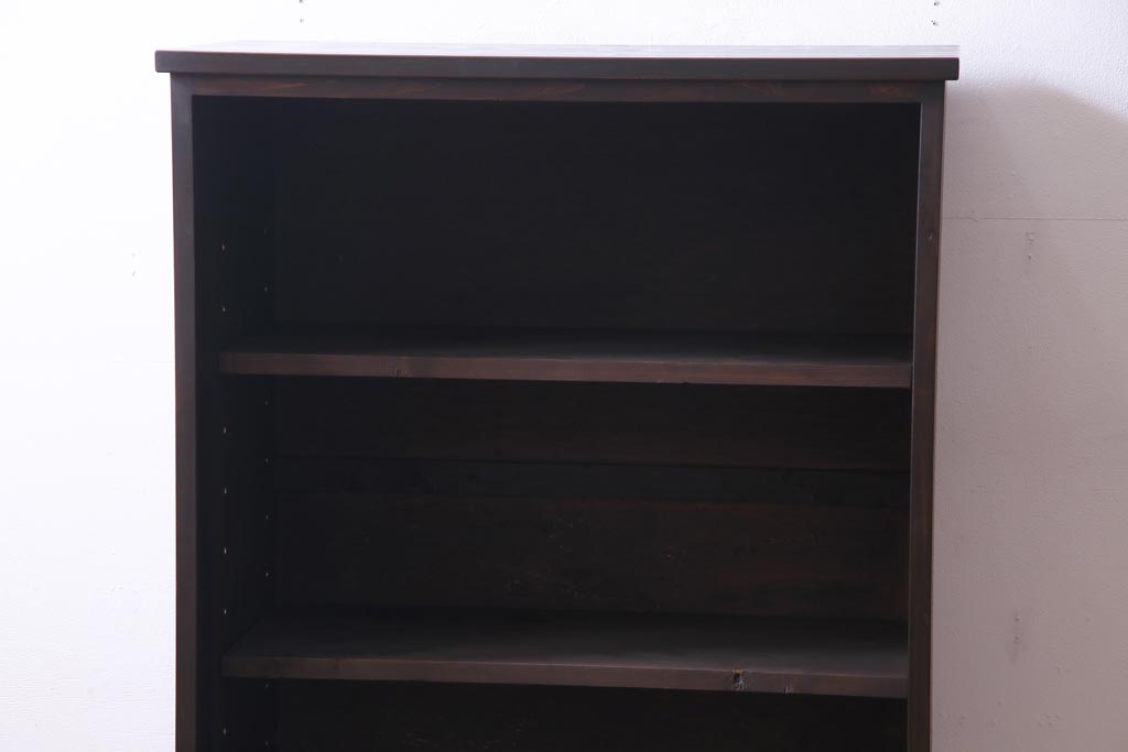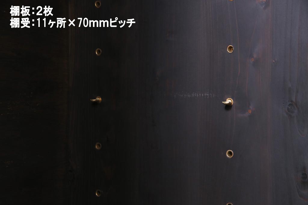 棚板は取り外しできます。棚板は2枚あります。棚受けは11ヶ所、70mmピッチで調整できます。棚幅サイズのものが1枚の作りです。