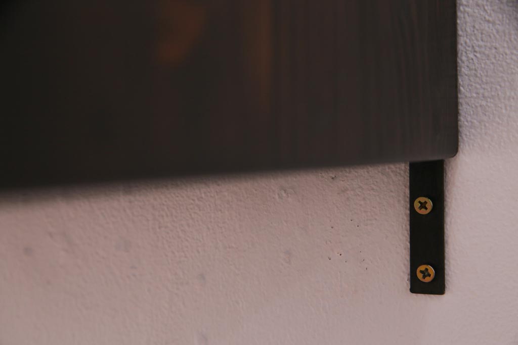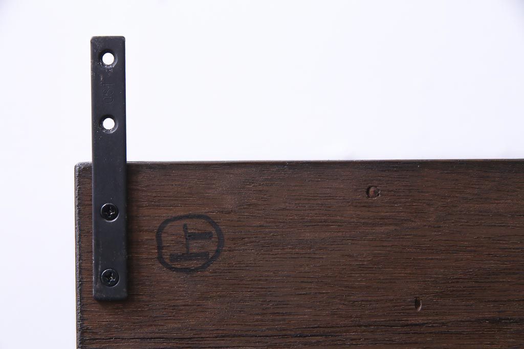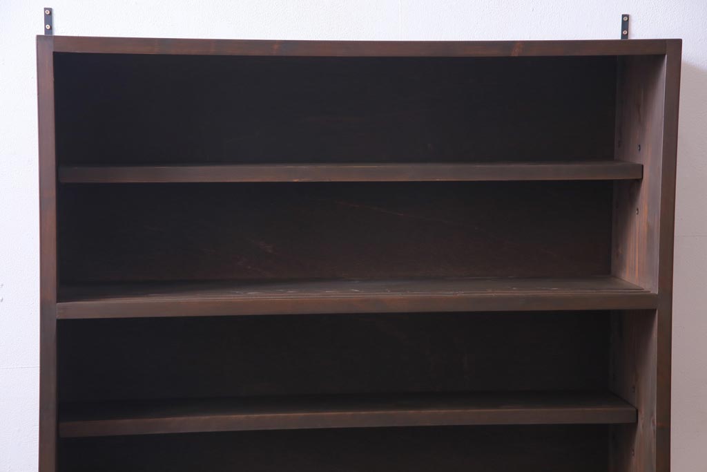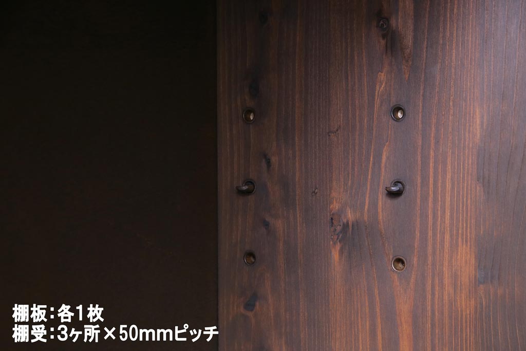 棚板は取り外しできます。棚板は1枚あります。棚受けは3ヶ所、50mmピッチで調整できます。棚幅サイズのものが1枚の作りです。