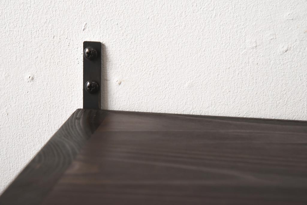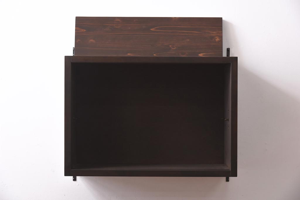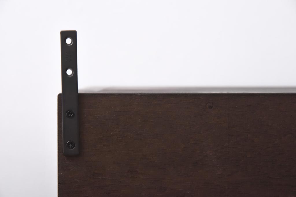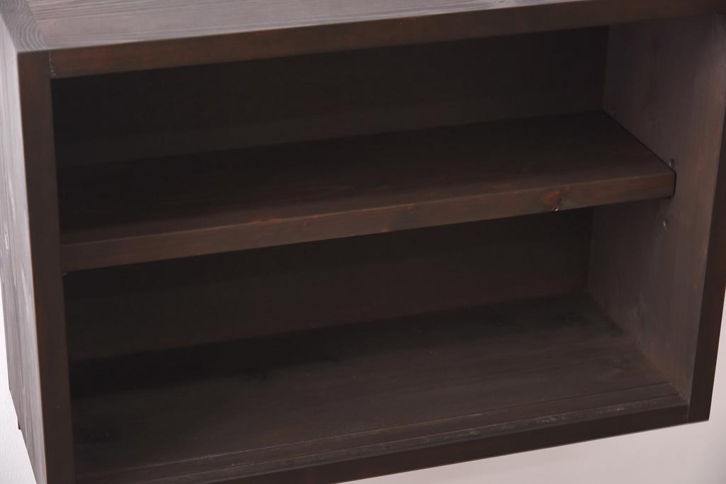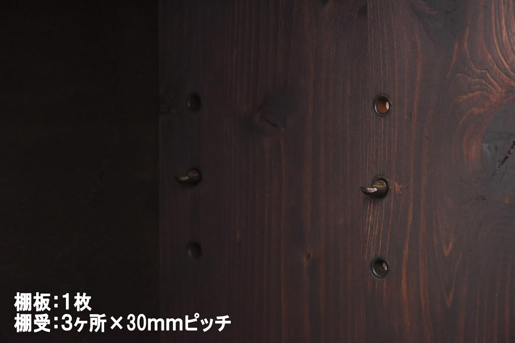 棚板は取り外しできます。棚板は1枚あります。棚受けは3ヶ所、30mmピッチで調整できます。棚幅サイズのものが1枚の作りです。