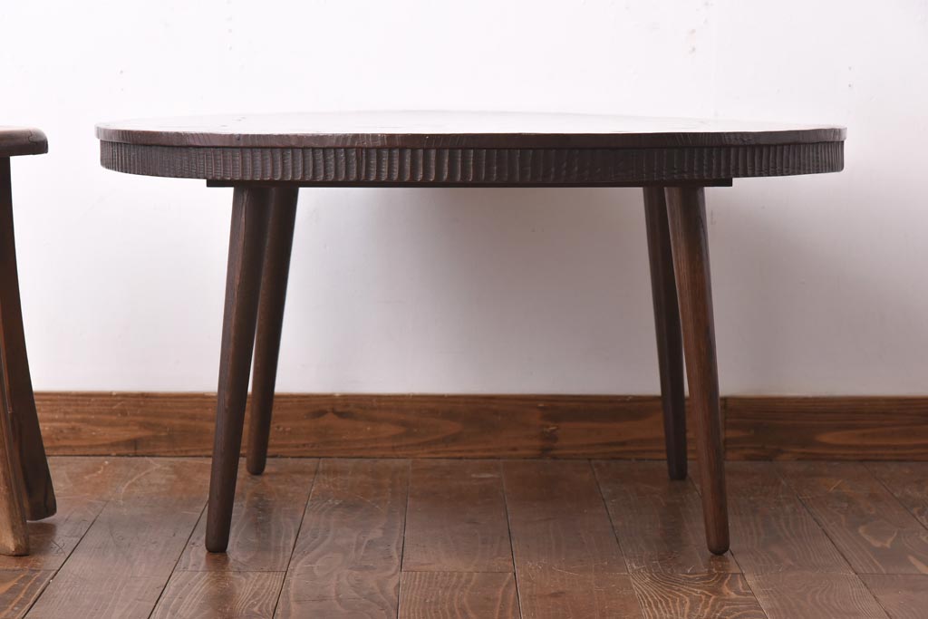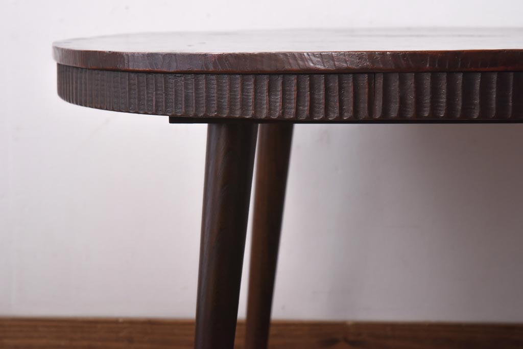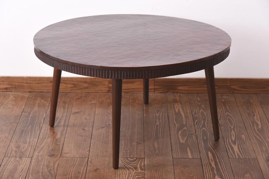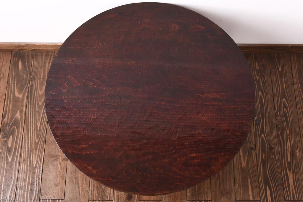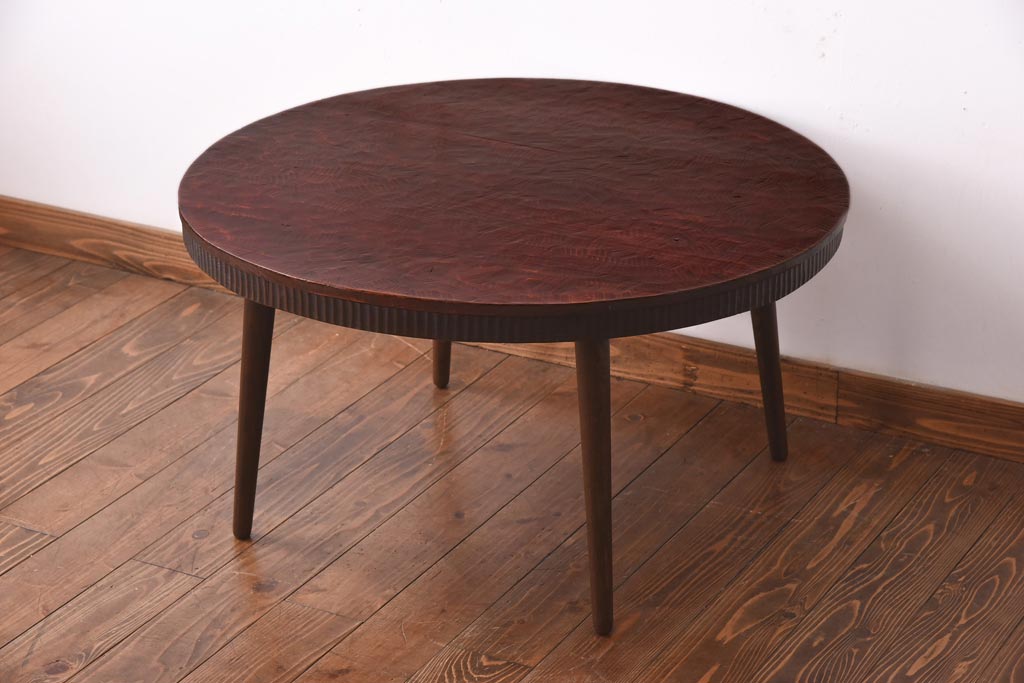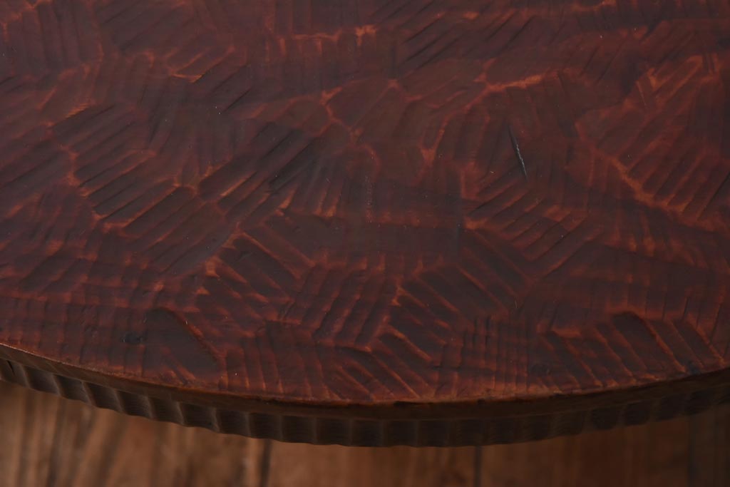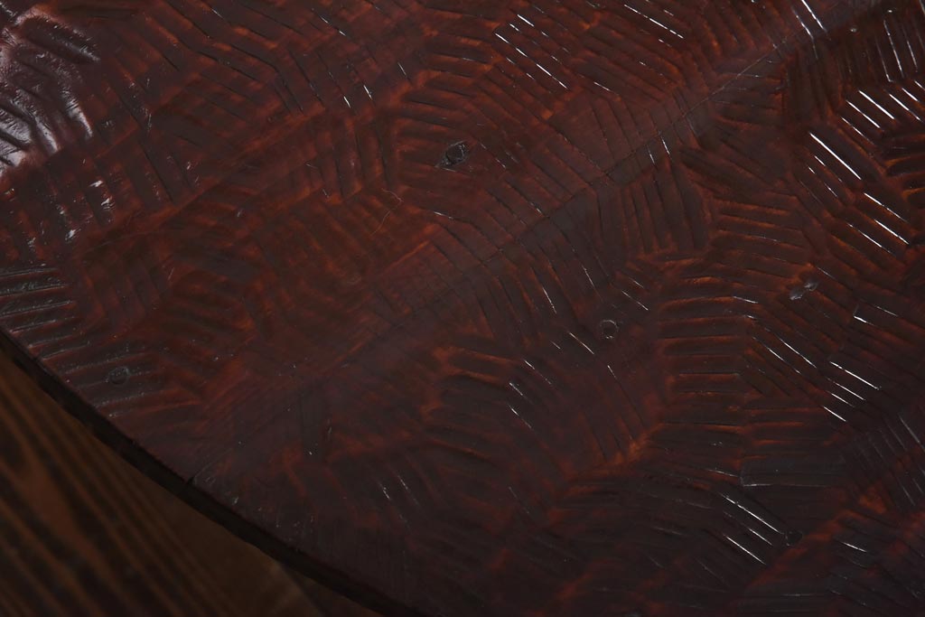 天板の側面にぐるりと一周彫りが施され、和モダンな雰囲気溢れるちゃぶ台です。デザイン性のある古い天板はそのままに、傷みのあった脚を取り外し、当店で新しい脚を取り付け、きちんとお使いいただけるようリメイクしました。天板の表面にはノミの跡を活かした細かな彫りが施されており、凝った意匠が楽しめます。赤味を帯びた漆塗りの天板は、しっとりとした上品な光沢に仕上がっています。和室のちゃぶ台としてはもちろんのこと、和モダンテイストのサイドテーブルや飾り台としてもおすすめのお品です。こだわりの空間作りにいかがでしょうか。