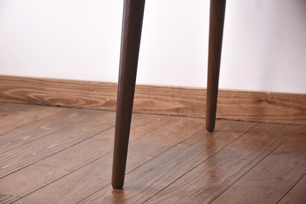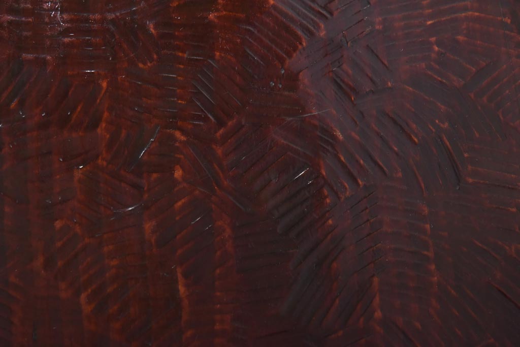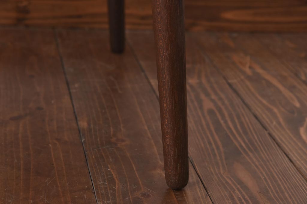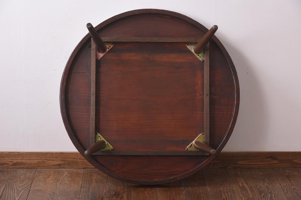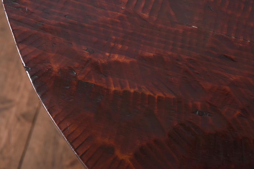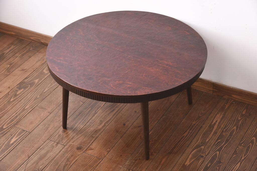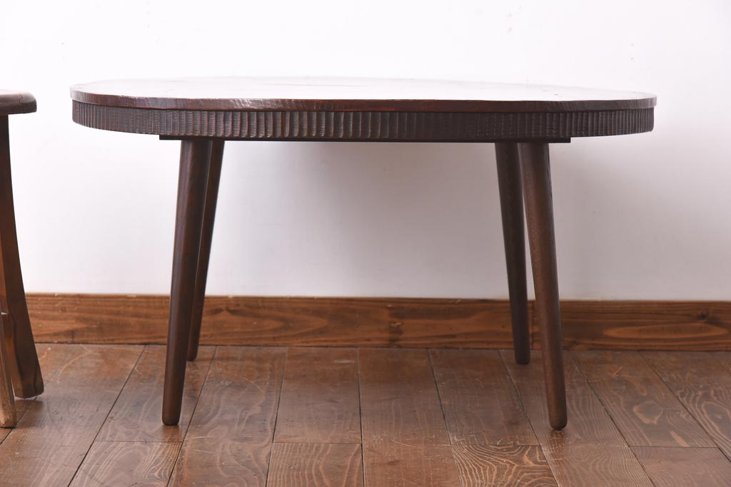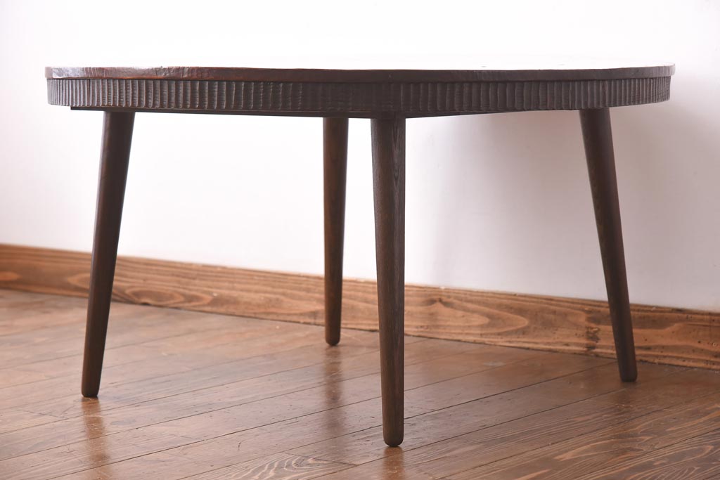 天板の側面にぐるりと一周彫りが施され、和モダンな雰囲気溢れるちゃぶ台です。デザイン性のある古い天板はそのままに、傷みのあった脚を取り外し、当店で新しい脚を取り付け、きちんとお使いいただけるようリメイクしました。天板の表面にはノミの跡を活かした細かな彫りが施されており、凝った意匠が楽しめます。赤味を帯びた漆塗りの天板は、しっとりとした上品な光沢に仕上がっています。和室のちゃぶ台としてはもちろんのこと、和モダンテイストのサイドテーブルや飾り台としてもおすすめのお品です。こだわりの空間作りにいかがでしょうか。