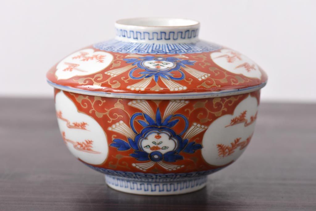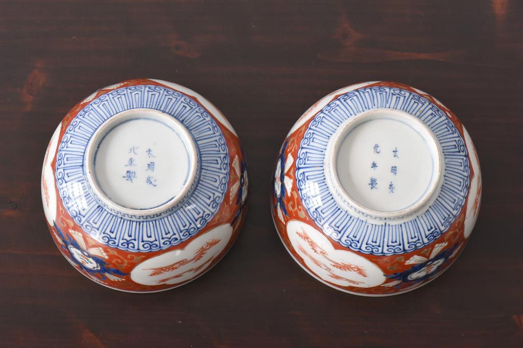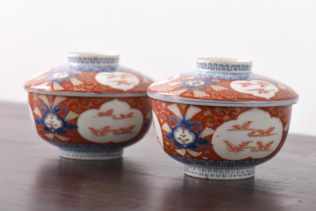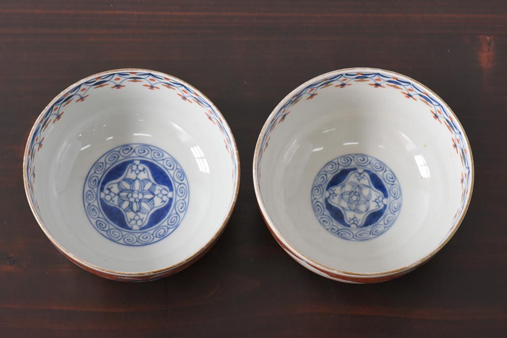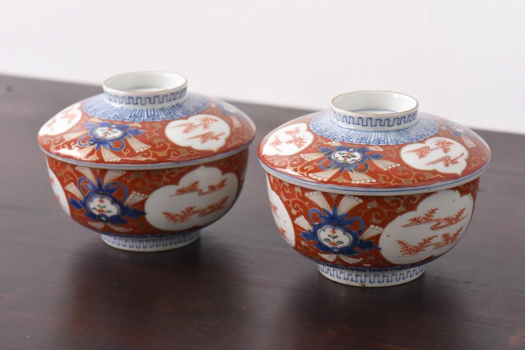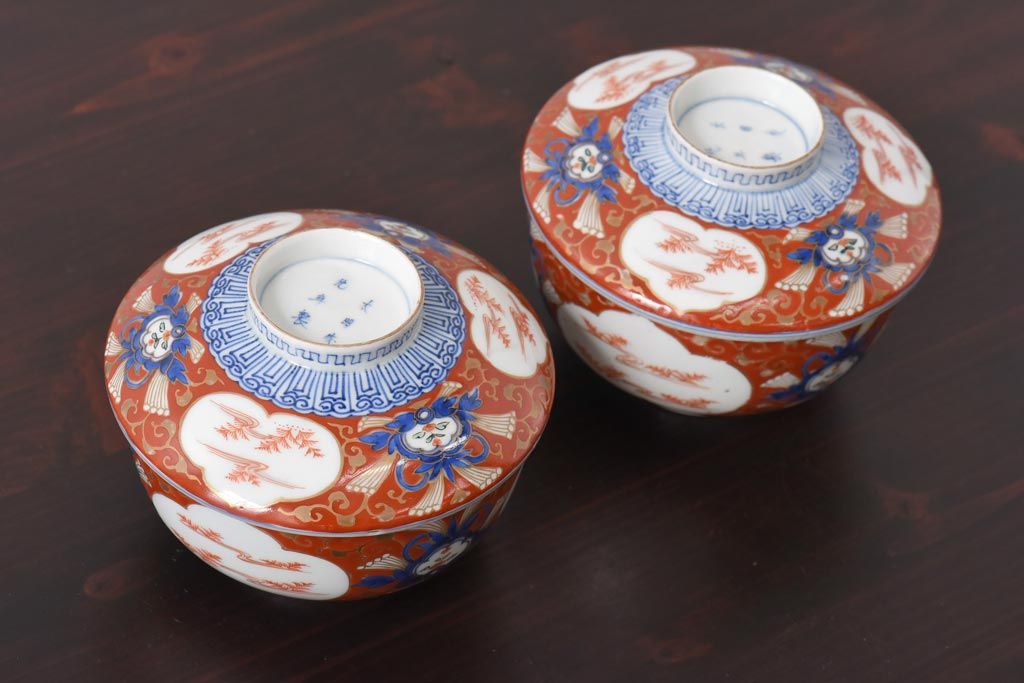 ラフジュ工房> 和食器・茶道具 > 江戸期 大明成化年製 古伊万里 赤絵南蛮図染付 蓋茶碗2個セット(1)