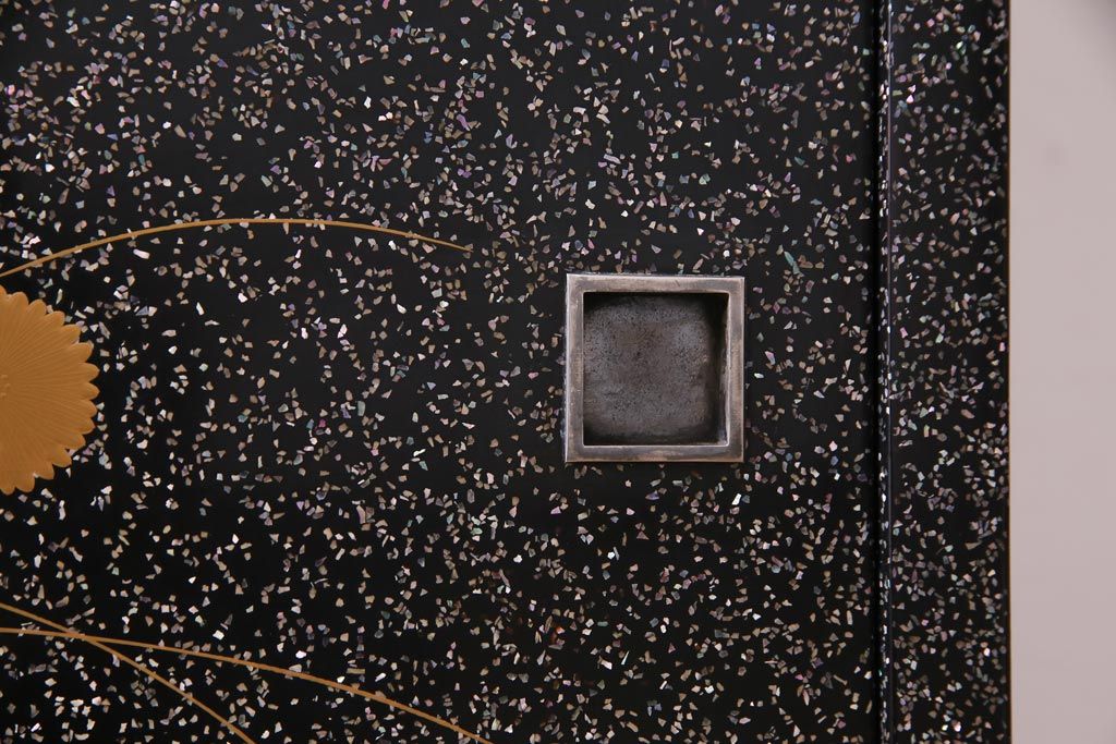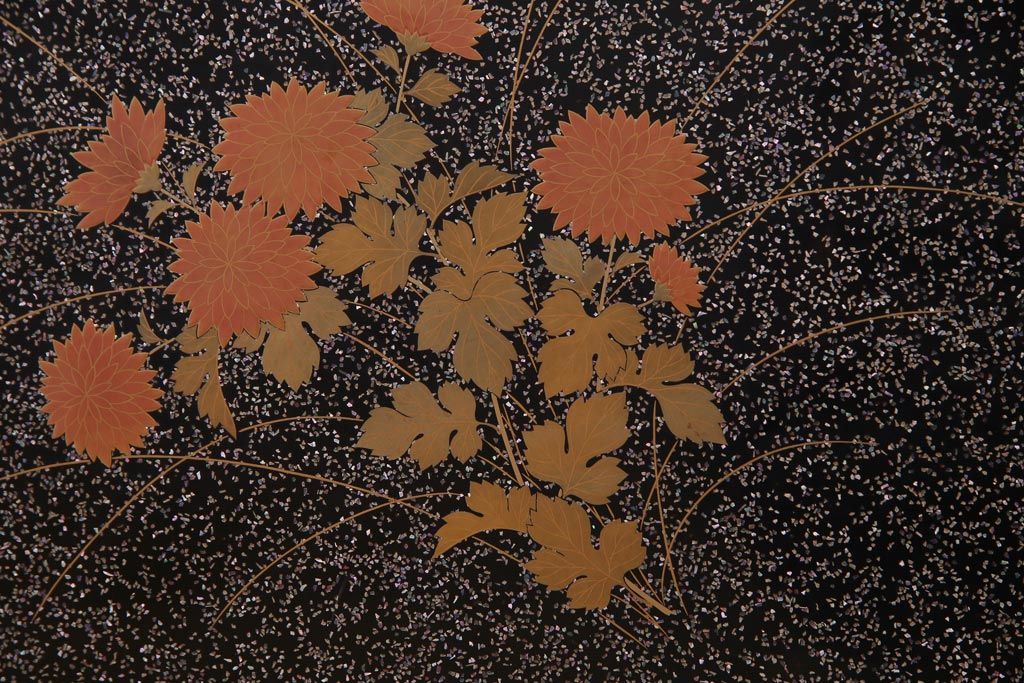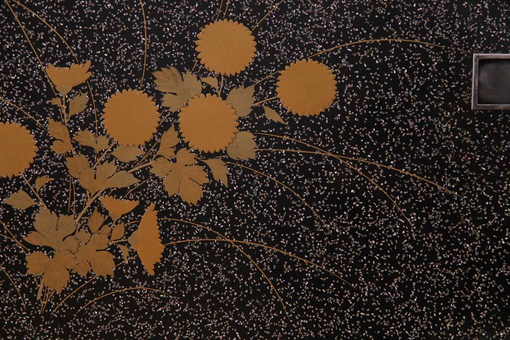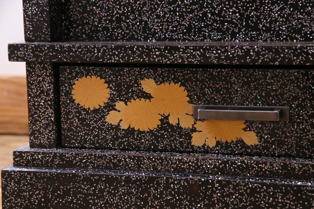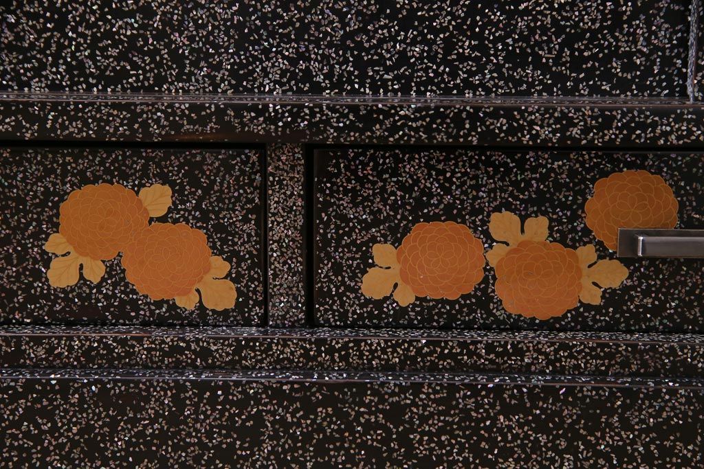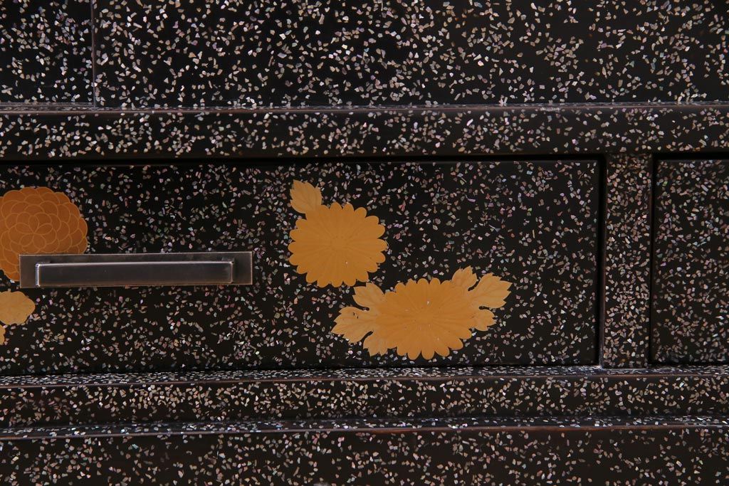 また、その螺鈿に映えるような菊の蒔絵も魅力的で、抽斗1杯毎に2色の菊の配置パターンが違っており、細部にもこだわりを感じます。