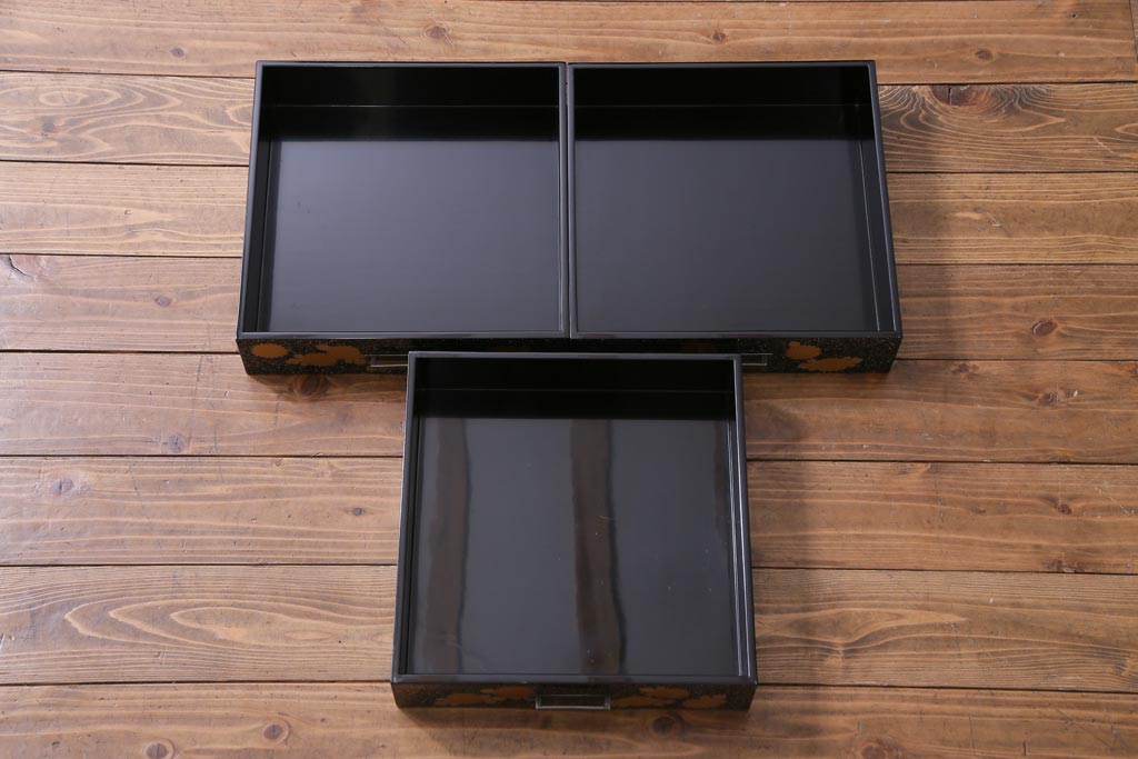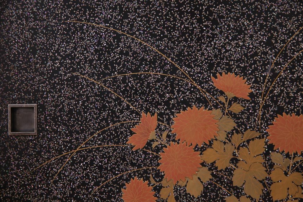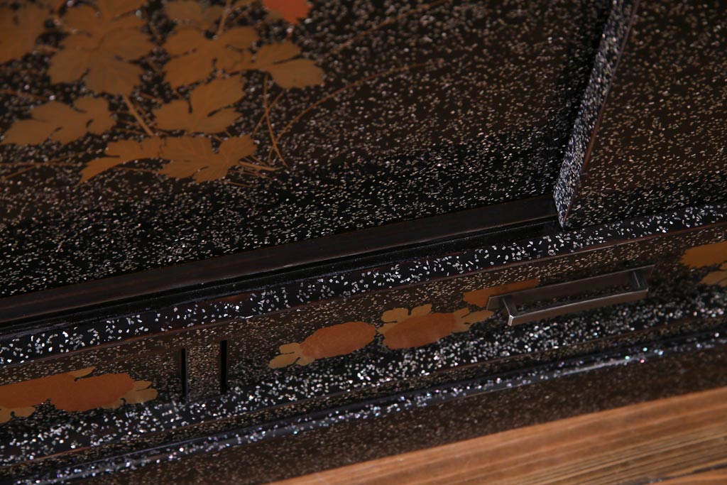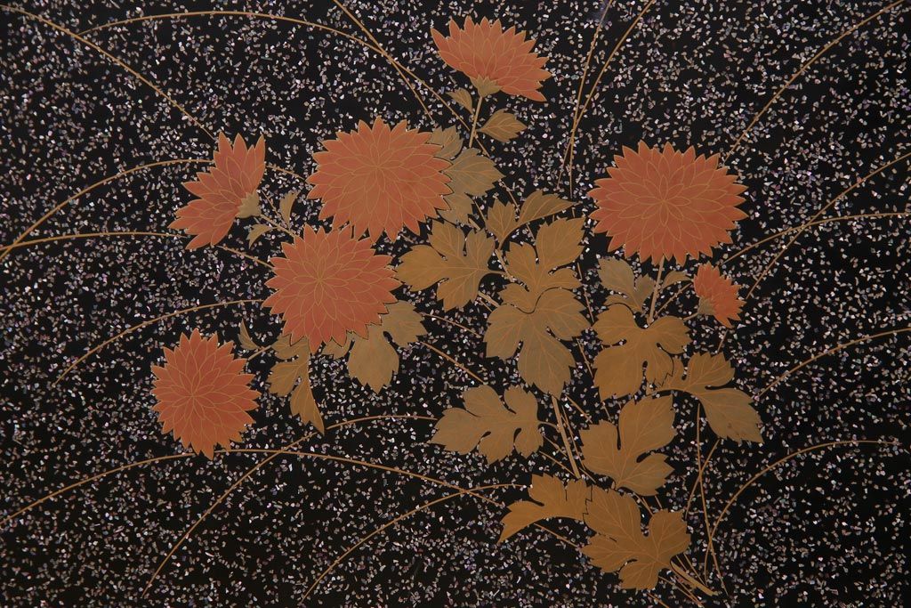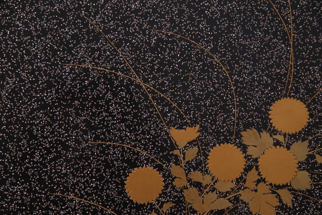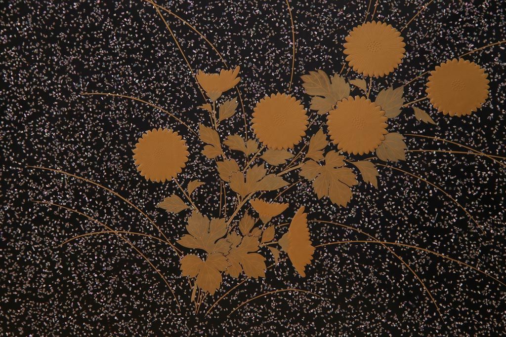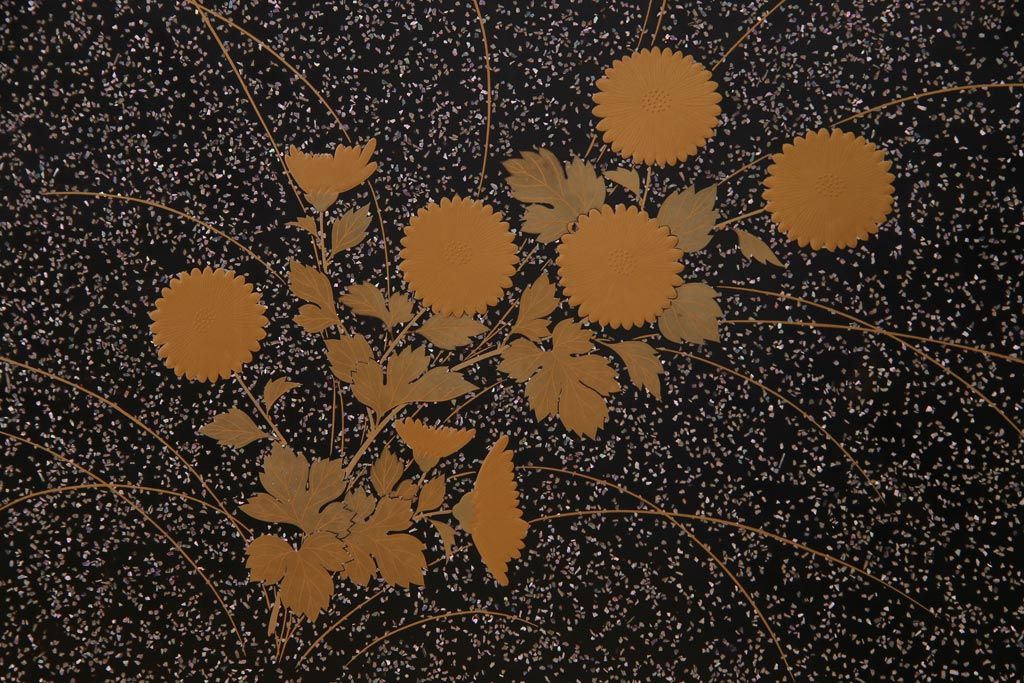また、その螺鈿に映えるような菊の蒔絵も魅力的で、抽斗1杯毎に2色の菊の配置パターンが違っており、細部にもこだわりを感じます。