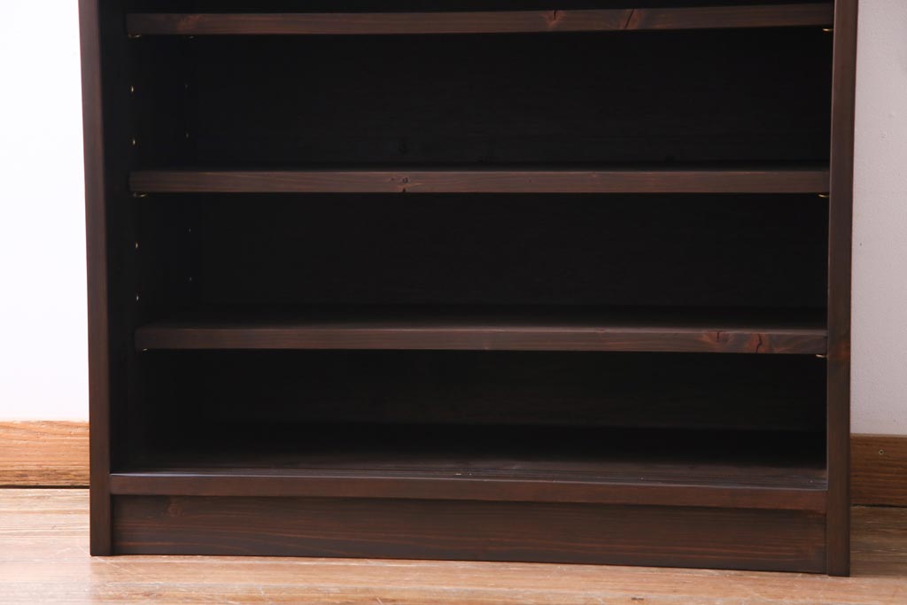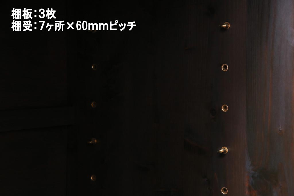 棚板は取り外しできます。棚板は3枚あります。棚受けは7ヶ所、60mmピッチで調整できます。棚幅サイズのものが1枚の作りです。