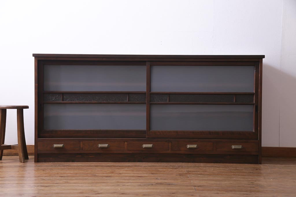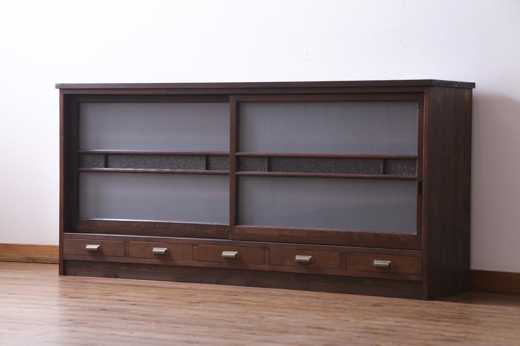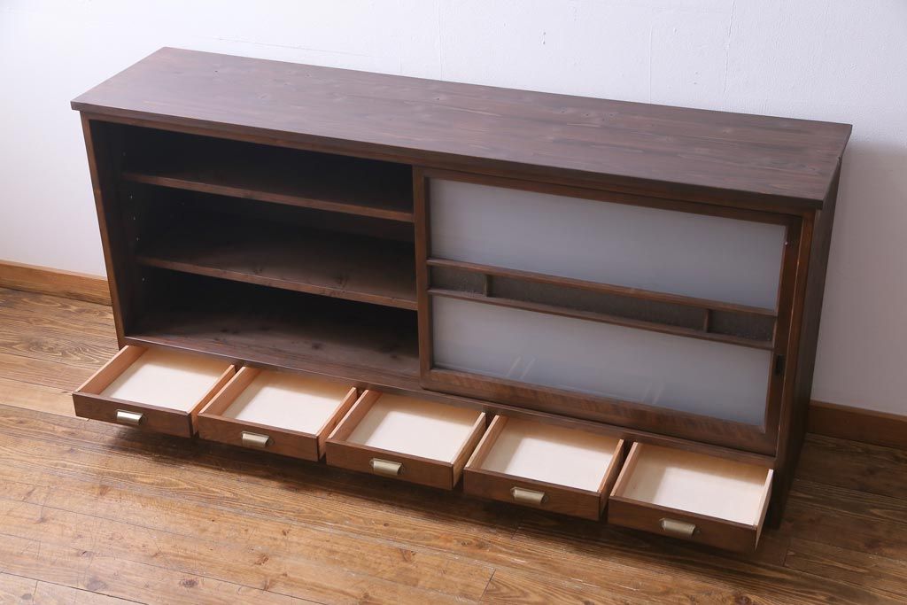 ラフジュ工房オリジナル 建具リメイク 引き出し付き レトロなガラス入りの戸棚(収納棚、サイドボード)です。