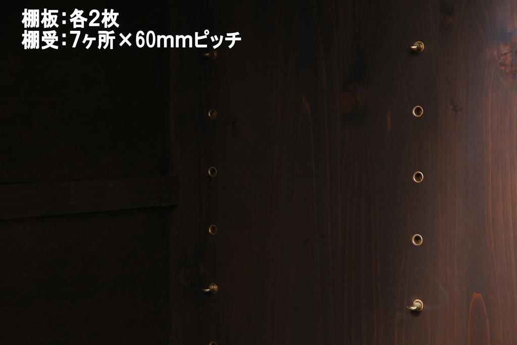 棚板は取り外しできます。棚板は左右各2枚あります。棚受けは7ヶ所、60mmピッチで調整できます。棚幅サイズのものが1枚の作りです。