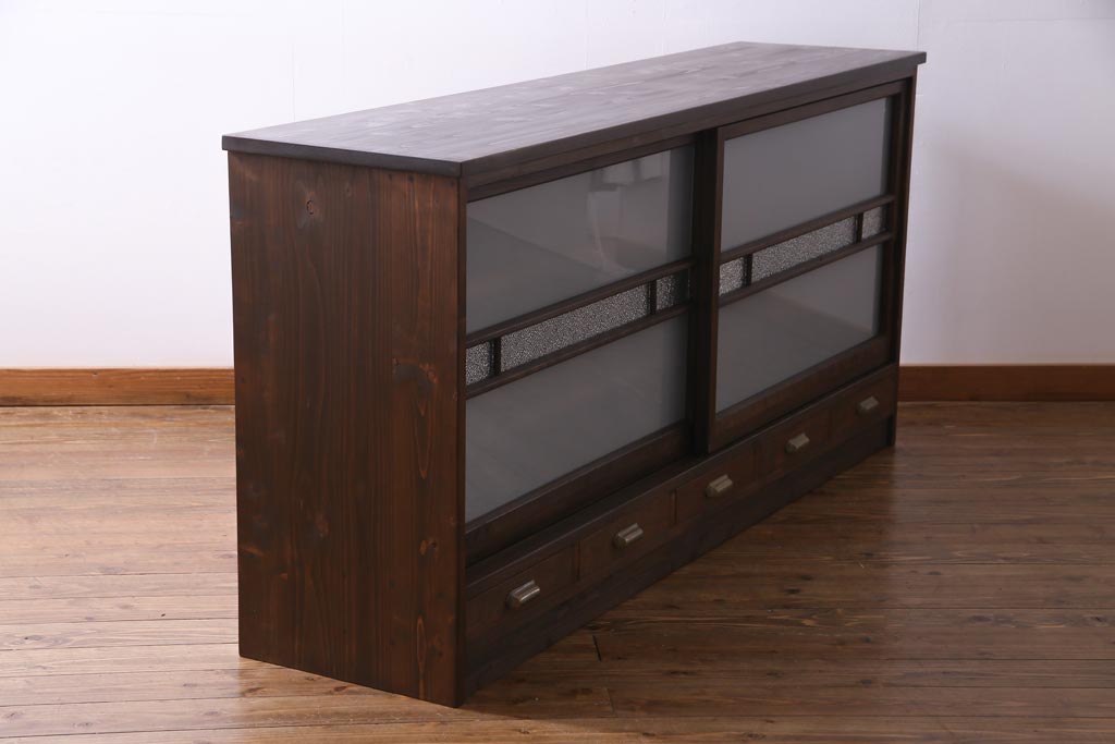ラフジュ工房オリジナル 建具リメイク 引き出し付き レトロなガラス入りの戸棚(収納棚、サイドボード)