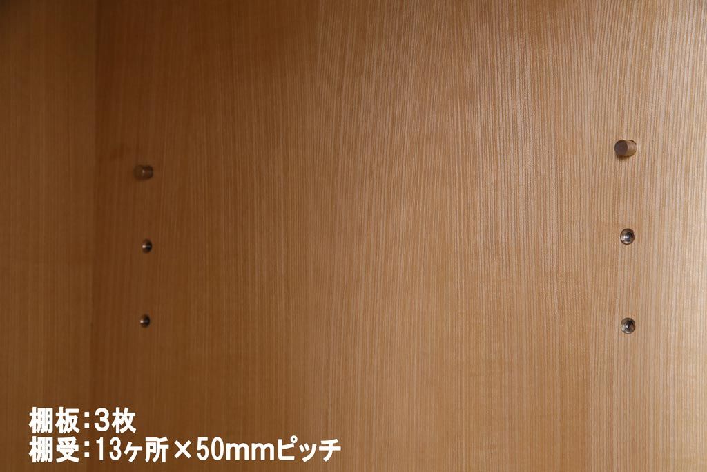 棚板は取り外しできます。棚板は3枚あります。棚受けは13ヶ所、50mmピッチで調整できます。棚幅サイズのものが1枚の作りです。