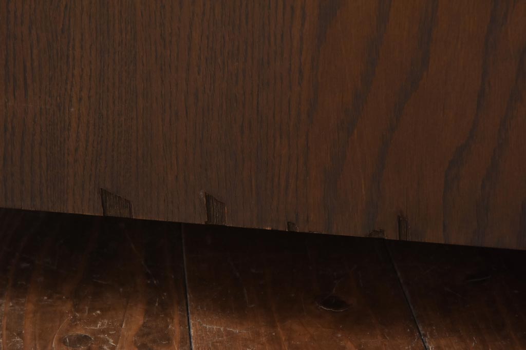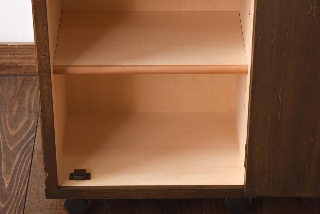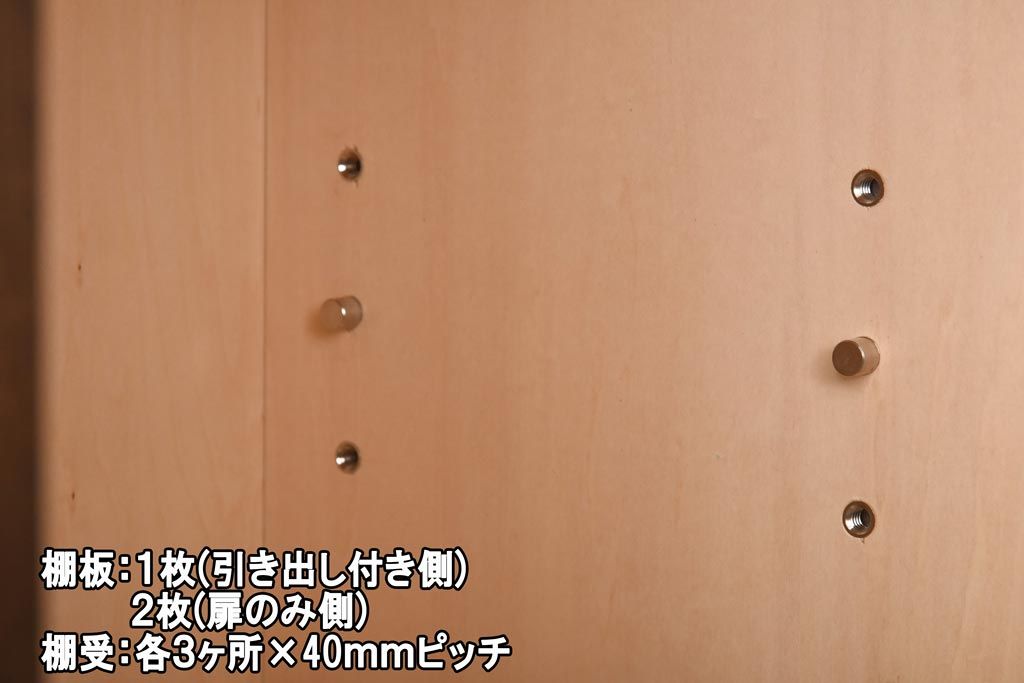 棚板は取り外しできます。棚板は扉のみの側が2枚、引き出し側が1枚あります。棚受けは各3ヶ所、40mmピッチで調整できます。棚幅サイズのものが1枚の作りです。