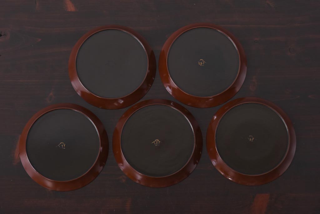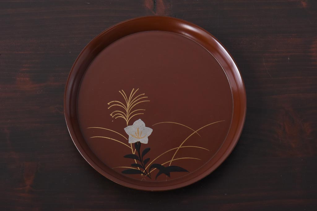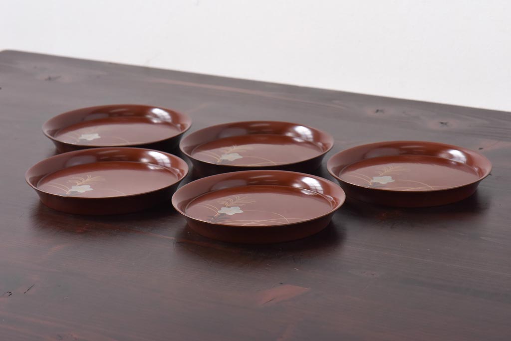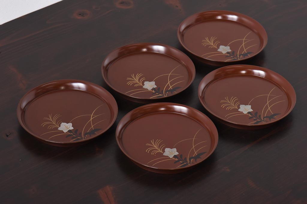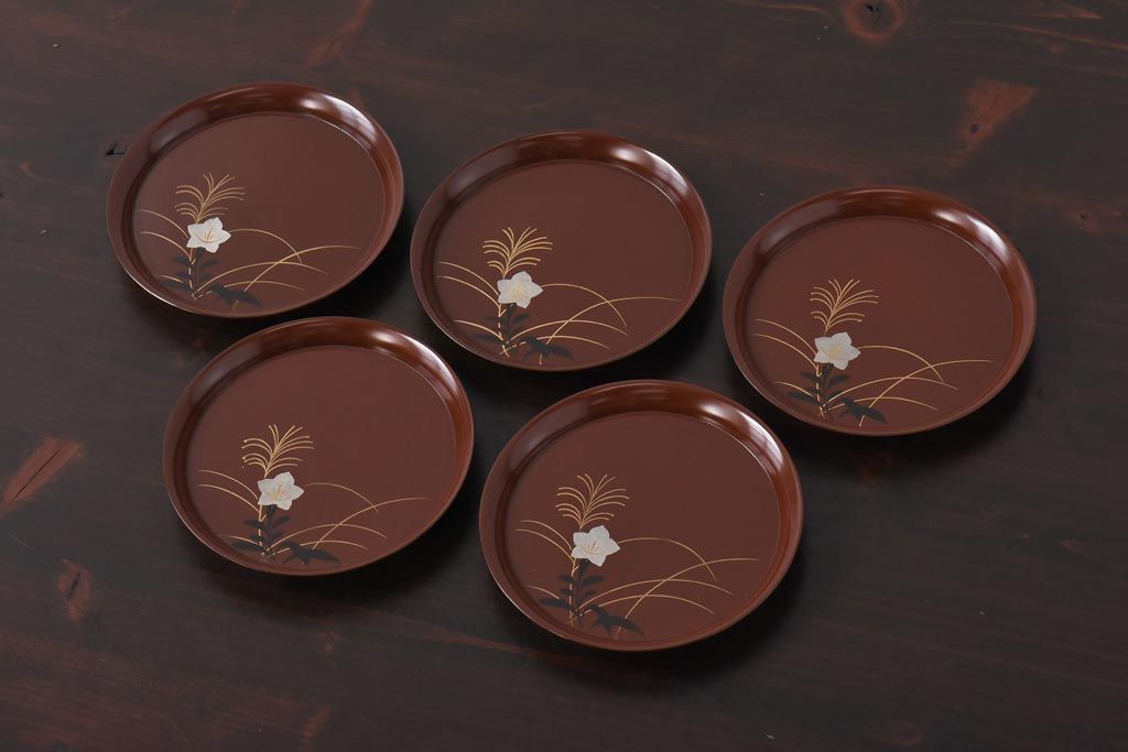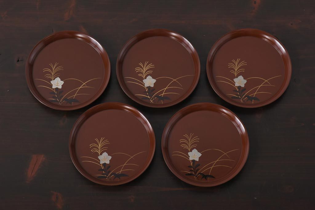 ラフジュ工房> 和食器・茶道具> 皿 > 和製アンティーク 桔梗と薄の図 秋の草花が描かれた蒔絵の木皿5枚セット(中皿)