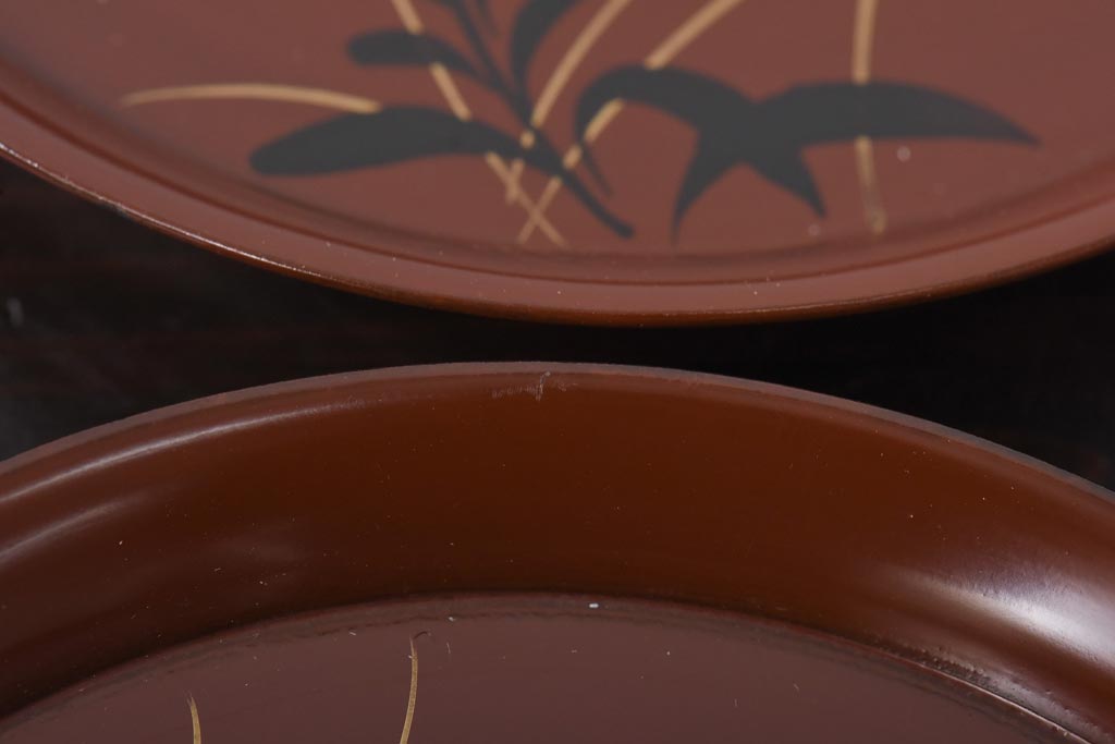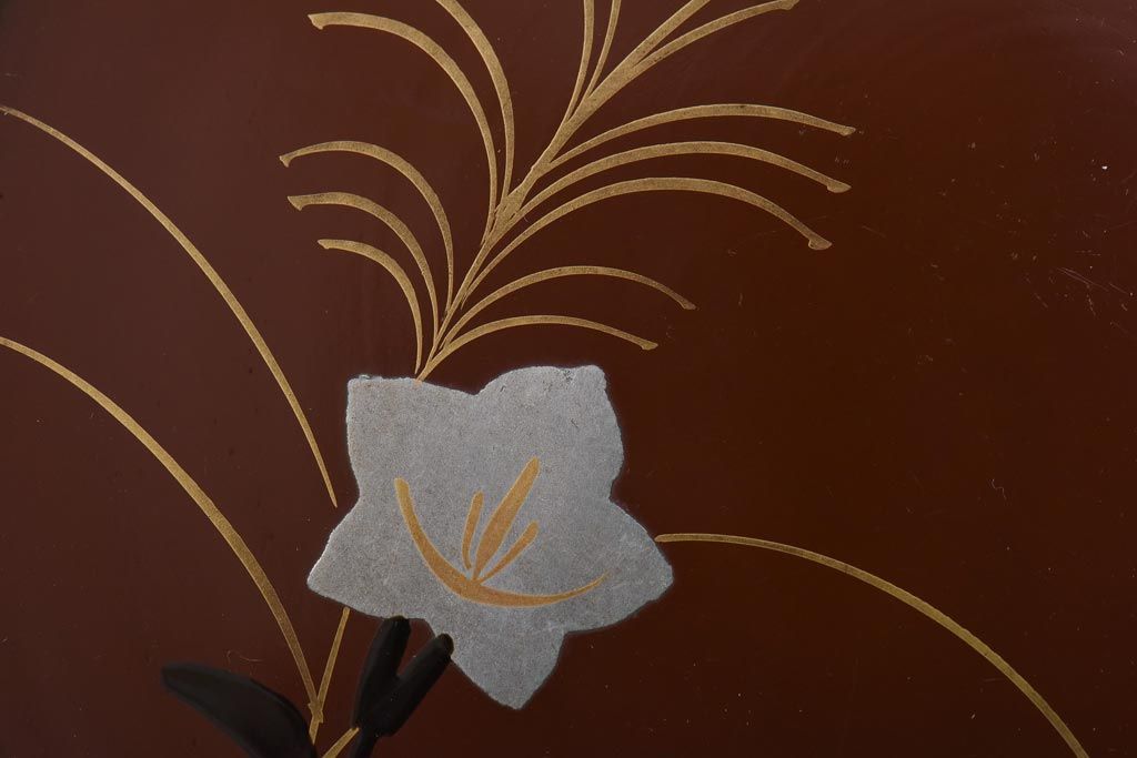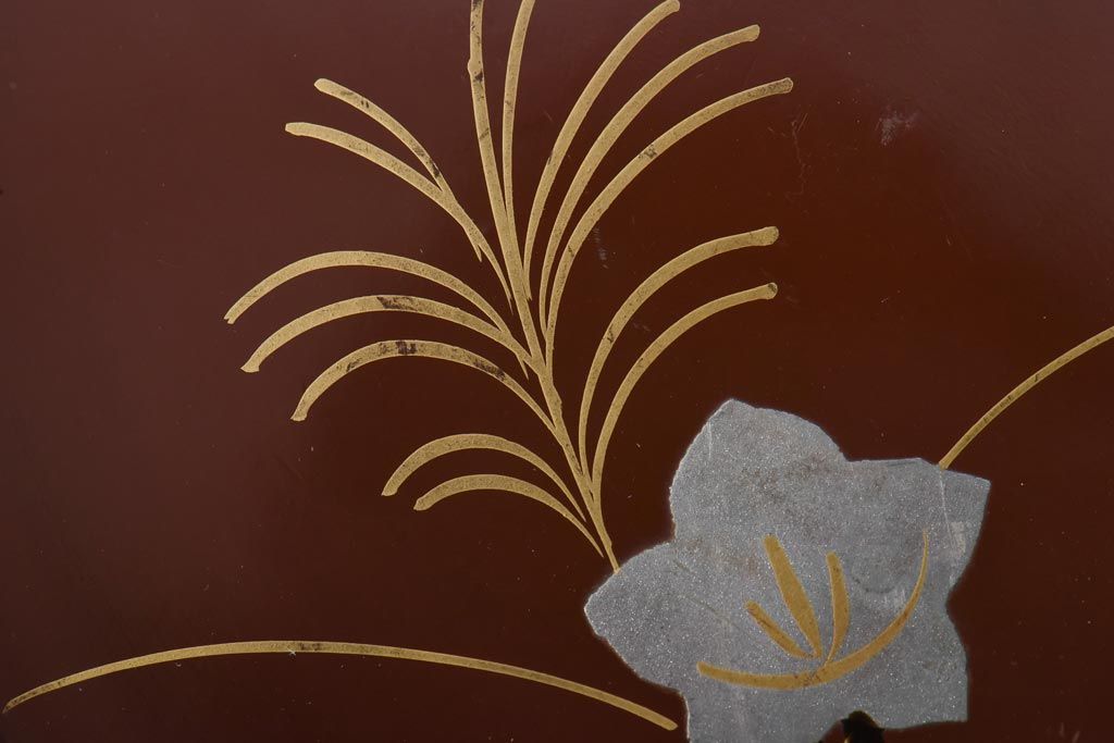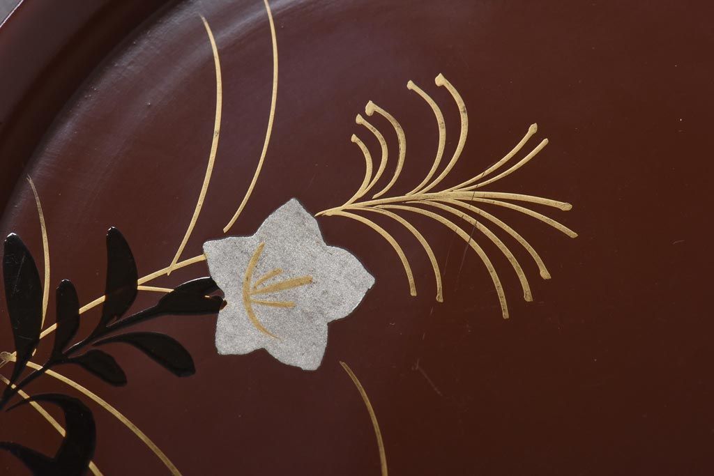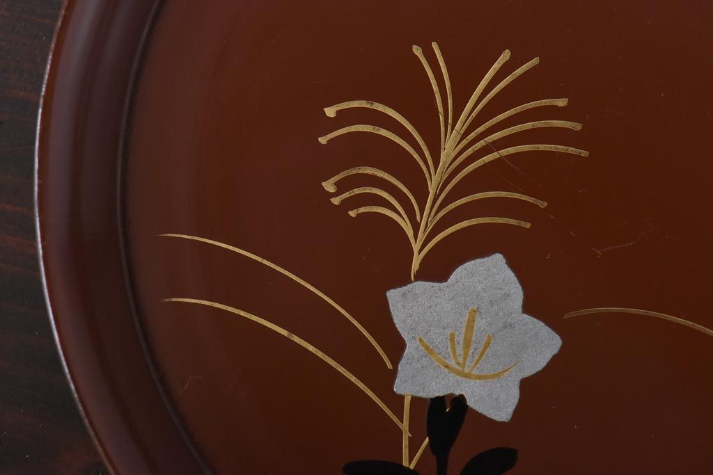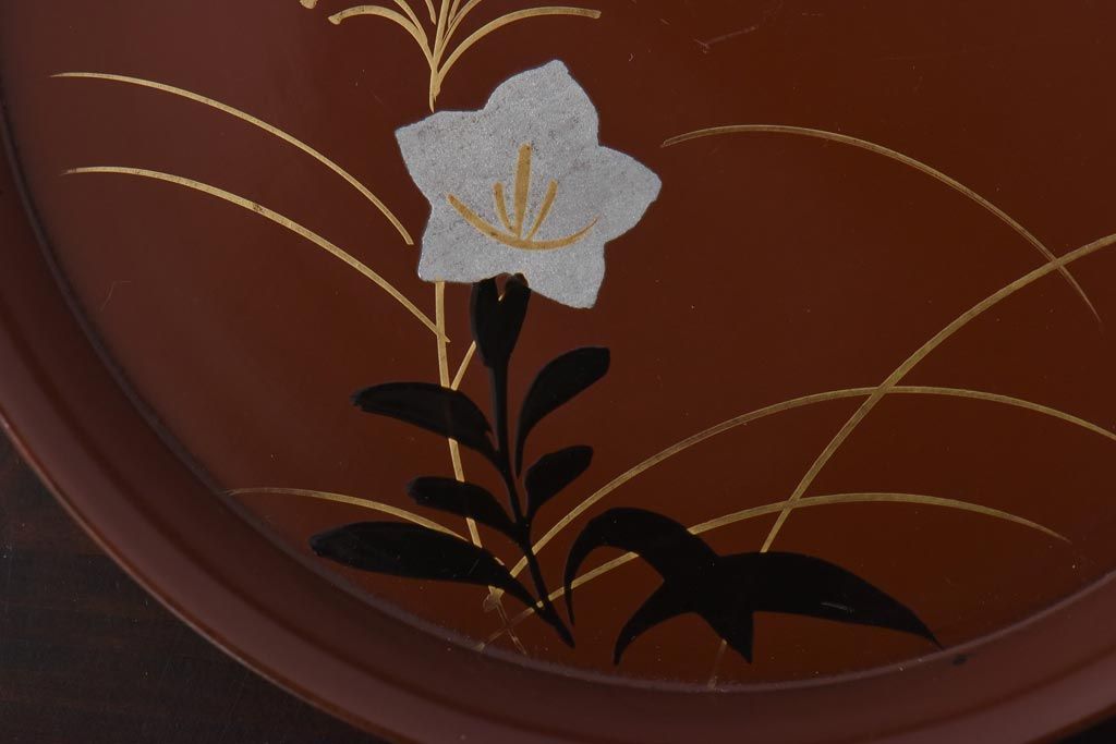 ラフジュ工房> 和食器・茶道具 > 和製アンティーク 桔梗と薄の図 秋の草花が描かれた蒔絵の木皿5枚セット(中皿)
