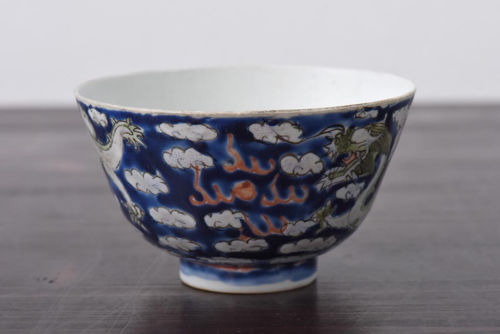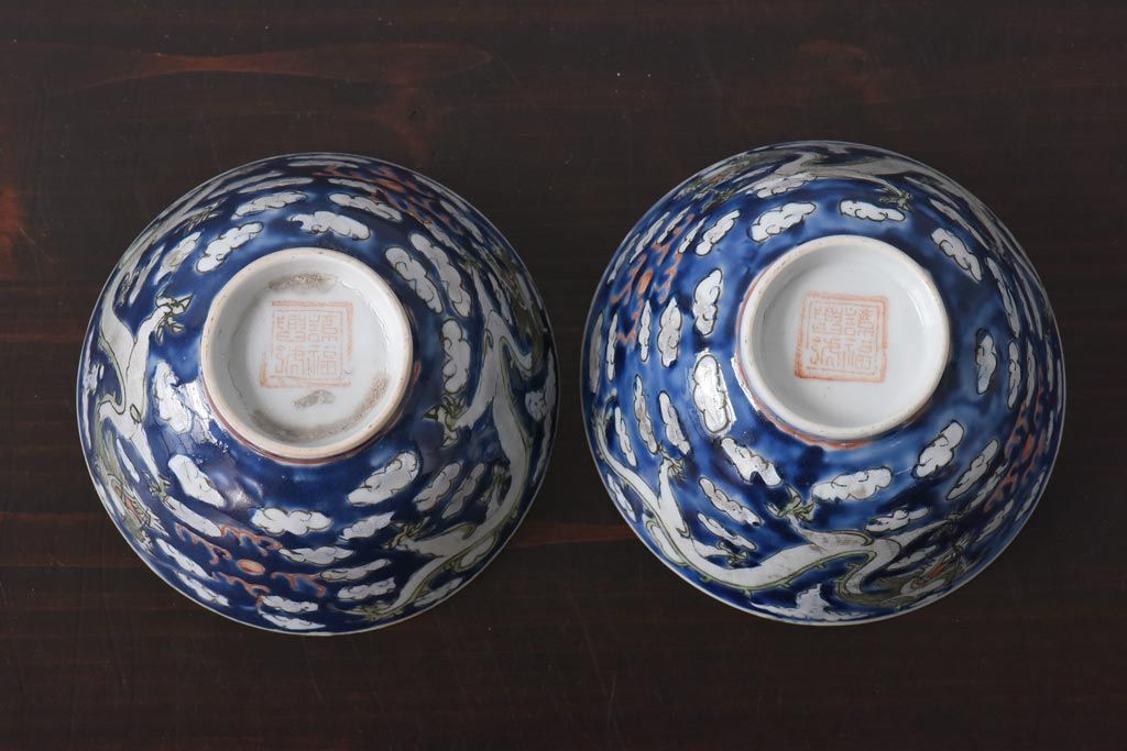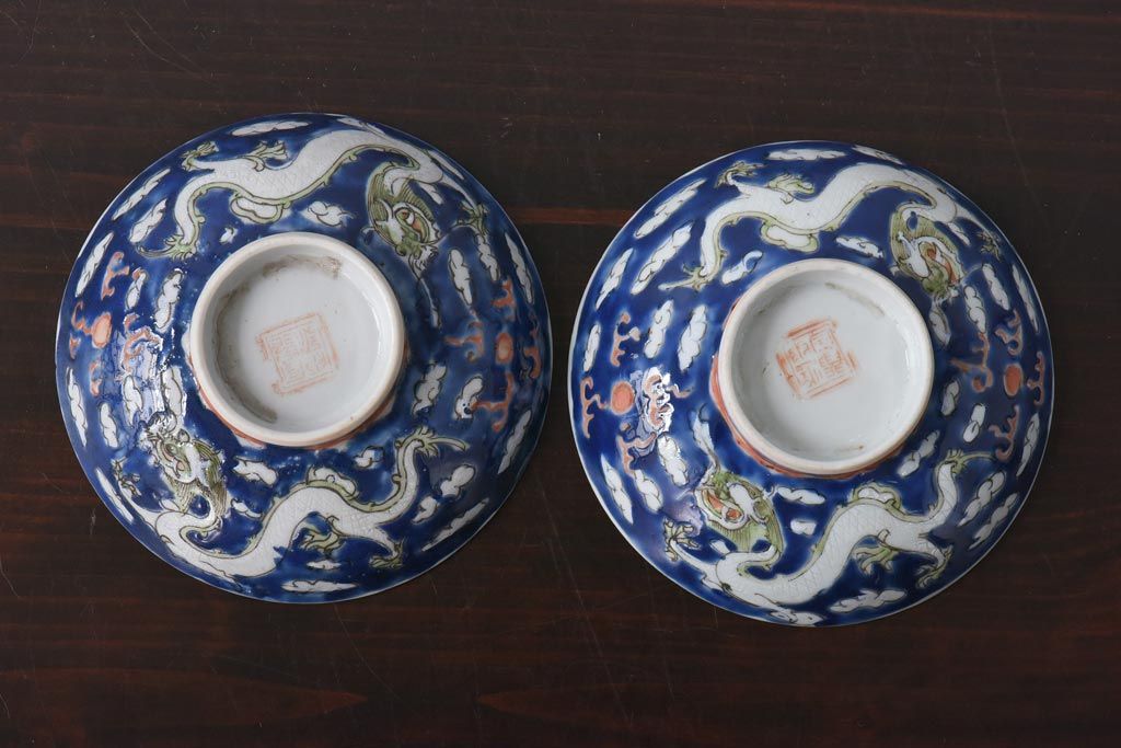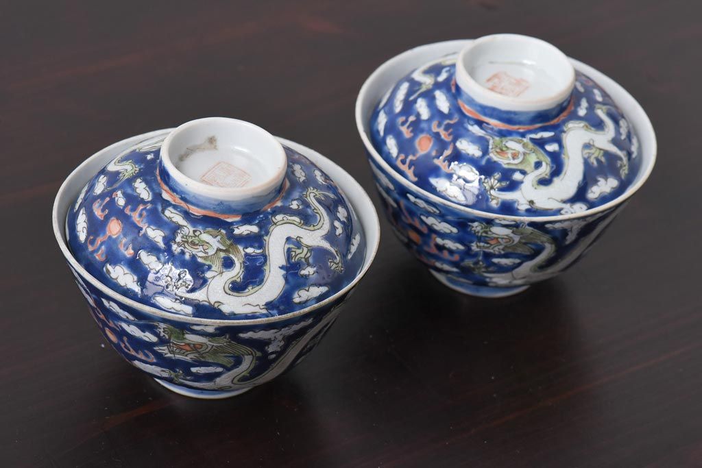 ラフジュ工房> 和食器・茶道具> お椀・茶碗 > 古民具・骨董 龍の図 色絵 独特な絵柄の蓋付き茶碗2客セット(和食器)