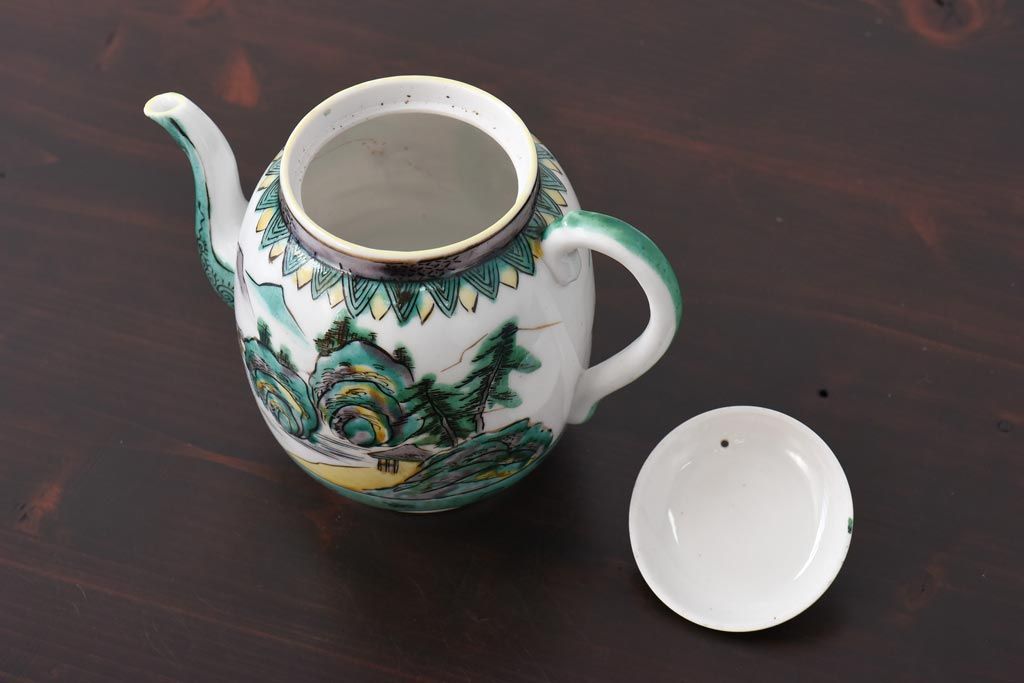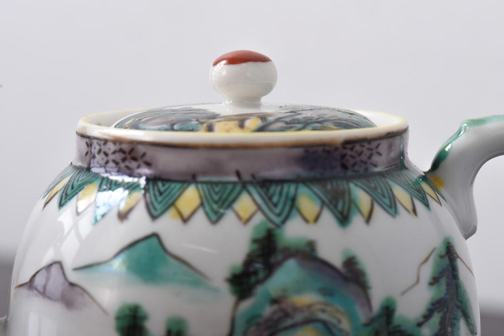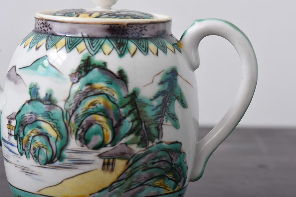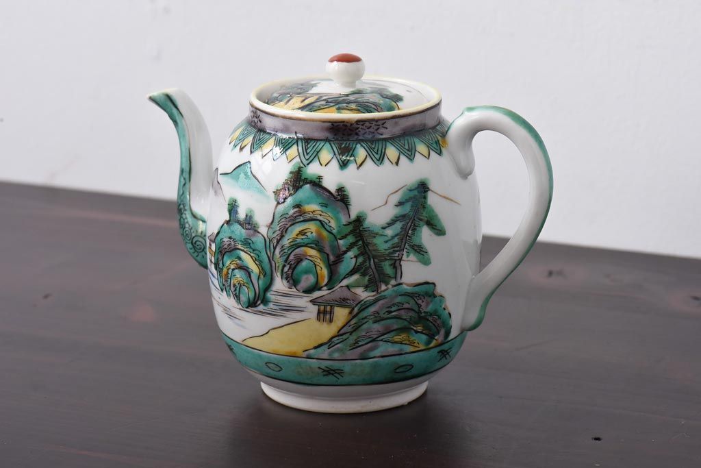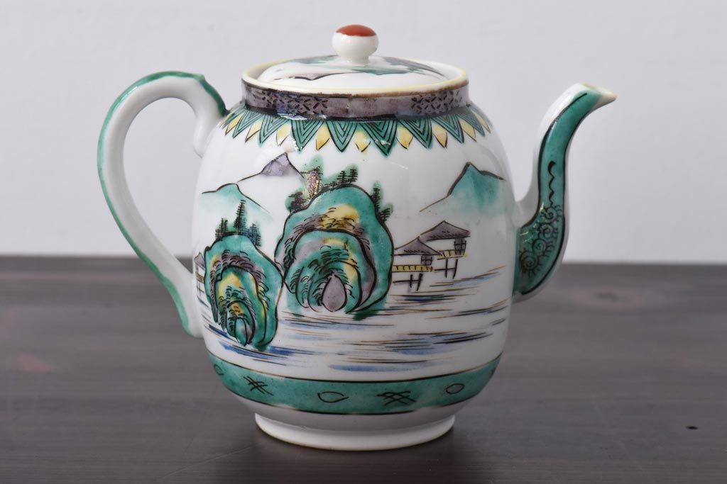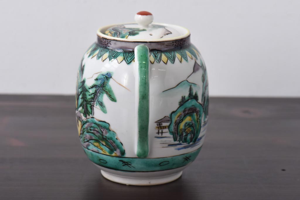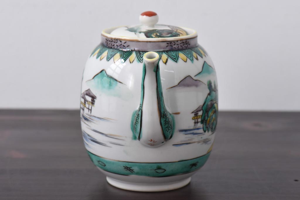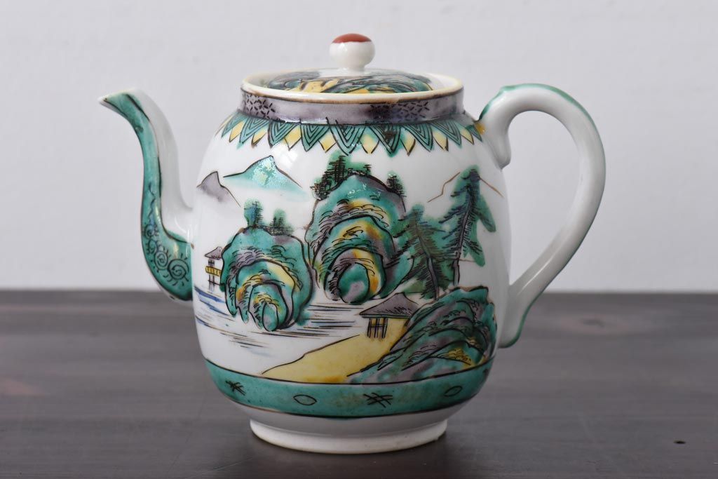 和製アンティーク 明治期 山水画 鮮やかな色彩が美しい九谷焼急須(水注、ポット)