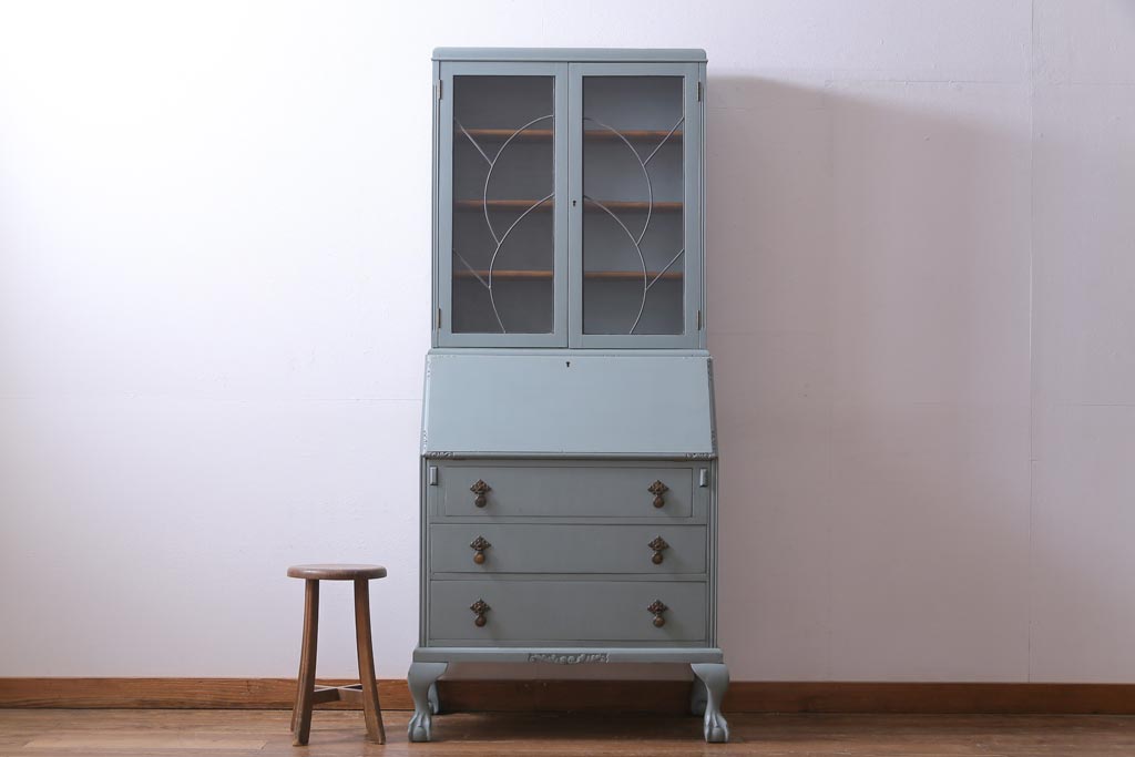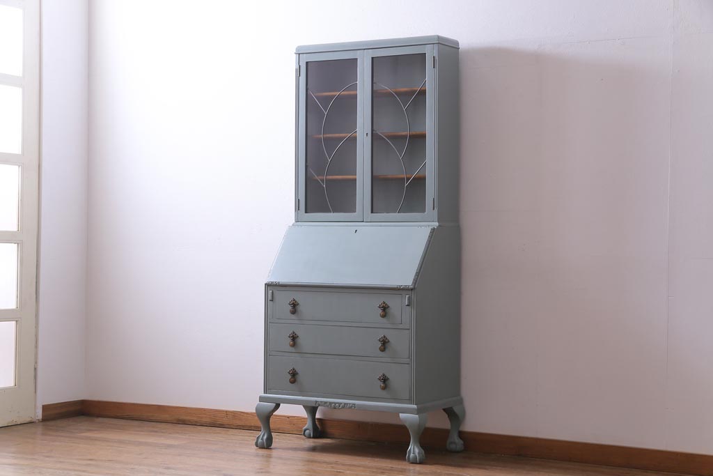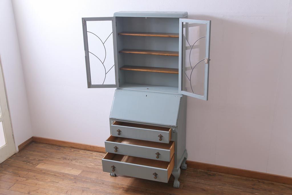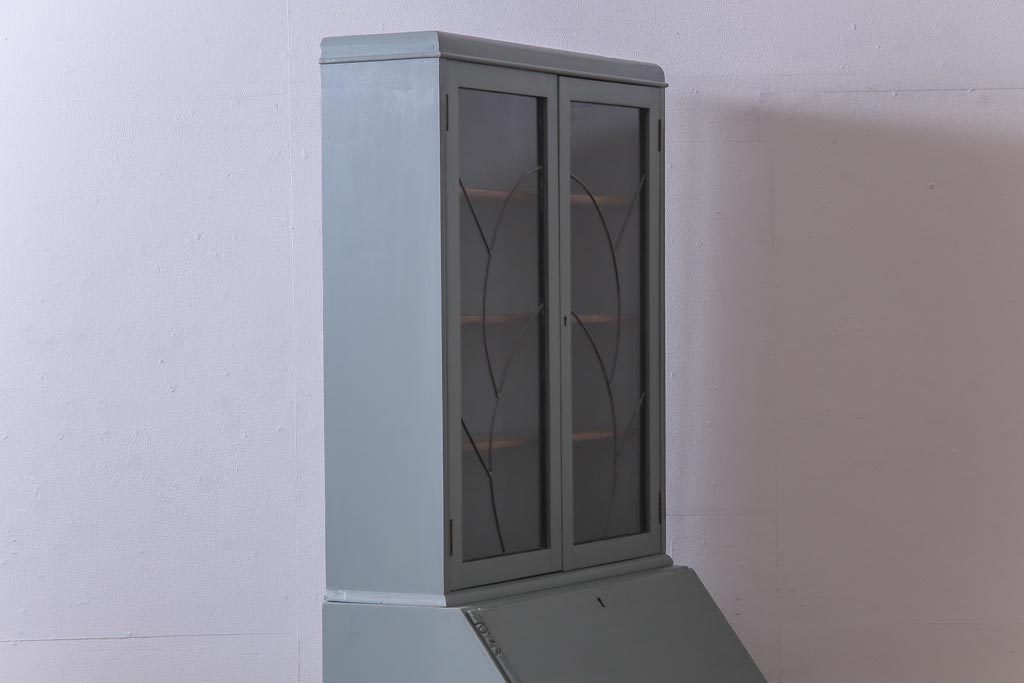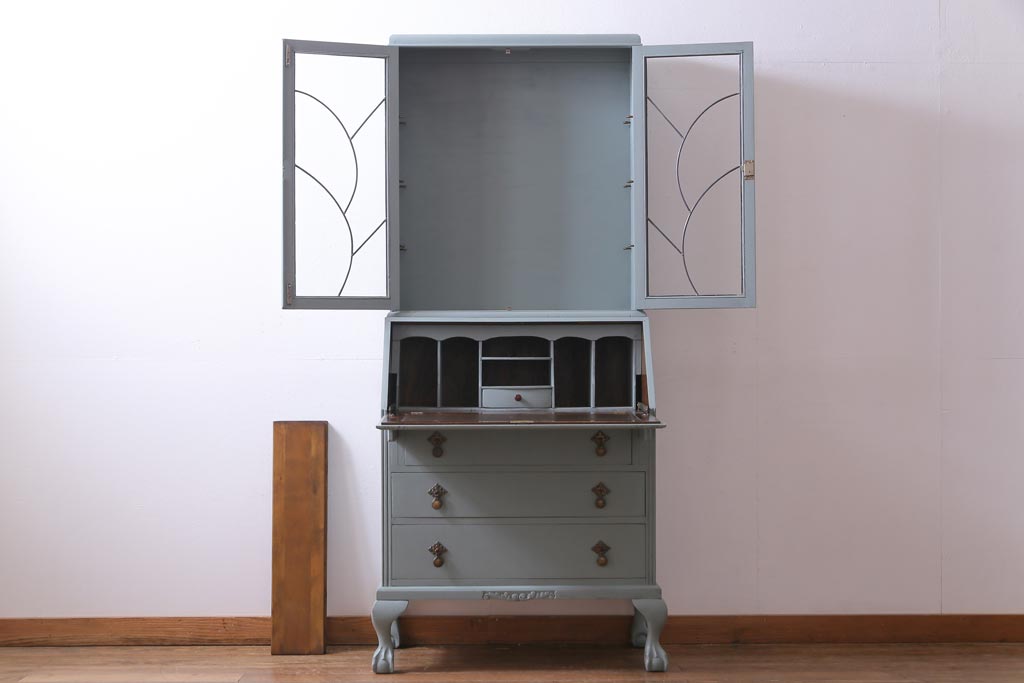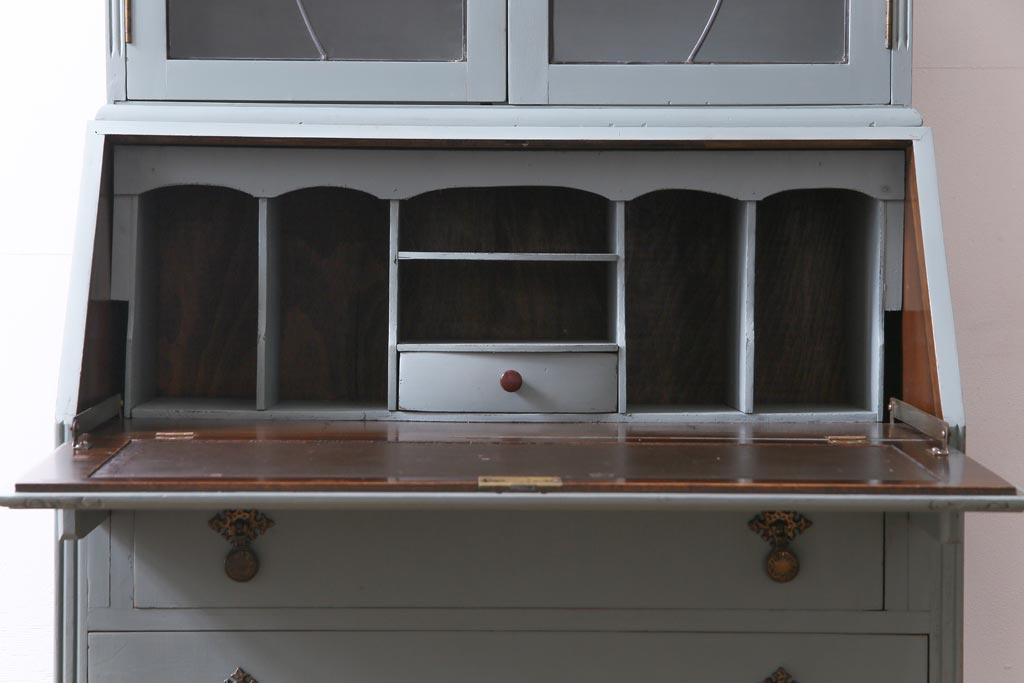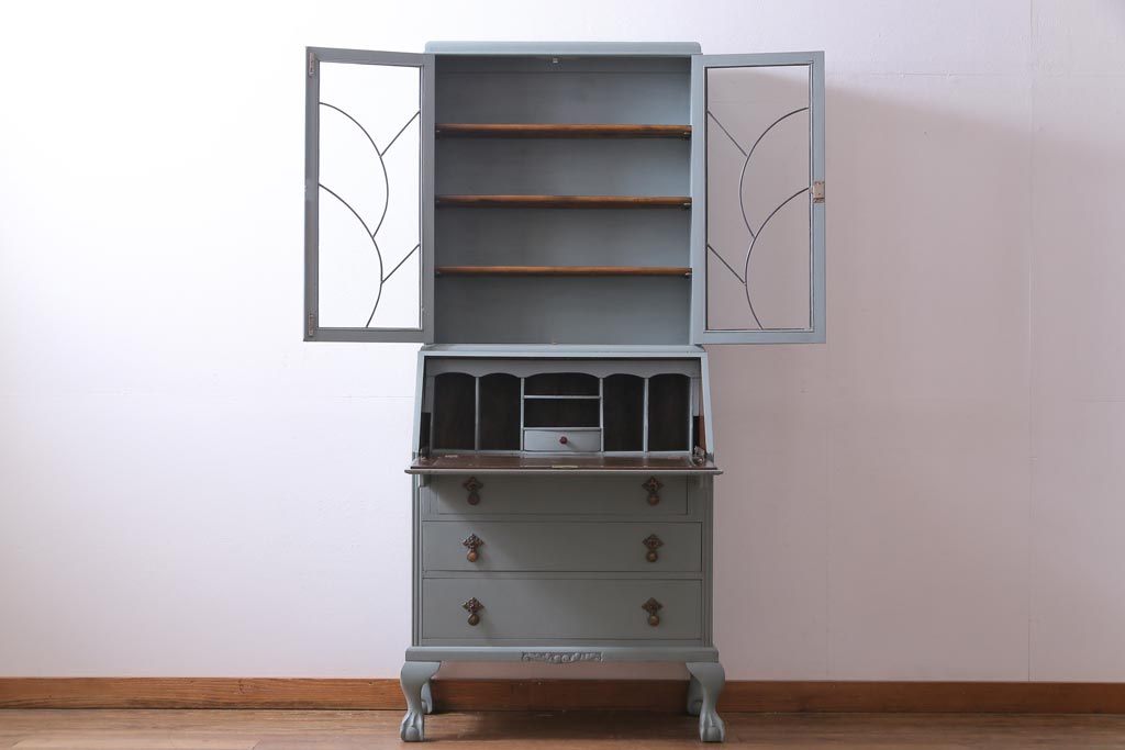 ペイント ステンドグラス扉がお洒落なアンティークのライティングビューロー(ビューローブックケース)です。