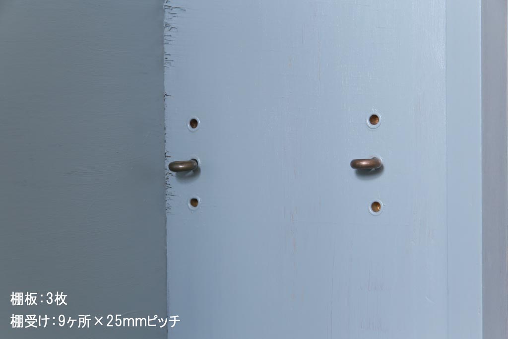 棚板は取り外しできます。棚板は3枚あります。棚受けは9ヶ所、25mmピッチで調整できます。棚幅サイズのものが1枚の作りです。