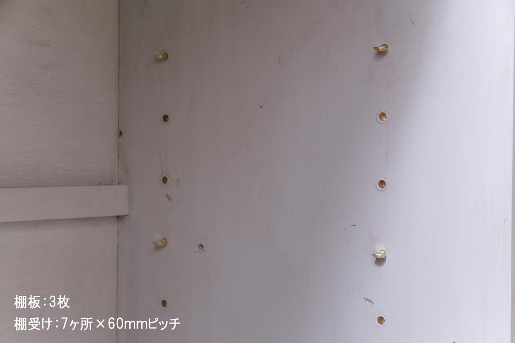 棚板は取り外しできます。棚板は3枚あります。棚受けは7ヶ所、60mmピッチで調整できます。棚幅サイズのものが1枚の作りです。