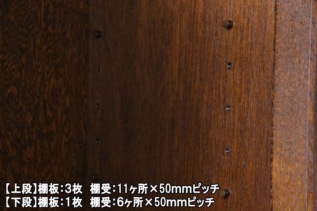 棚板は取り外しできます。棚板は上3枚、下が1枚あります。棚受けは上11ヶ所、下が6ヶ所で、上下ともに50mmピッチで調整できます。棚幅サイズのものが1枚の作りです。