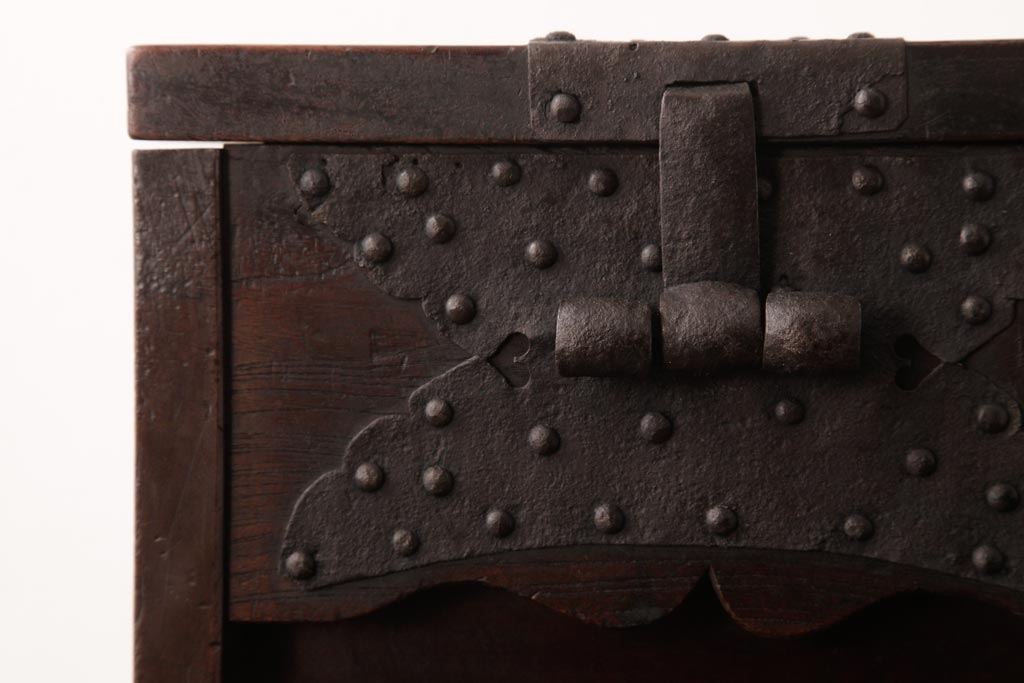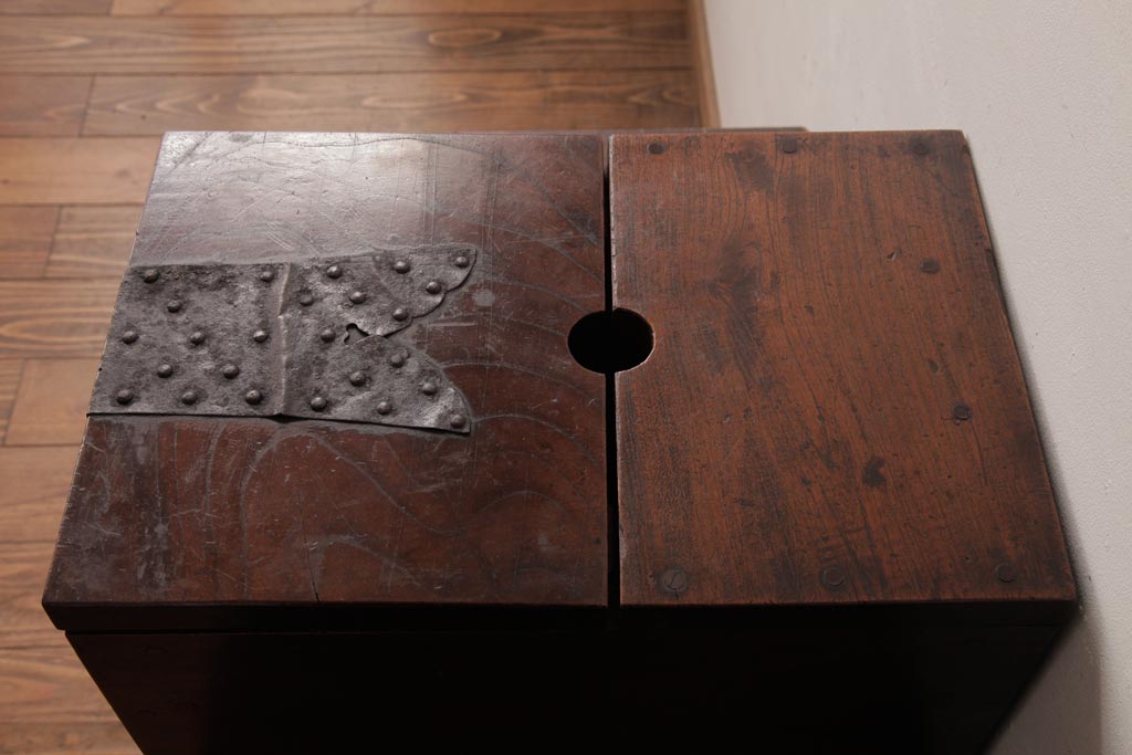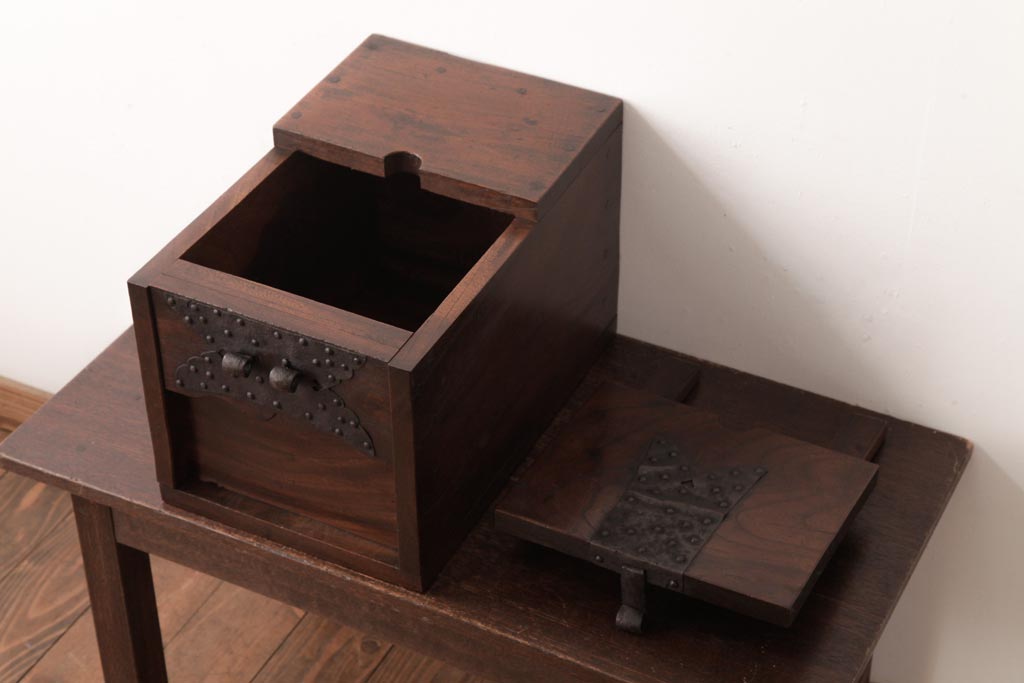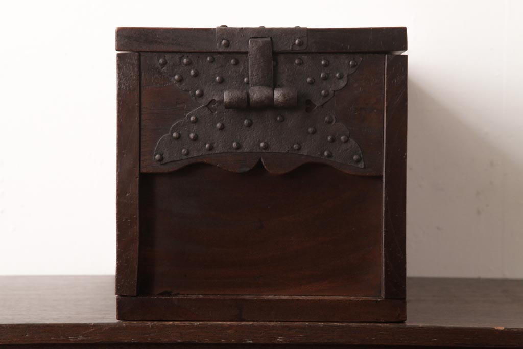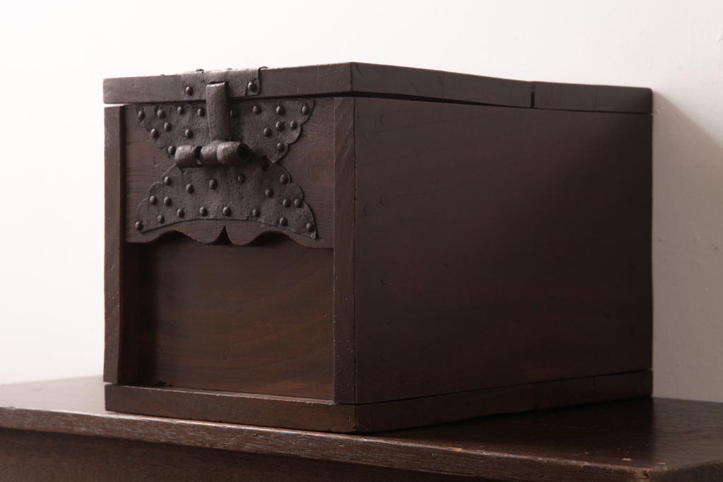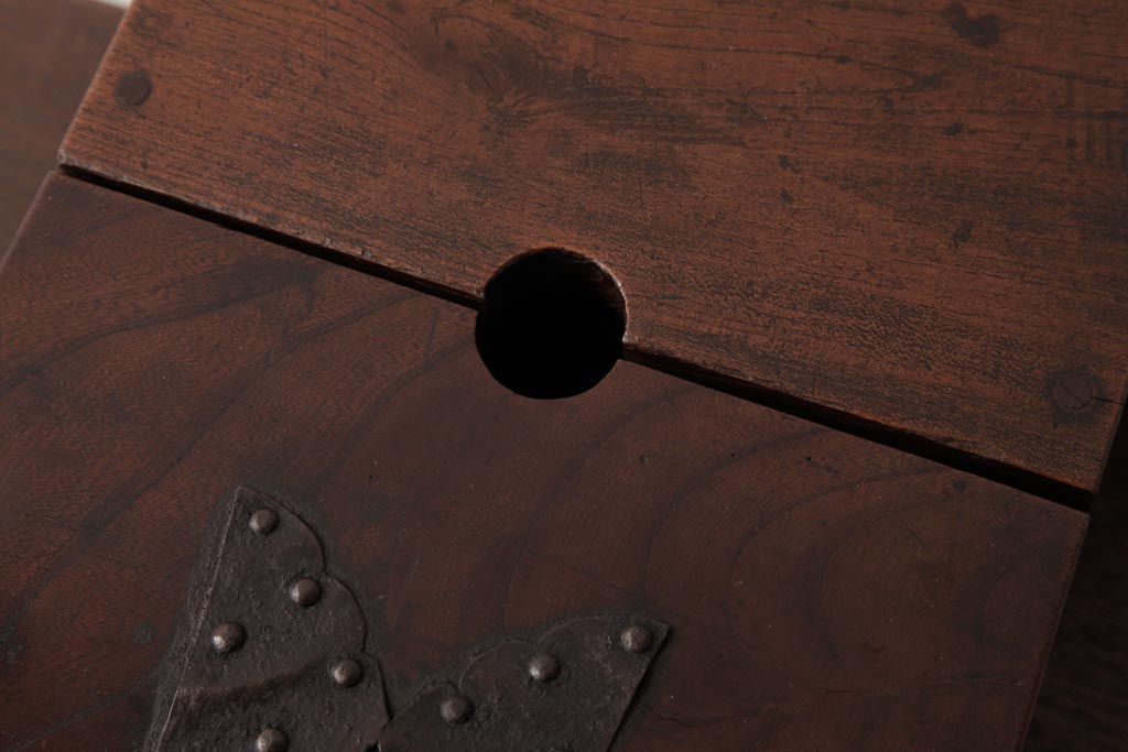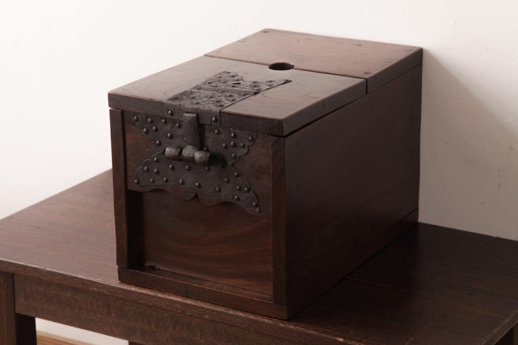 アンティーク雑貨 古民具・骨董 総ケヤキ材 金具が風格を漂わせる銭箱(銭函)