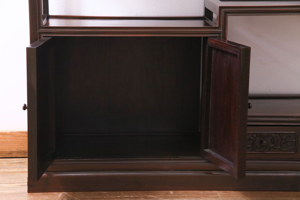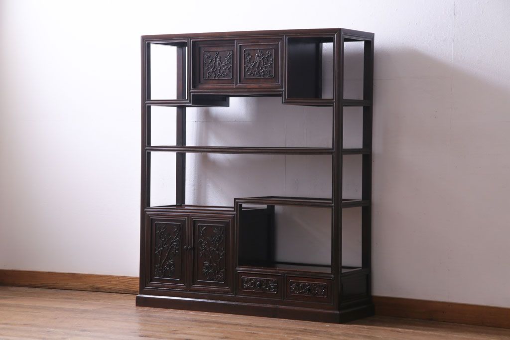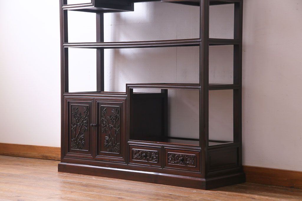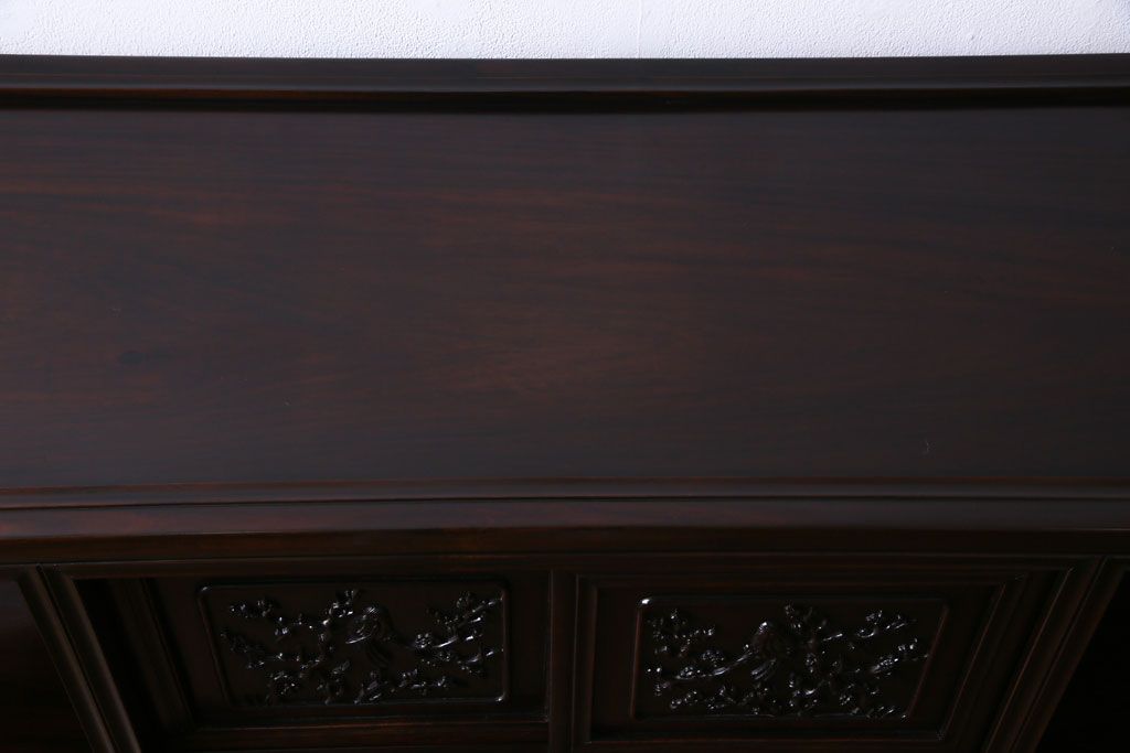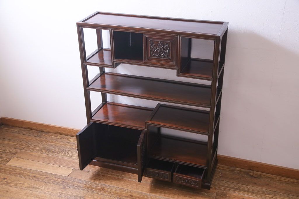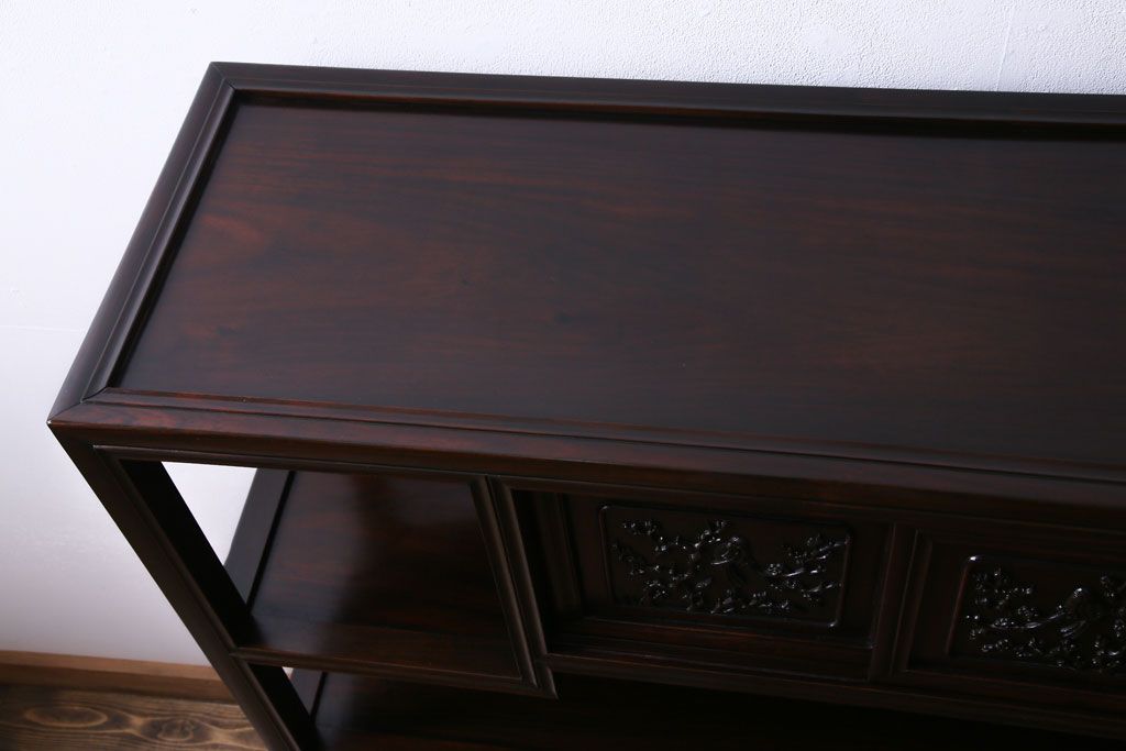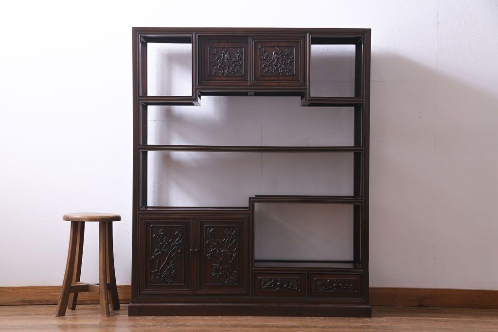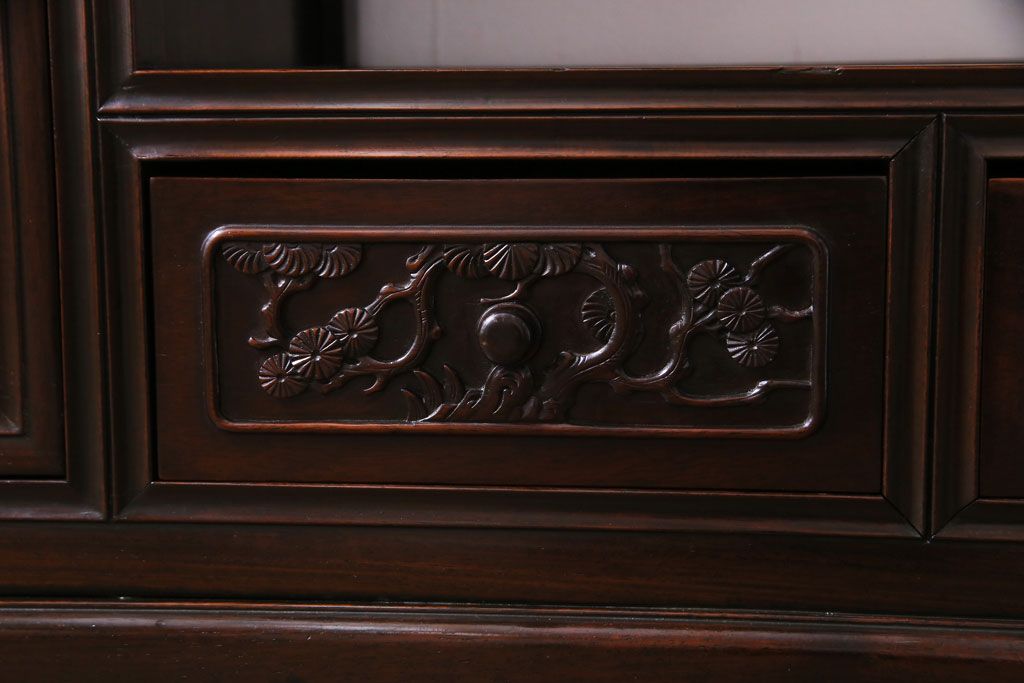 アンティーク家具 和製アンティーク 紫檀 花鳥図 縁取りが存在感を引き立てる時代物の飾り棚(飾棚、茶棚)