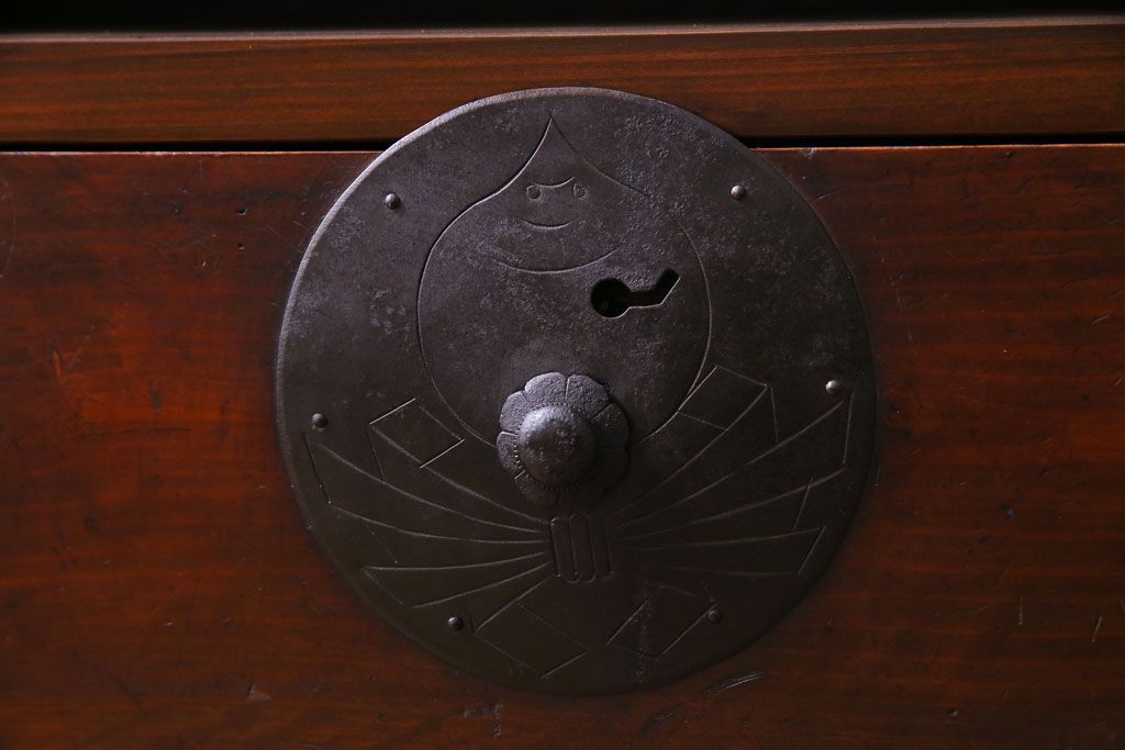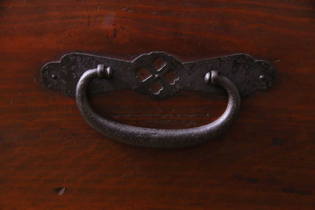 使い込まれた風合いの金具付きの引き出しから