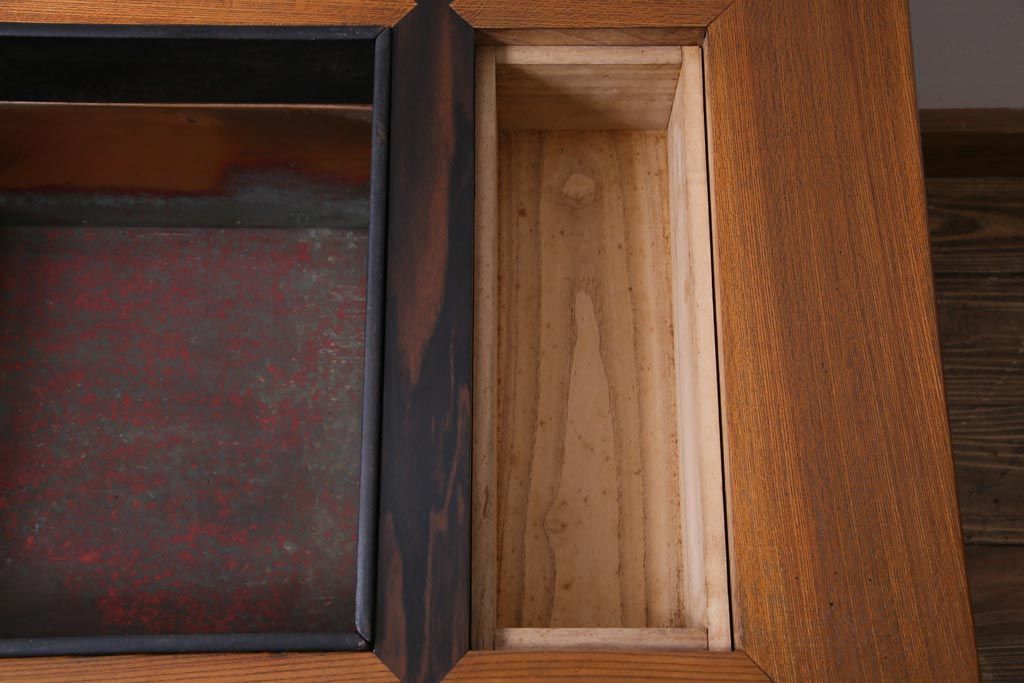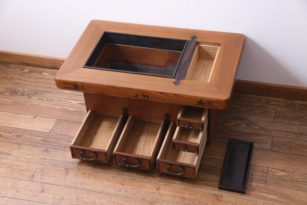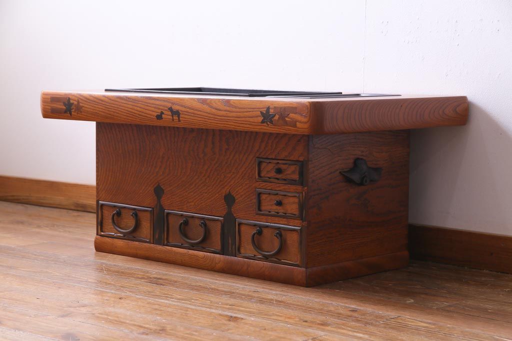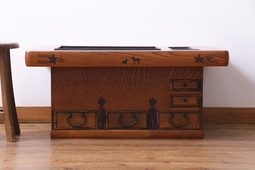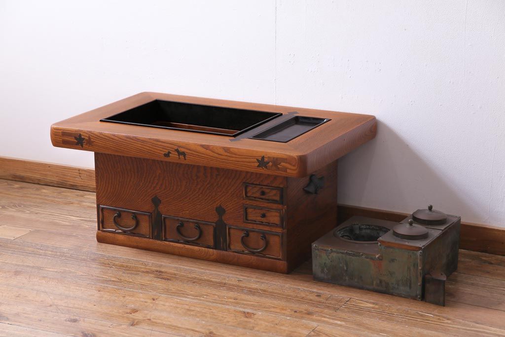 アンティーク雑貨 和製アンティーク 銅燗壺付き ケヤキ・黒柿 別格品!細部の意匠までこだわり抜かれた長火鉢(木製火鉢)