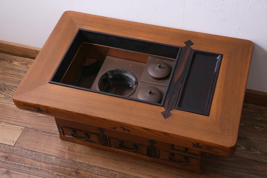 和製アンティーク 銅燗壺付き ケヤキ・黒柿 別格品!細部の意匠までこだわり抜かれた長火鉢(木製火鉢)です。