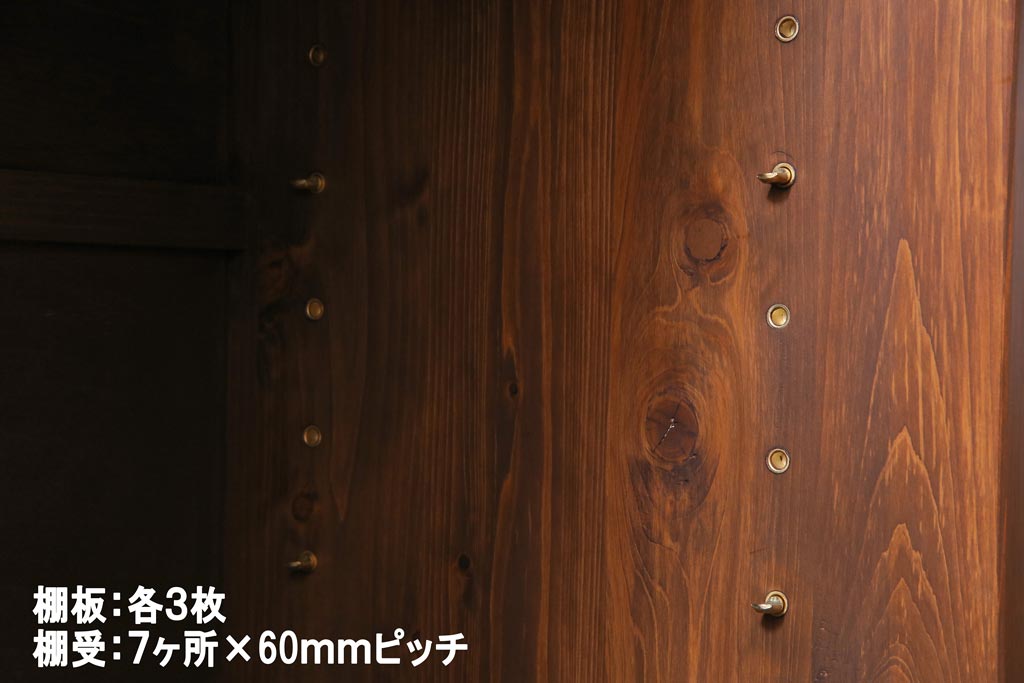 棚板は取り外しできます。棚板は左右各3枚あります。棚受けは7ヶ所、60mmピッチで調整できます。棚幅サイズのものが1枚の作りです。