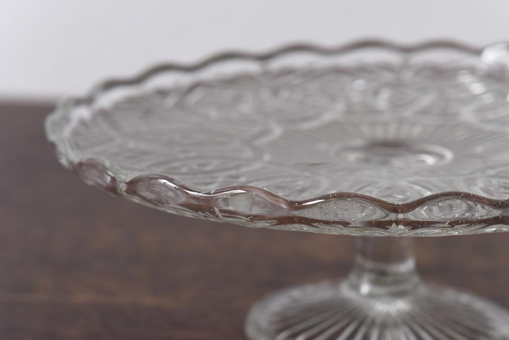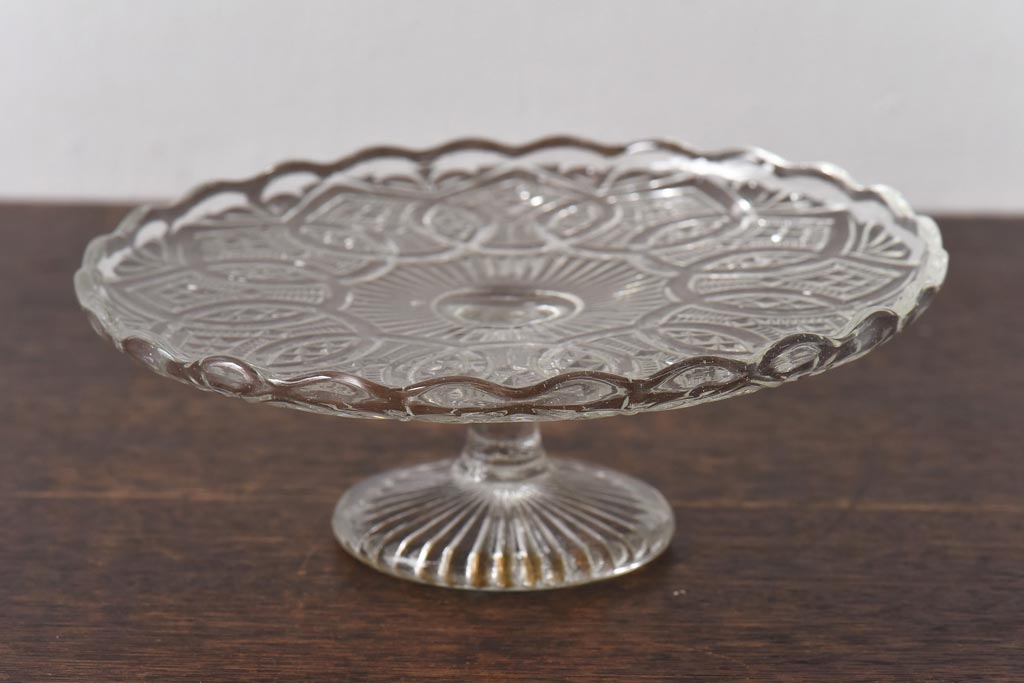 アンティーク雑貨 イギリスビンテージ 花が咲いたようなデザインのプレスガラス製ケーキスタンド