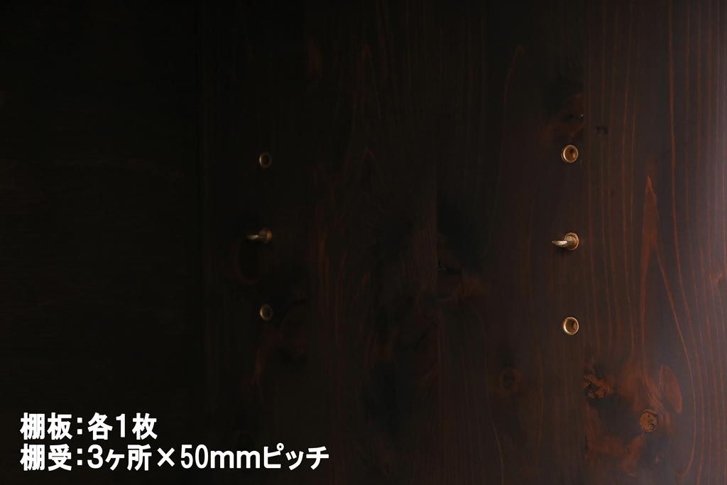 棚板は取り外しできます。棚板は左右各1枚あります。棚受けは3ヶ所、50mmピッチで調整できます。棚幅サイズのものが1枚の作りです。