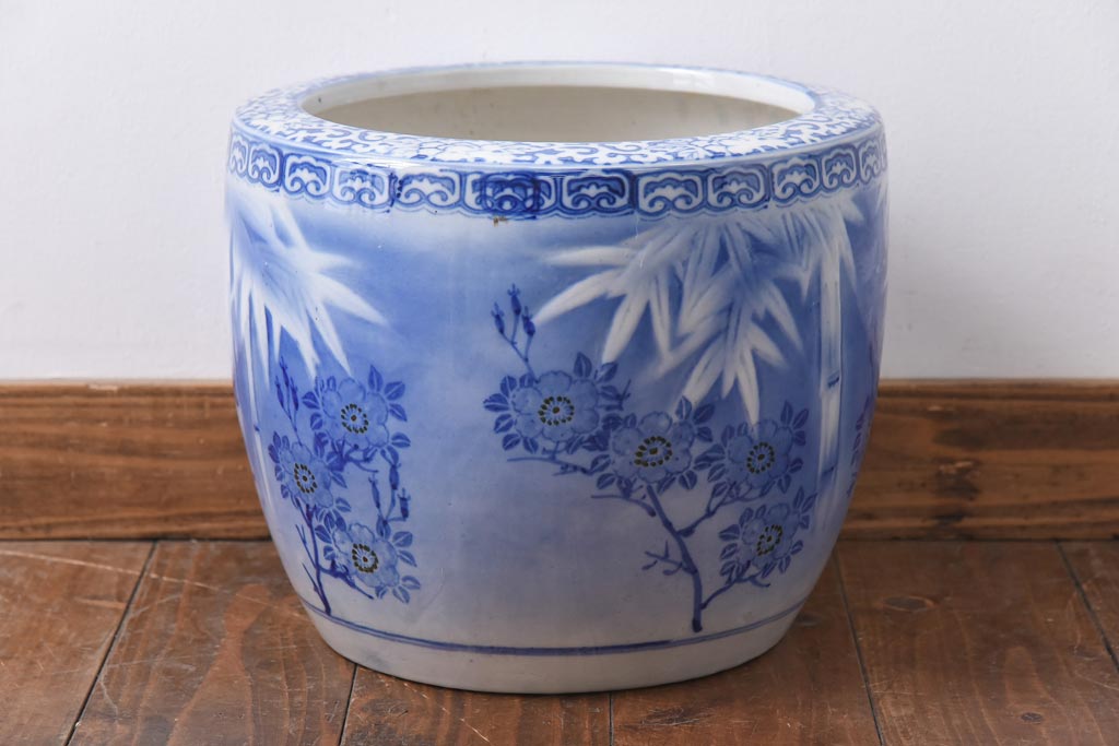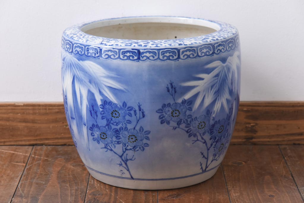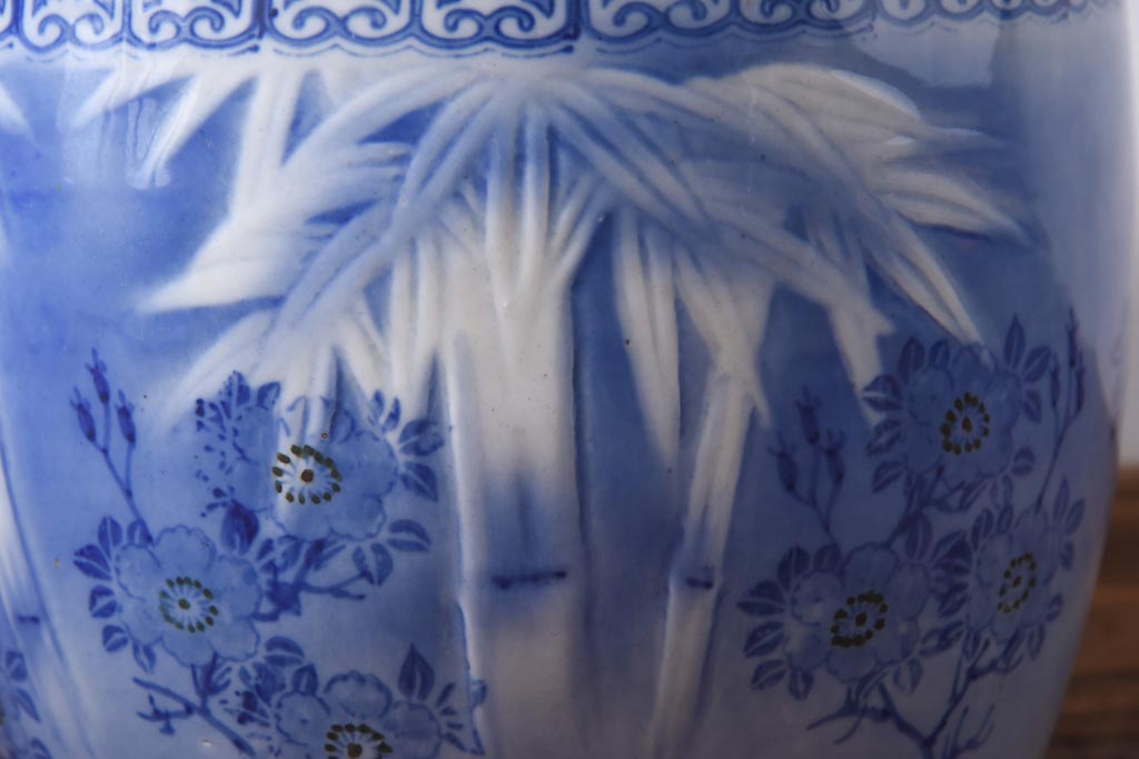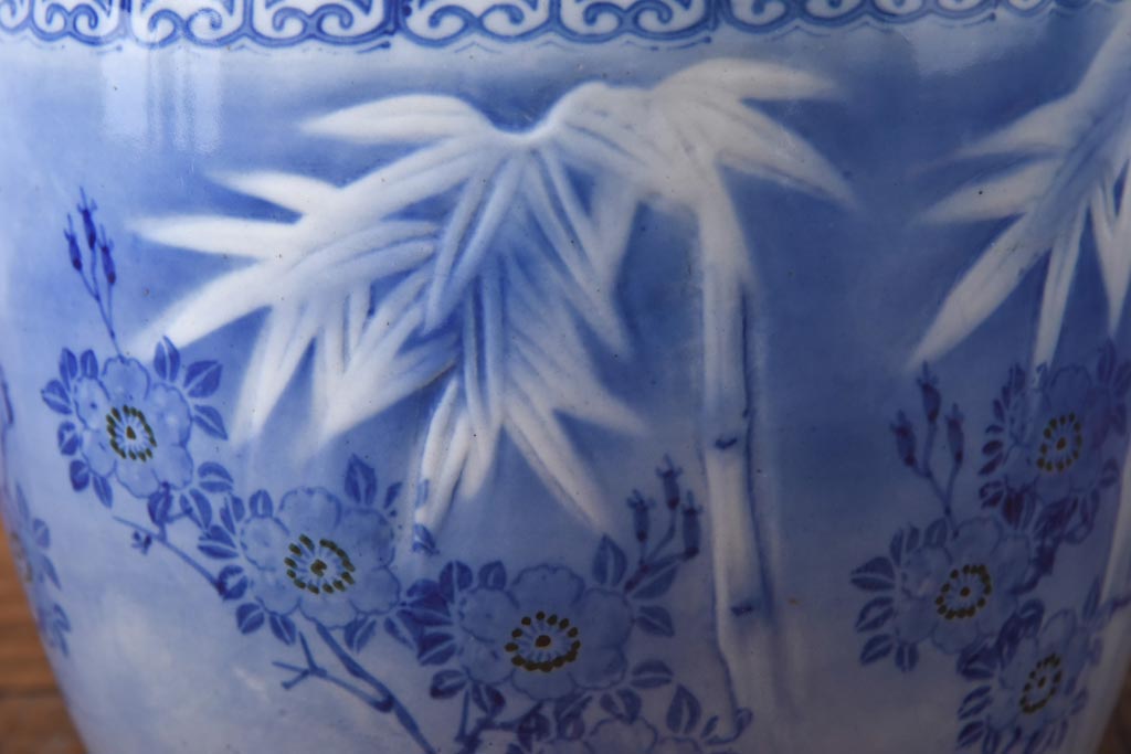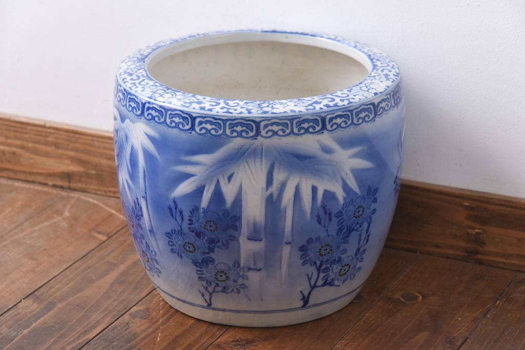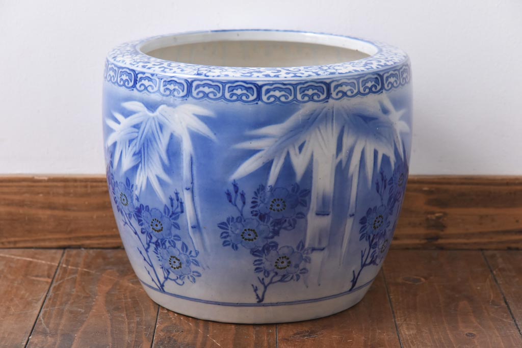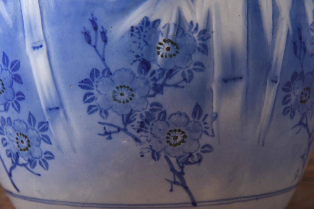 火鉢> 瀬戸火鉢 > アンティーク雑貨 古民具 竹・花の図 浮き出た竹の意匠が目を引く瀬戸火鉢(手あぶり)
