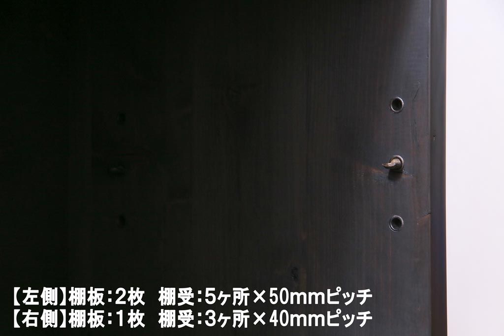 棚板は取り外しできます。棚板は左2枚・右1枚あります。棚受けは左5ヶ所50mmピッチ、右3ヶ所40mmピッチで調整できます。棚幅サイズのものが1枚の作りです。