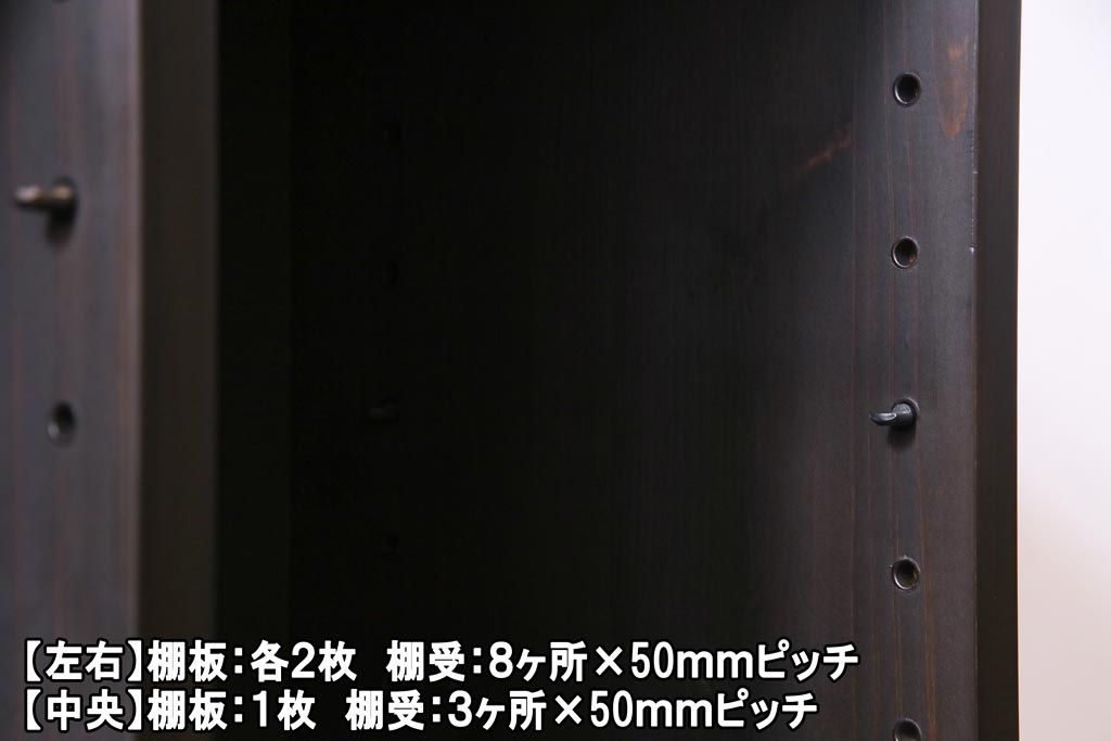 棚板は取り外しできます。棚板は計5枚あります。左右各2枚・棚受け8ヶ所・50mmピッチ、中央1枚・棚受けは3ヶ所・50mmピッチで調整できます。各棚幅サイズのものが1枚の作りです。