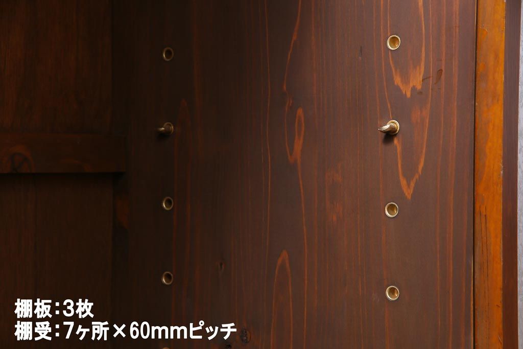 棚板は取り外しできます。棚板は3枚あります。棚受けは7ヶ所、60mmピッチで調整できます。棚幅サイズのものが1枚の作りです。