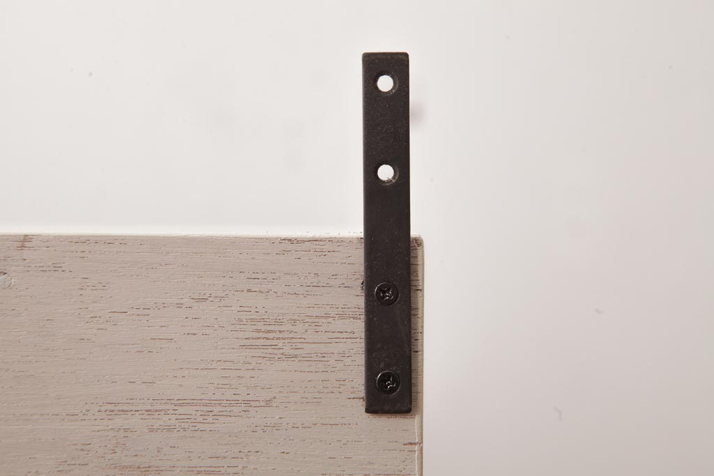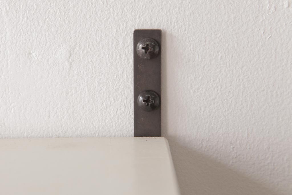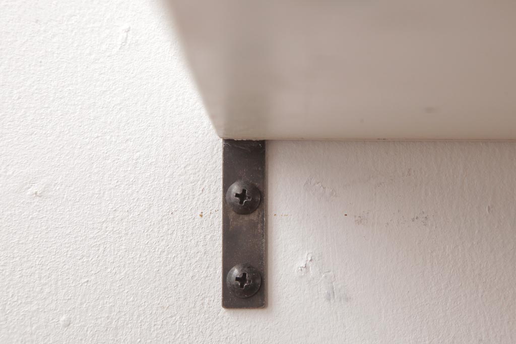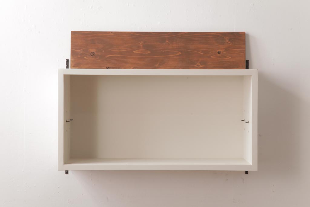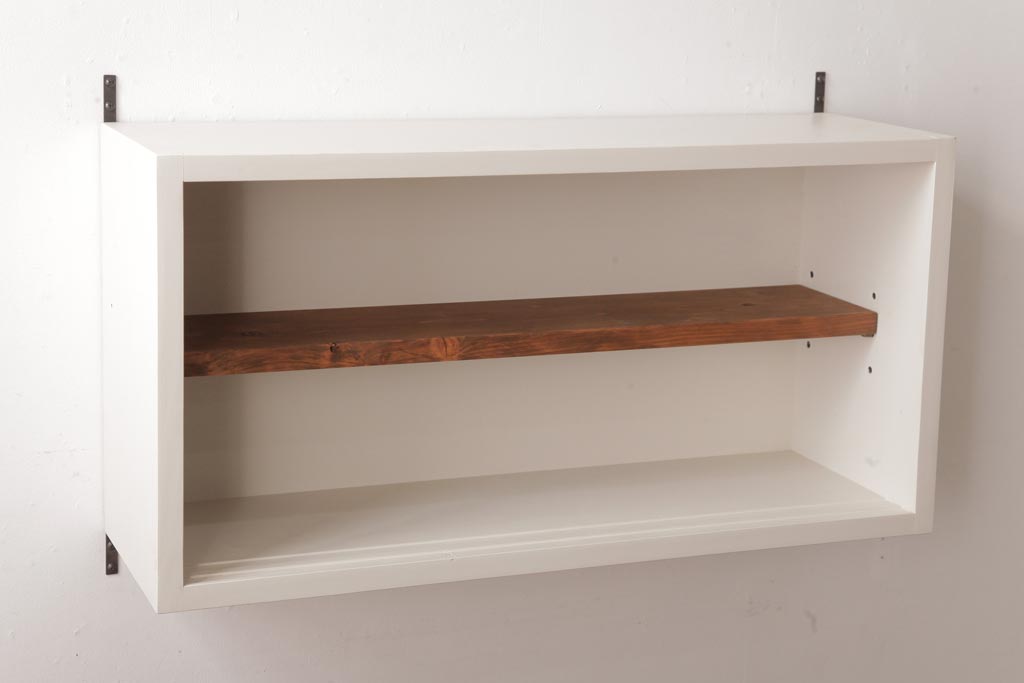 棚板は取り外しできます。棚板は1枚あります。棚受けは3ヶ所、40mmピッチで調整できます。棚幅サイズのものが1枚の作りです。