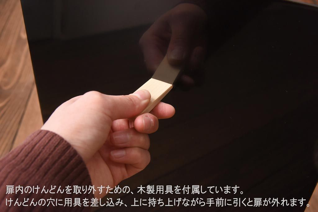 隠しの扉が外しやすいよう、当店で製作した用具を付属しております。8枚目の画像にありますように、用具を穴に挿してお使いください。