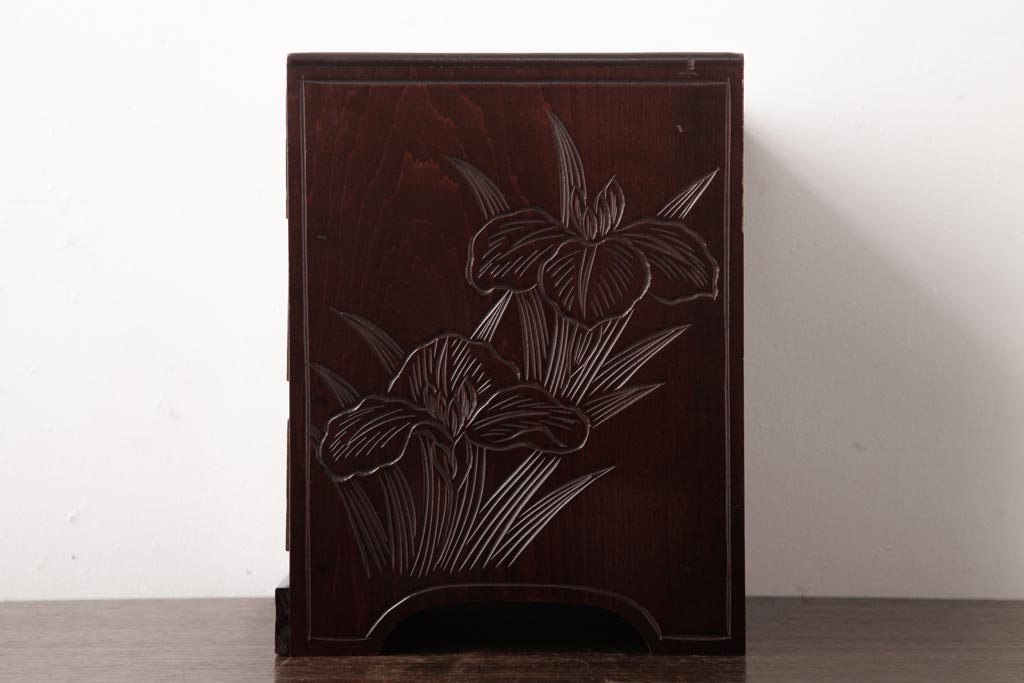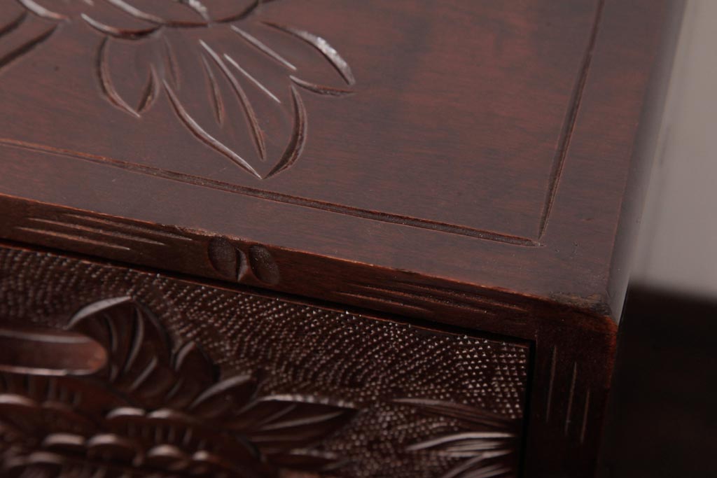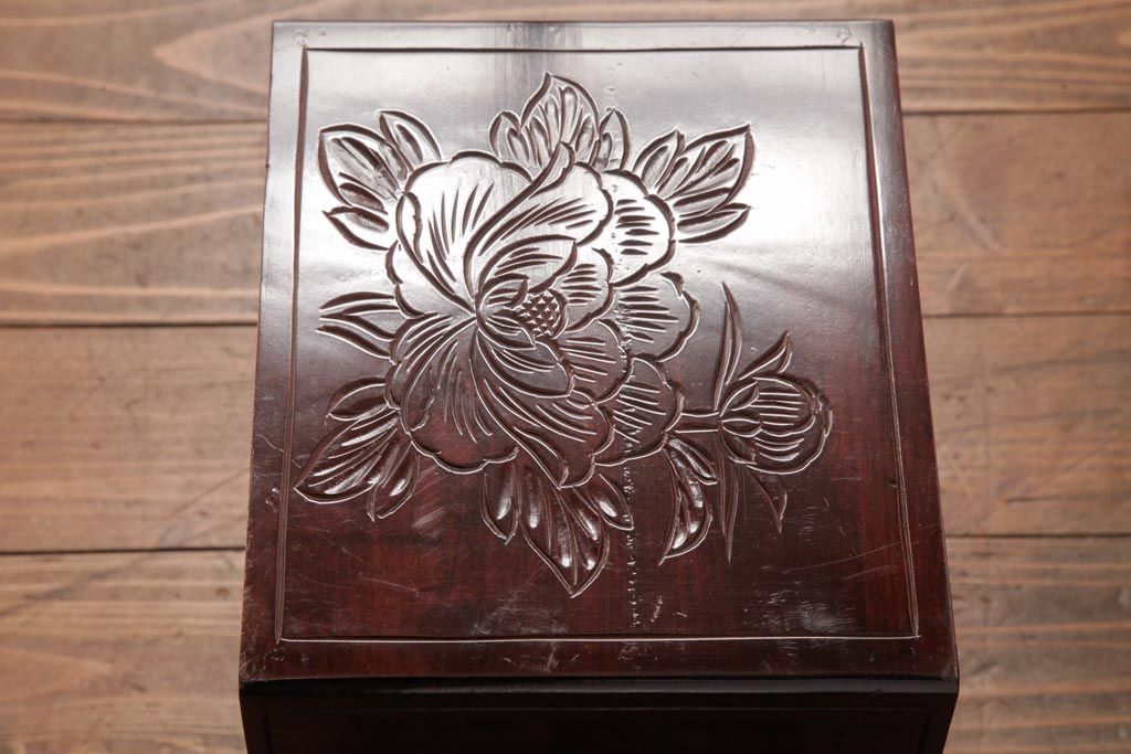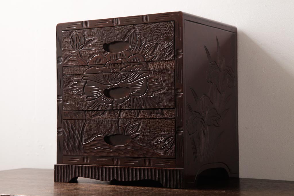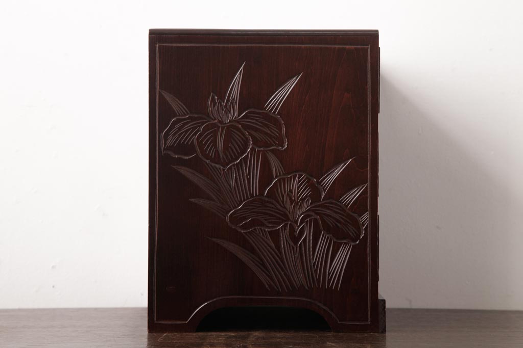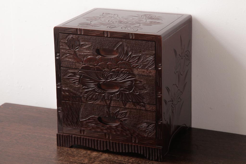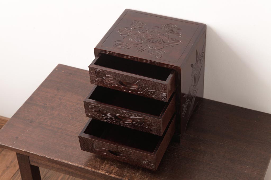 中古 伝統工芸 日光彫り 牡丹・菖蒲 星打ちの意匠が素敵な小引き出し(小物収納)