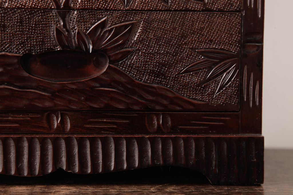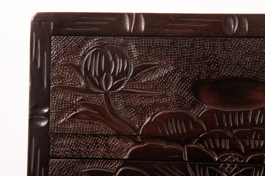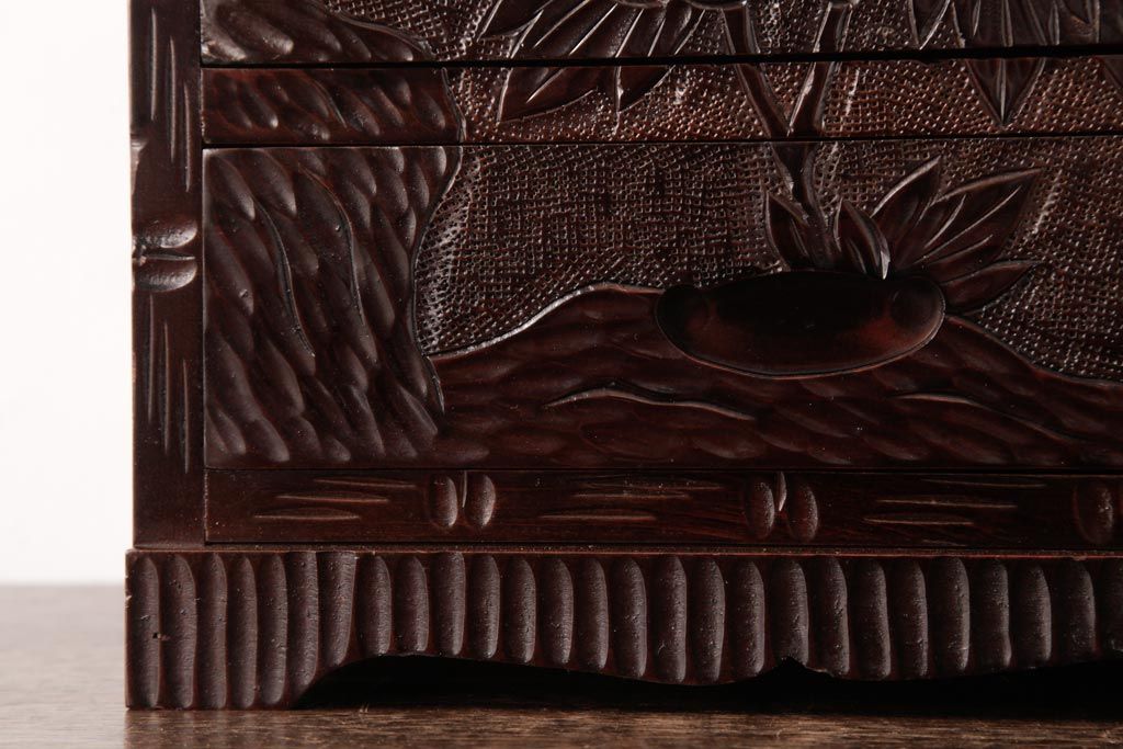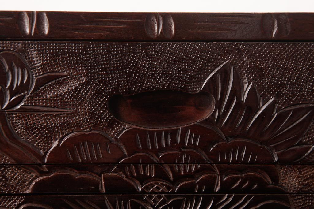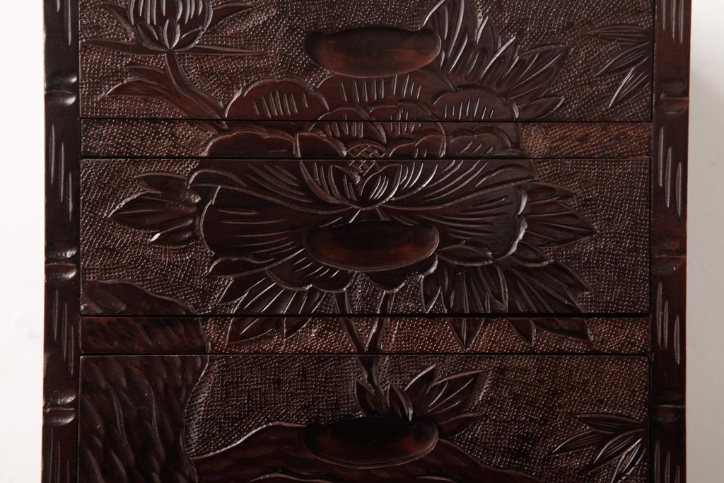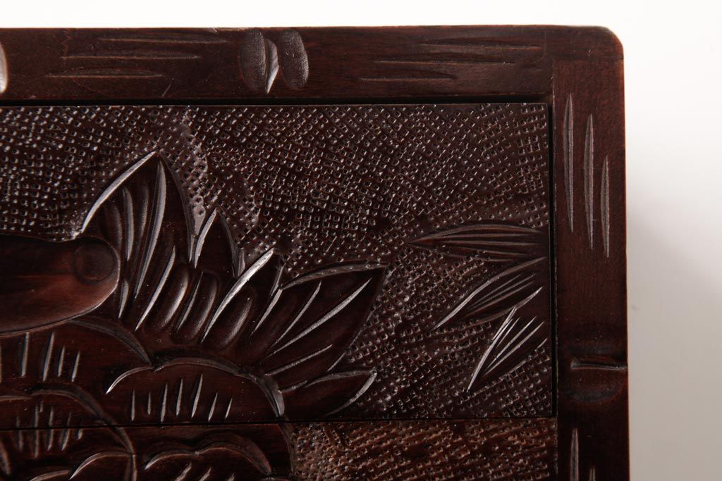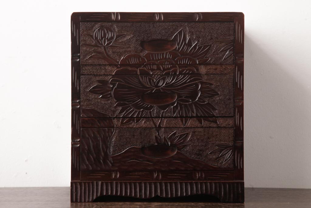 中古 伝統工芸 日光彫り 牡丹・菖蒲 星打ちの意匠が素敵な小引き出し(小物収納)