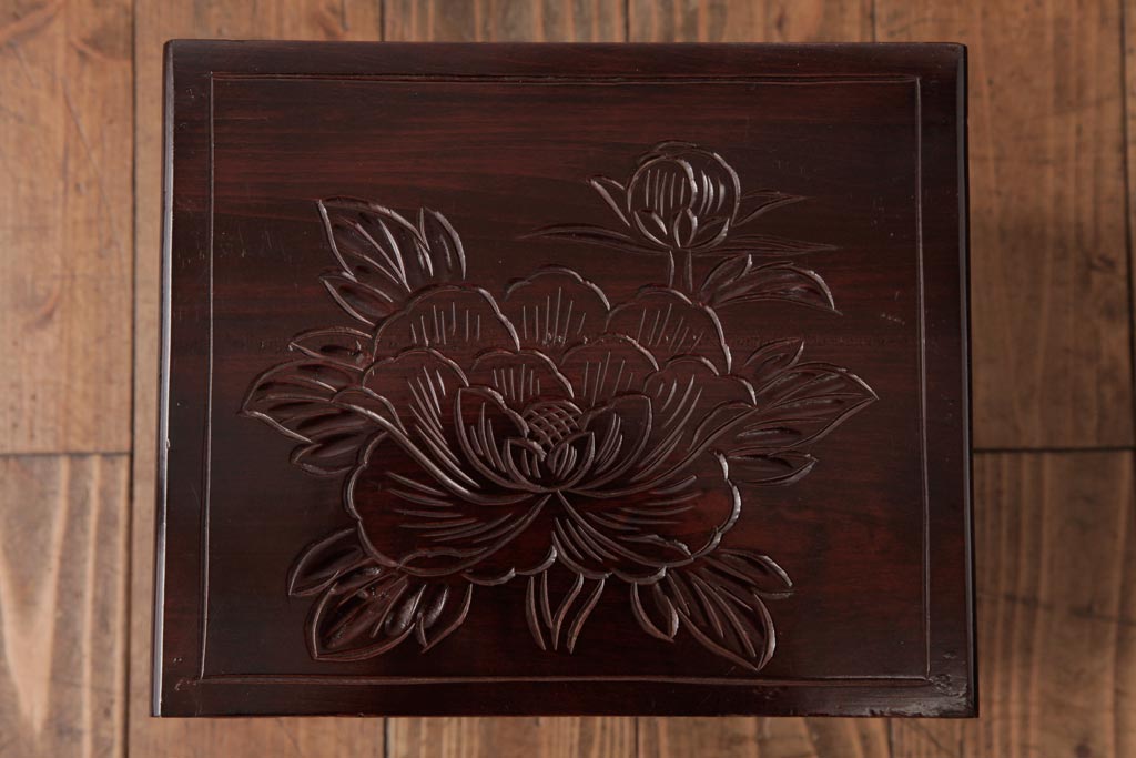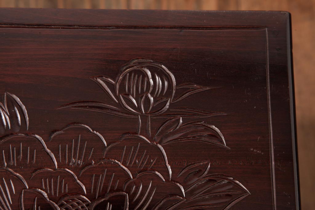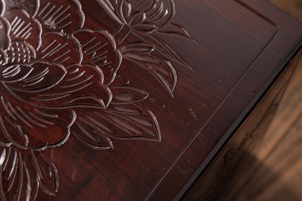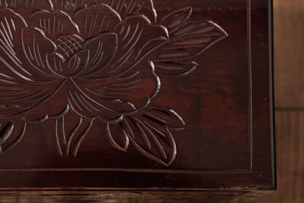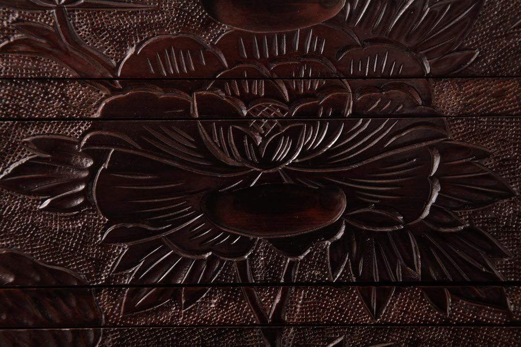 牡丹と菖蒲の彫刻が全面、天板、側面に施されており、