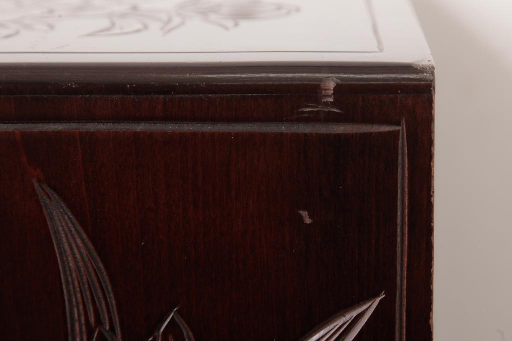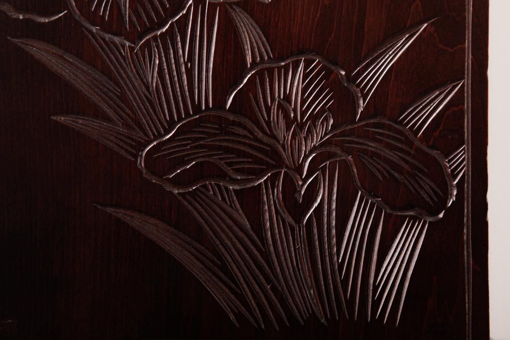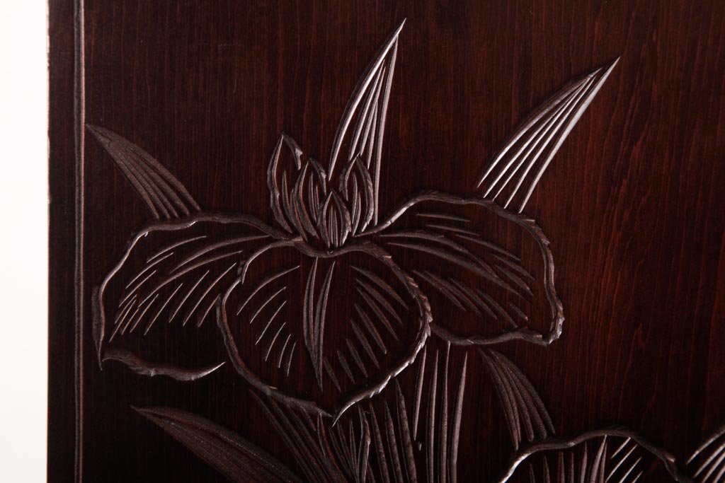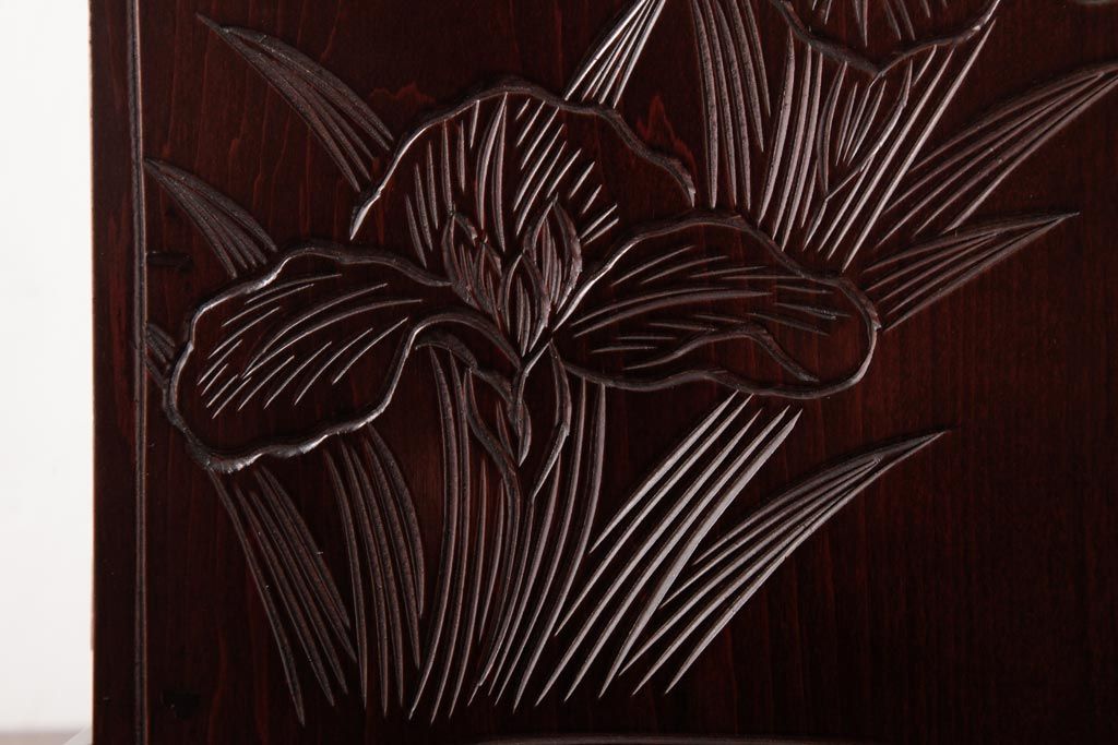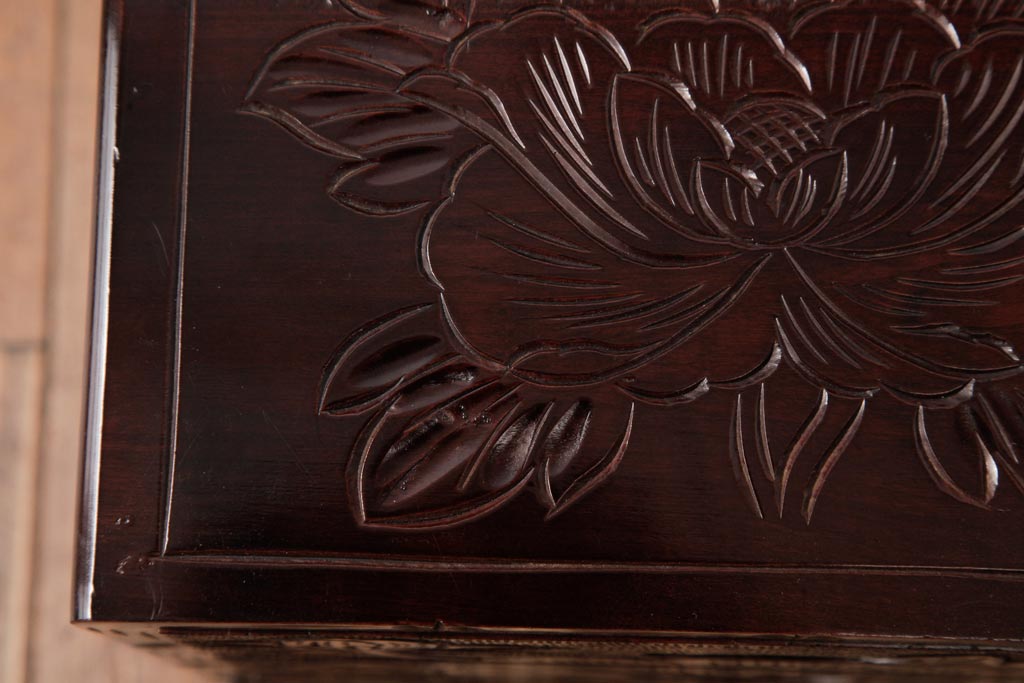 牡丹と菖蒲の彫刻が全面、天板、側面に施されており、