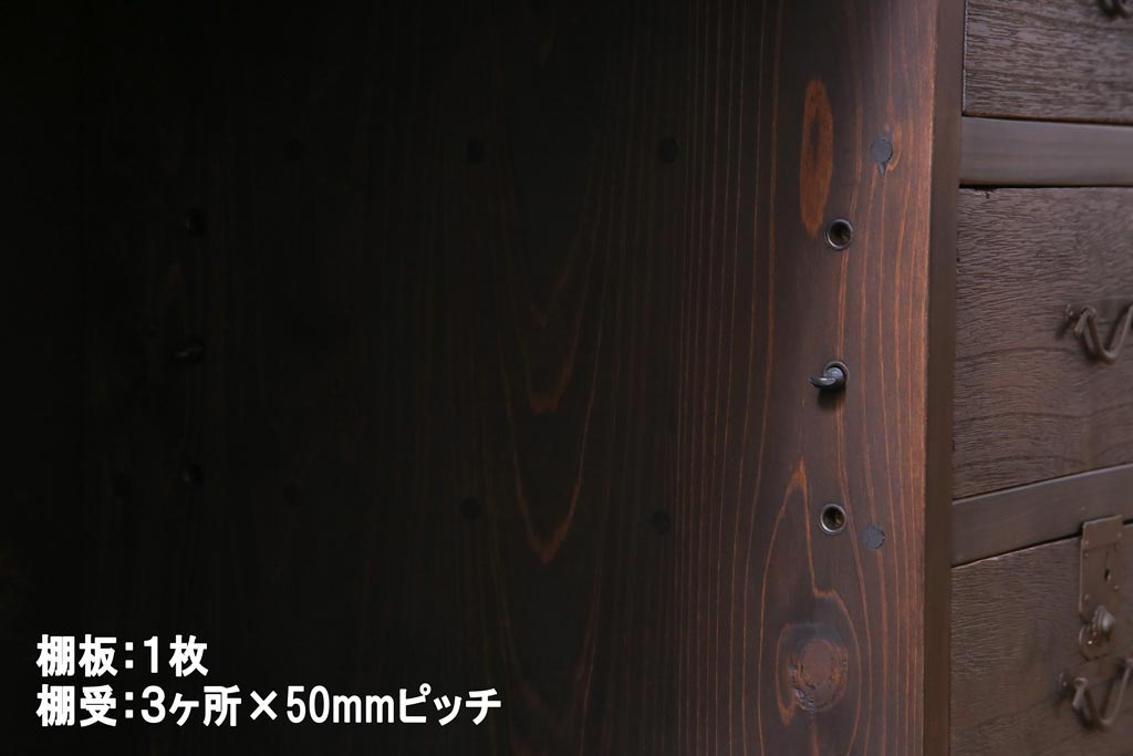 棚板は取り外しできます。棚板は1枚あります。棚受けは3ヶ所、50mmピッチで調整できます。棚幅サイズのものが1枚の作りです。