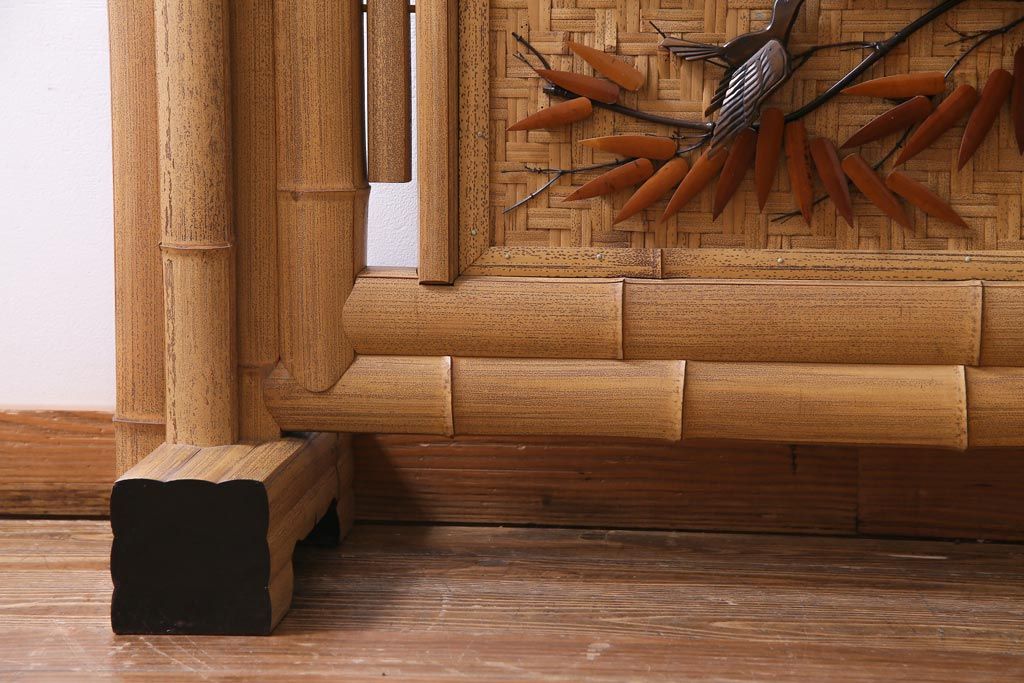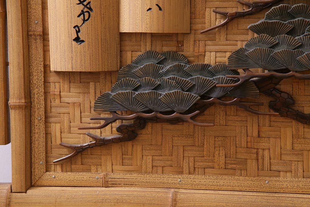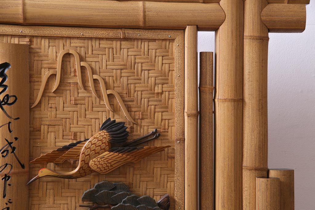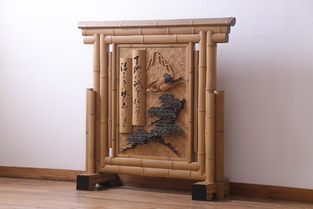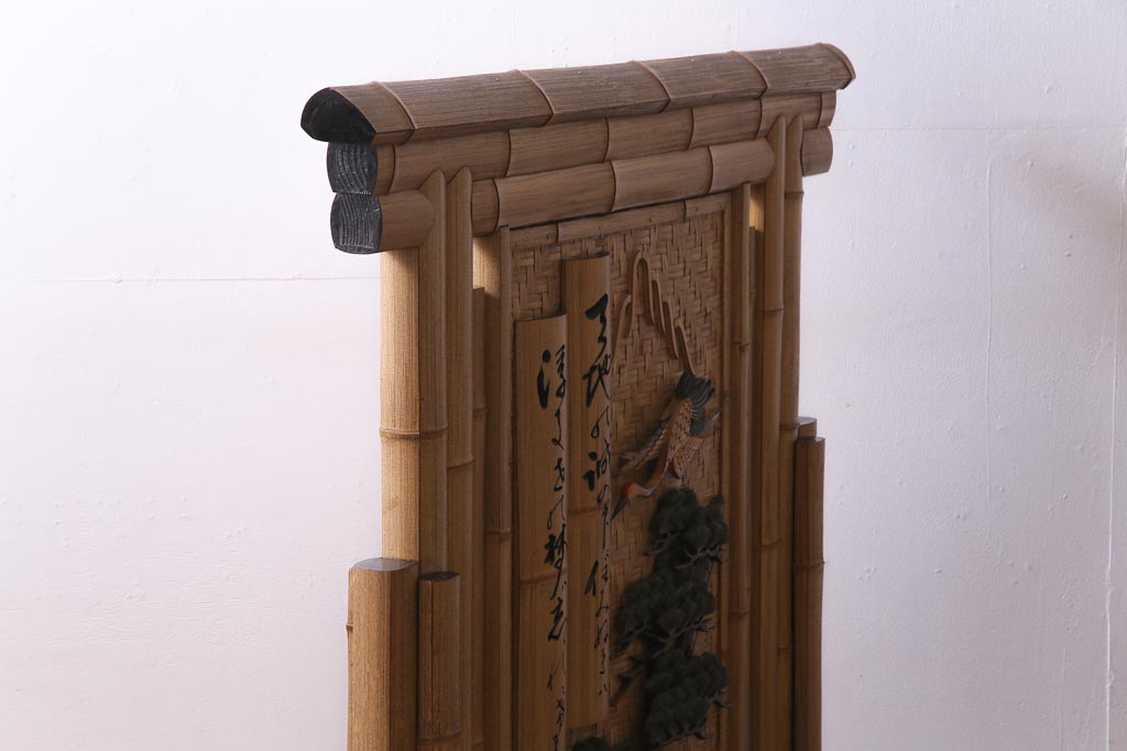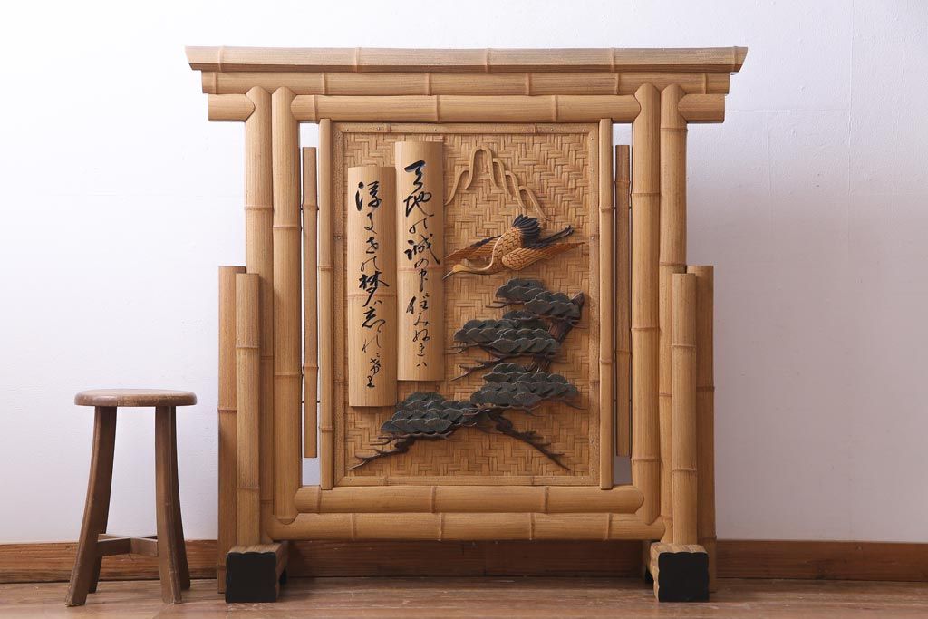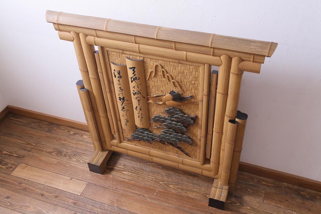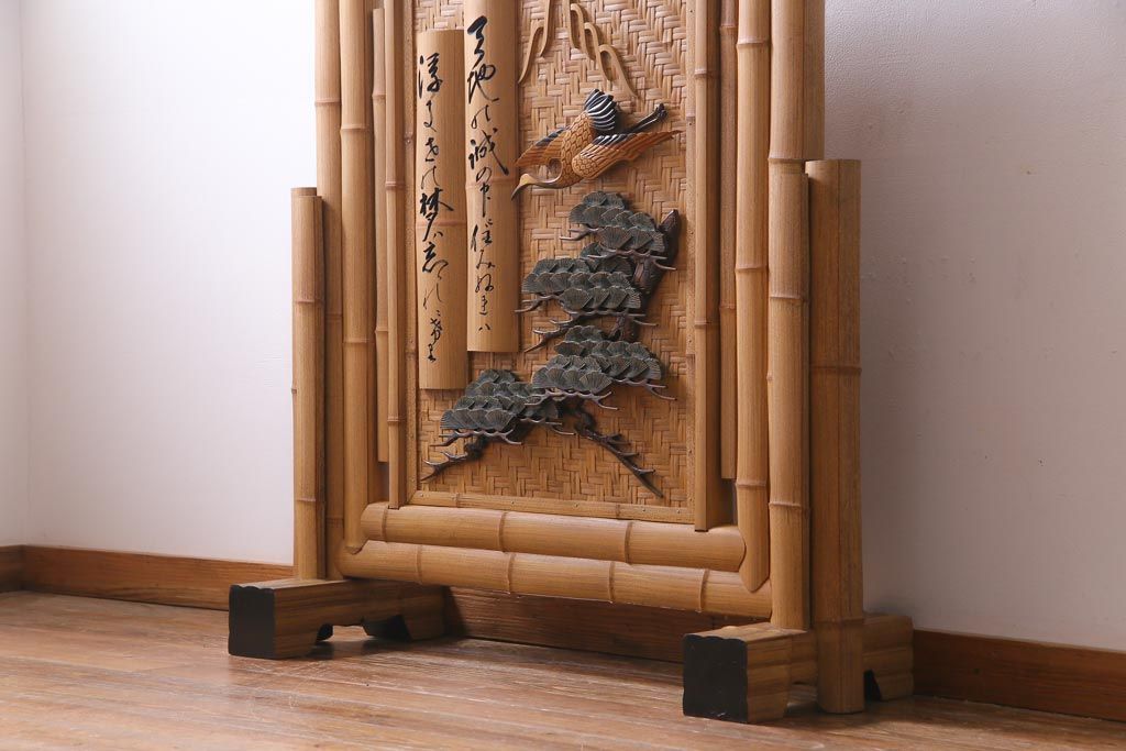 中古 竹細工 鶴・松彫刻 網代編み 立体的な意匠が存在感を放つ衝立(間仕切り、パーテーション)(定価約50万円)(R-035027 )
