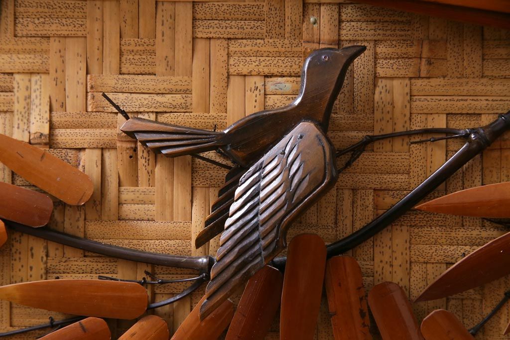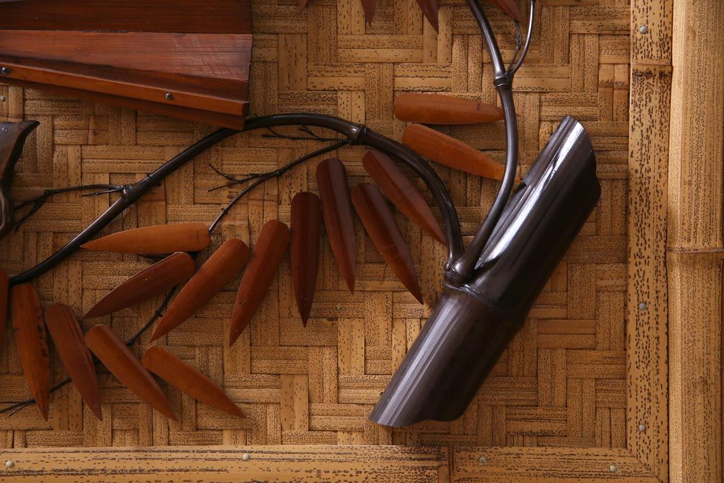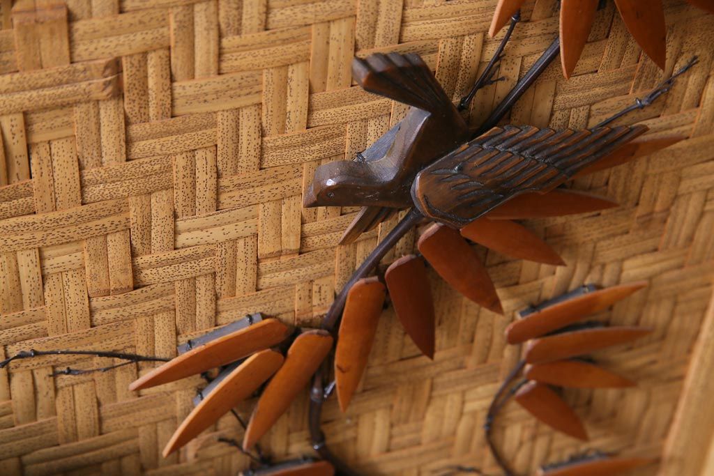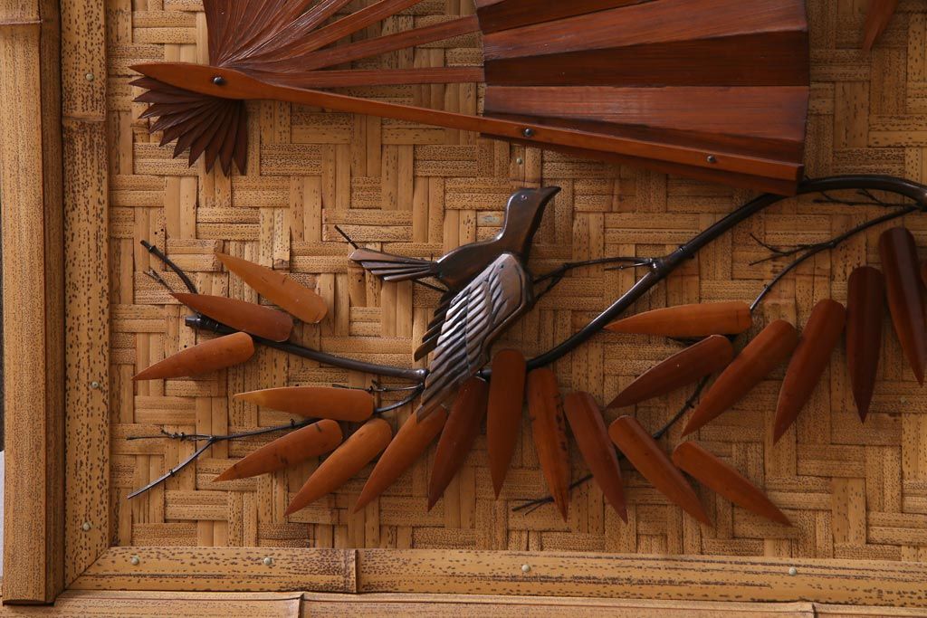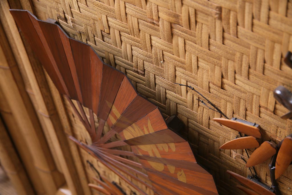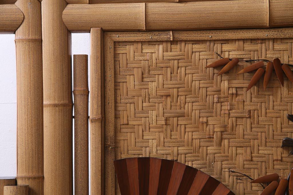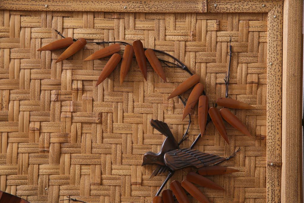 中古 竹細工 鶴・松彫刻 網代編み 立体的な意匠が存在感を放つ衝立(間仕切り、パーテーション)(定価約50万円)(R-035027)です。