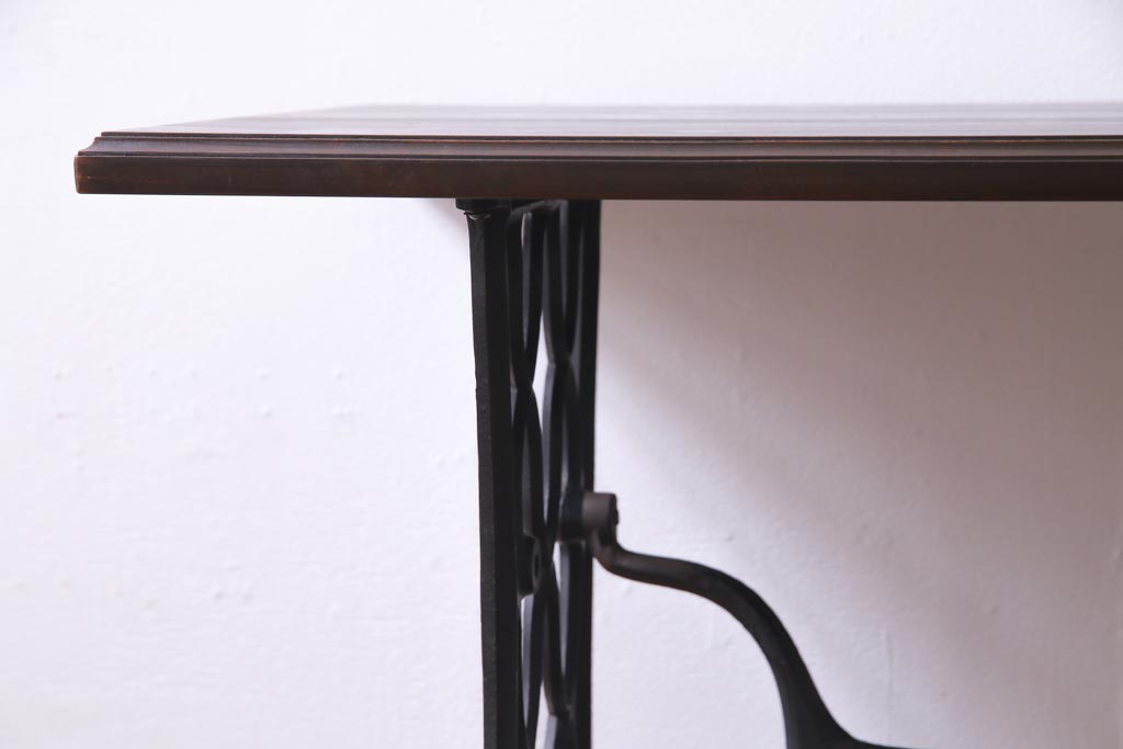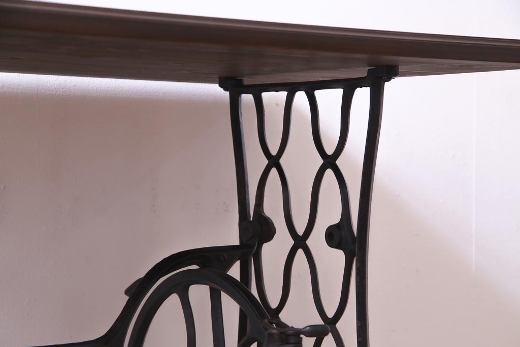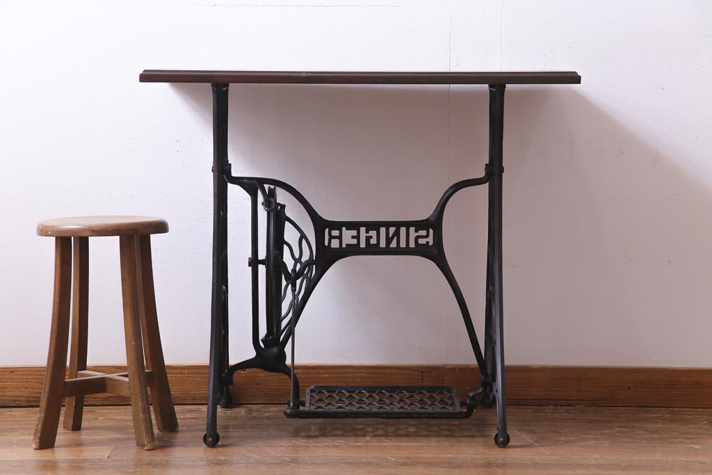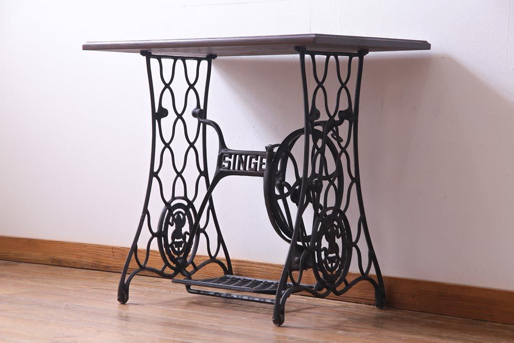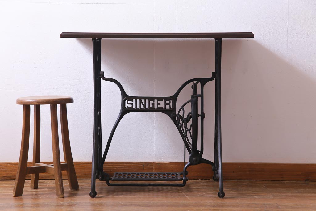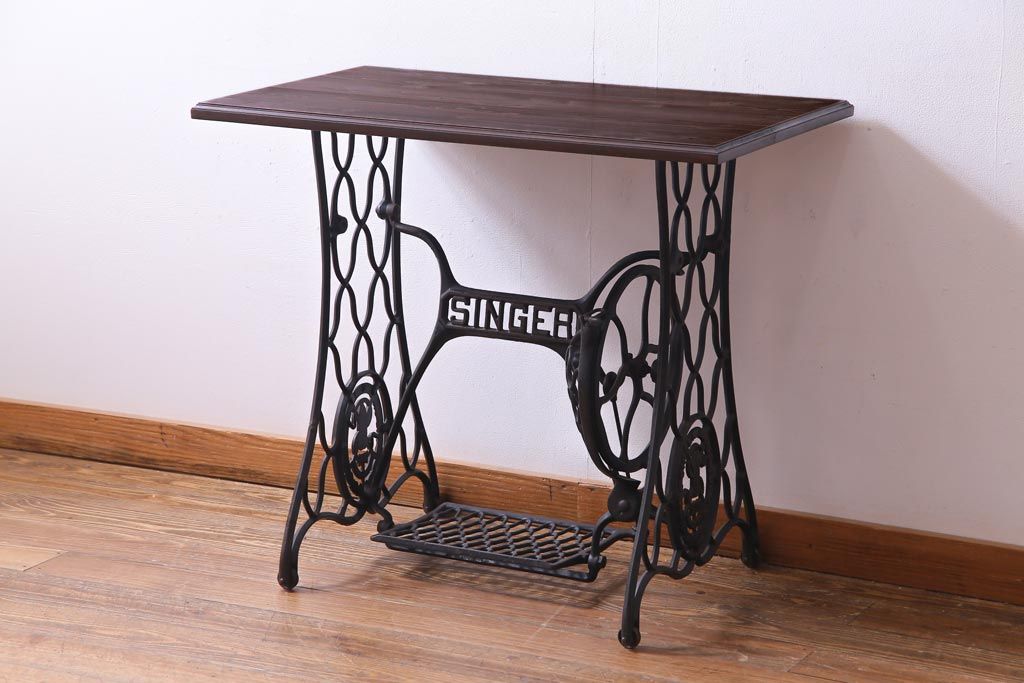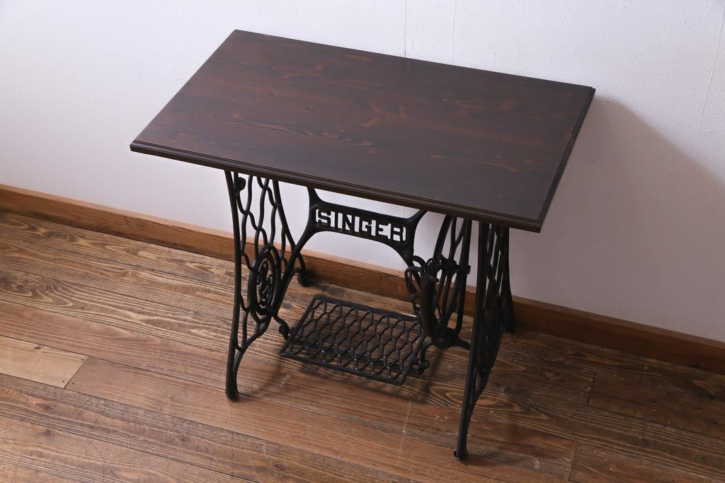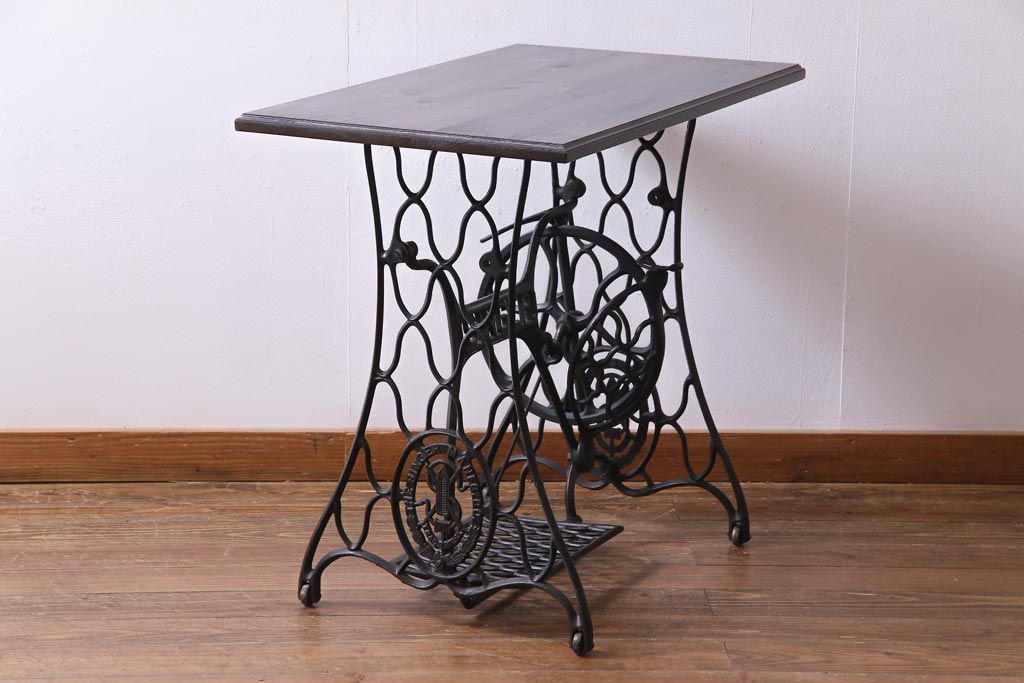 リメイク シンガー社(SINGER) 天板ヒノキ材 お洒落な雰囲気醸し出す鉄脚ミシンテーブル(シンガーミシン、サイドテーブル、カフェテーブル)