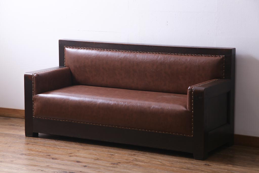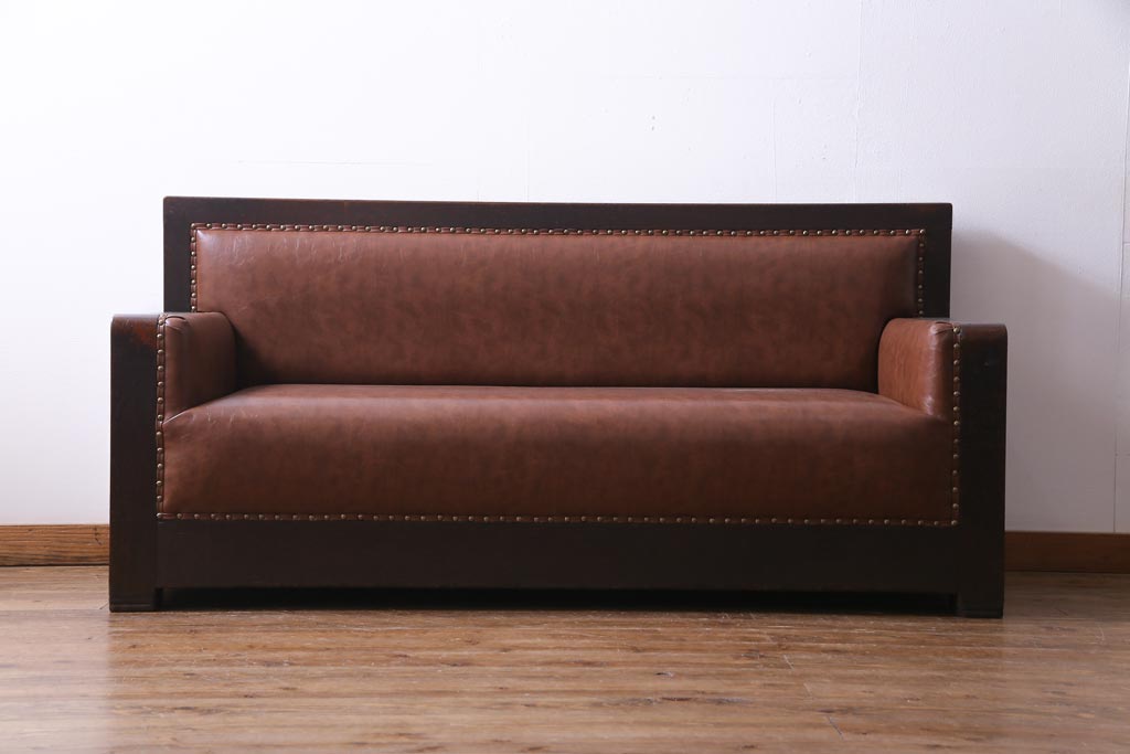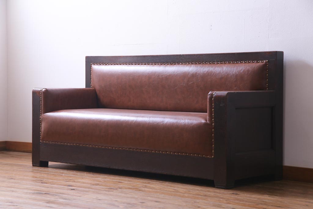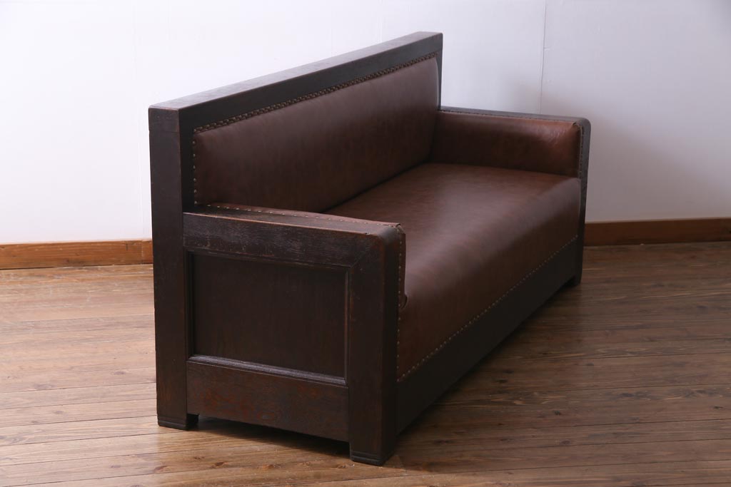 ラフジュ工房> ソファ> 3人掛けソファ > アンティーク家具 和製アンティーク ナラ材 座面合皮 大正浪漫 重厚な佇まいと和洋折衷なデザインがお洒落なソファ