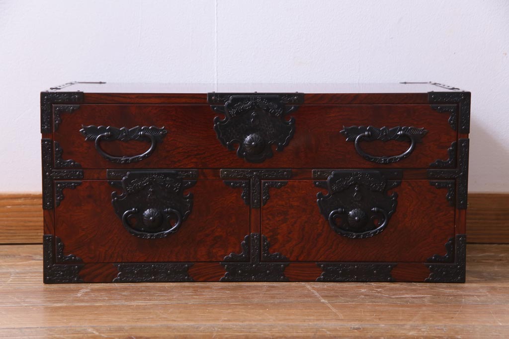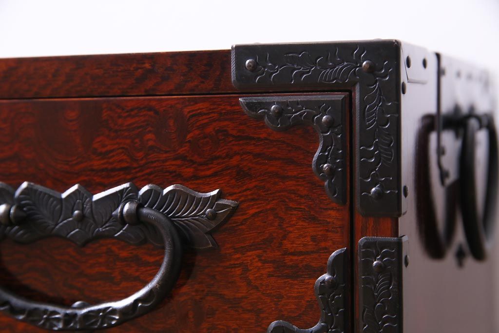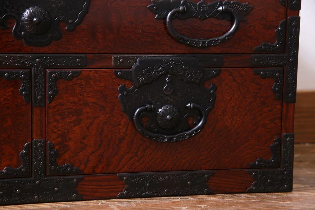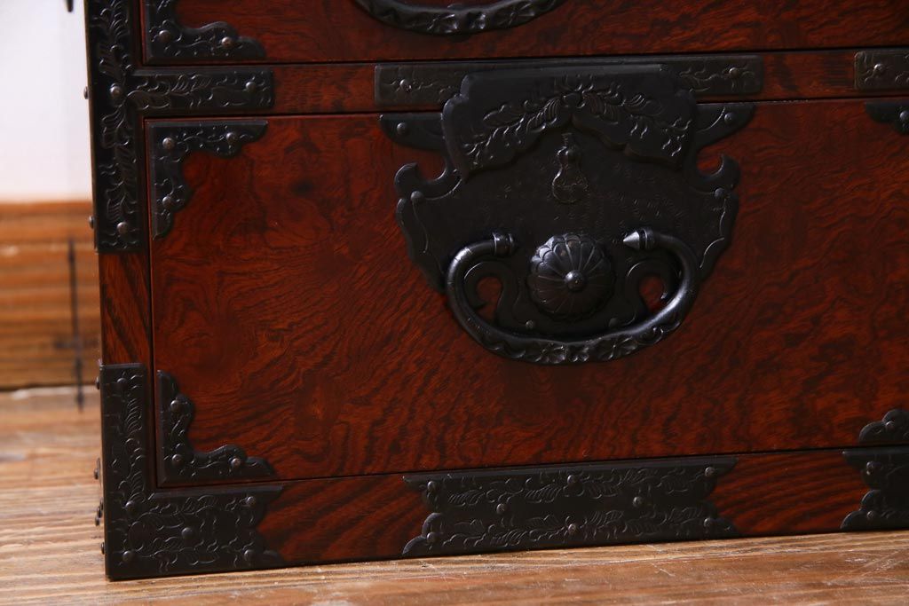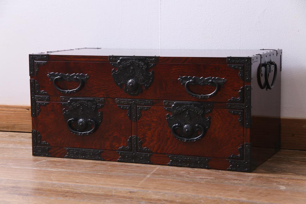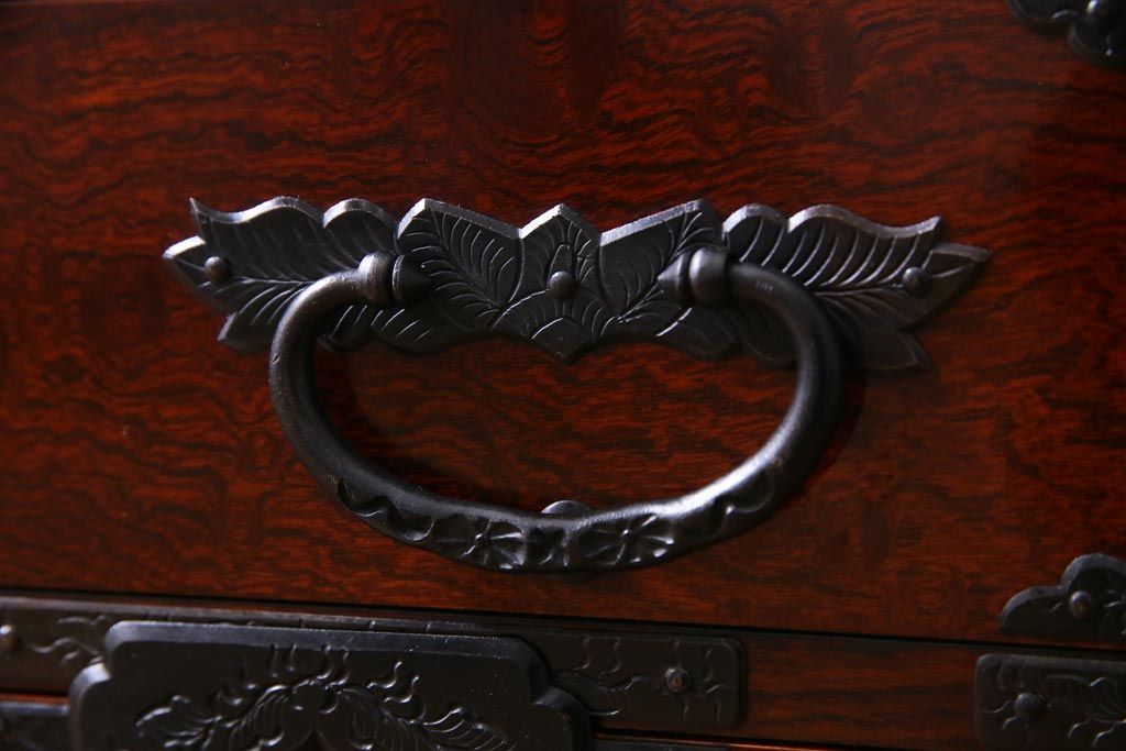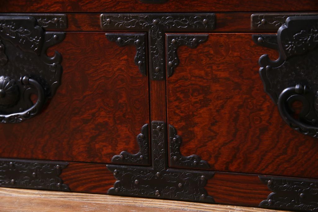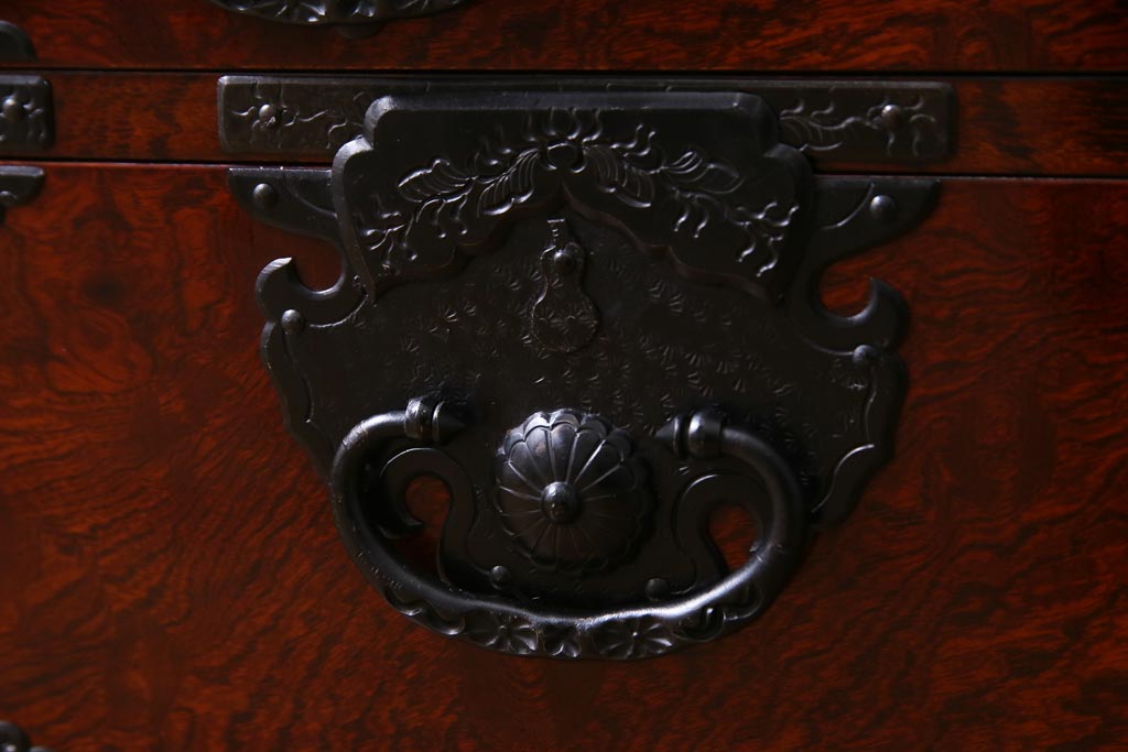 中古 仙台箪笥 熊野洞 ケヤキ材 玉杢 繊細かつ迫力溢れる金具が魅力の整理箪笥(ローボード)